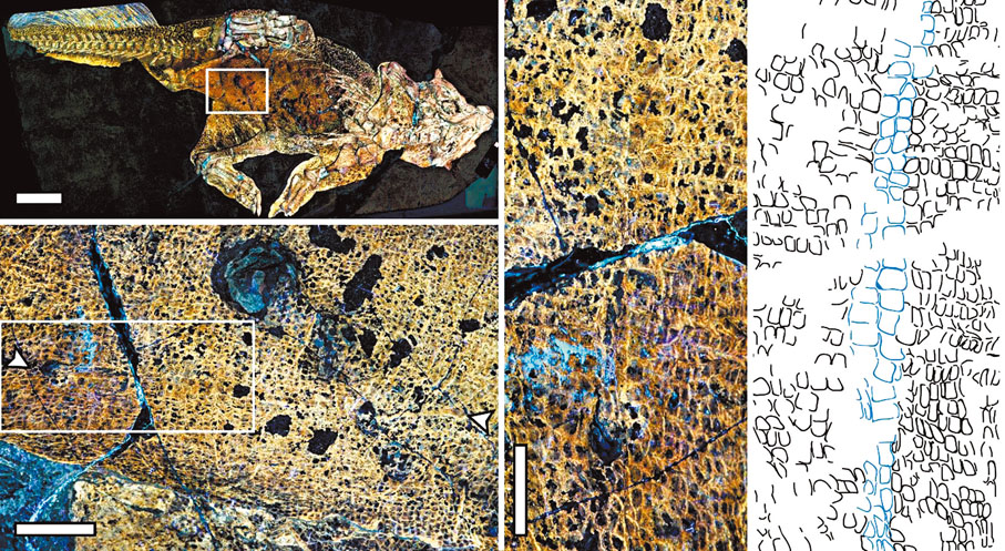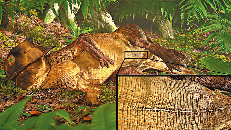 港中大生命科學學院助理教授兼論文的共同通訊作者文嘉棋,利用其研發的鐳射熒光成像(Laser-Stimulated Florescence,簡稱LSF)技術,重新檢視白堊紀時期一隻兩米長、用兩足步行的草食性恐龍鸚鵡嘴龍的皮膚化石,發現了化石上長形的臍部疤痕附近獨特的鱗片,特徵與一些現代蜥蜴及鱷魚有相似之處,這種臍部疤痕亦稱為肚臍。