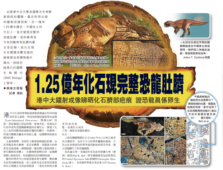 【香港文匯報記者 高鈺】由香港中文大學及國際古生物學家組成的團隊,最近利用尖端的鐳射成像技術,在一塊有1.25億年歷史、中國出土的化石上,首次發現完整的恐龍肚臍,是科學界至今找到動物有肚臍的最古老紀錄。該化石現正在德國法蘭克福的森根堡自然博物館中展出,而研究結果已於國際生物期刊《BMC Biology》上發布。