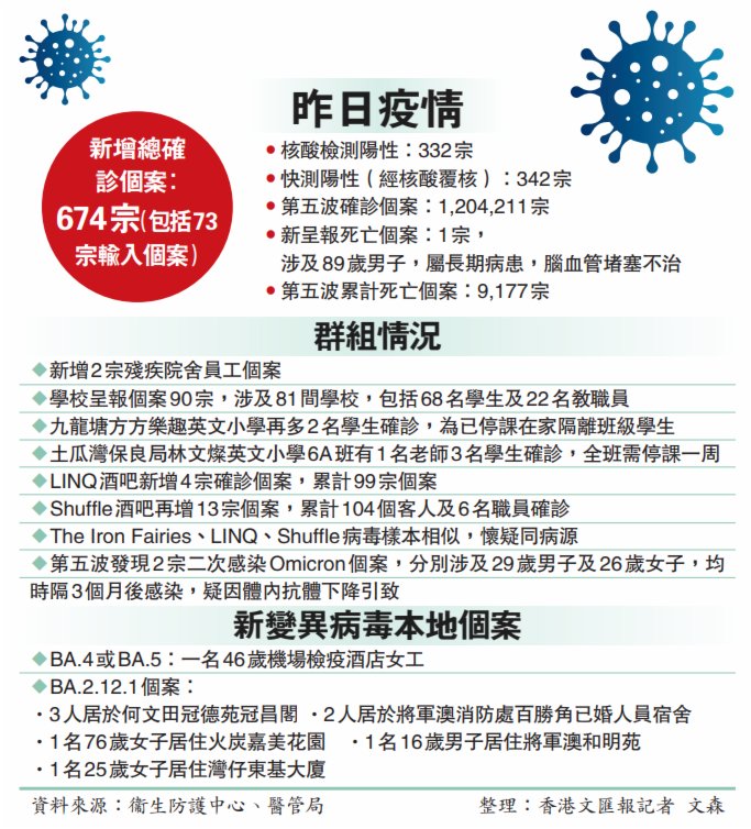 (香港文匯報 記者 文森)香港新冠肺炎疫情反覆,昨日新增確診個案多達674宗(包括73宗輸入個案),是自4月18日以來最多。衞生防護中心首次發現,有兩名患者於第五波疫情期間,相隔3個月內先後兩次感染新冠病毒,其中一人更一再感染BA.2.2病毒;有900多名市民於首四波疫情曾確診,第五波疫情再次中招。防護中心推算,7.5%首四波確診者會在第五波「二次感染」,原因是患者體內抗體隨時間下降而再次受感染,呼籲康復者盡快接種足夠的疫苗。