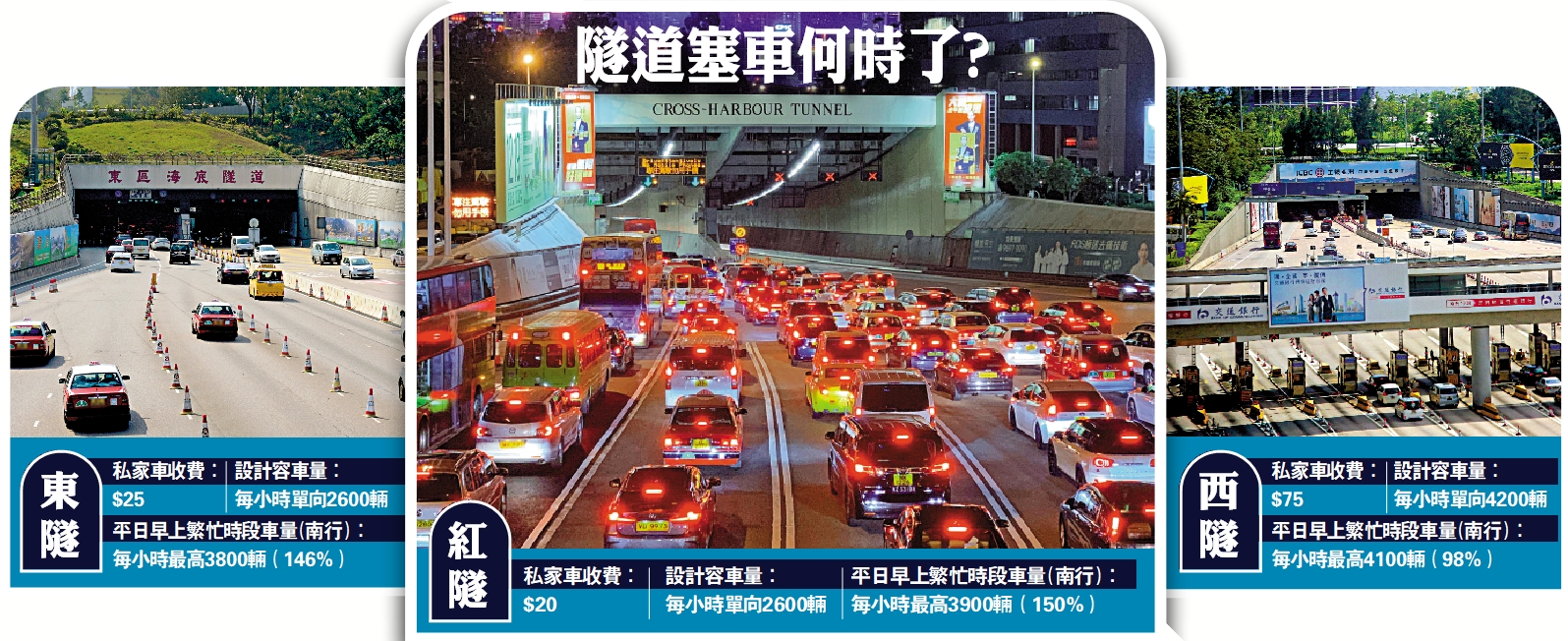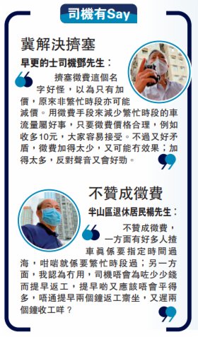 運輸署解決過海隧道塞車問題的最新計劃昨日出爐,惟坊間討論多年的電子道路收費系統等方案依然落空,暫時先在三條過海隧道推行「擠塞徵費」。按該「過海隧道擠塞徵費的原則和西區海底隧道的接收安排」文件所述,重點之一在於因應隧道不同時段的擠塞情況收取不同費用,以遏抑和分散繁忙時段超額的交通需求。