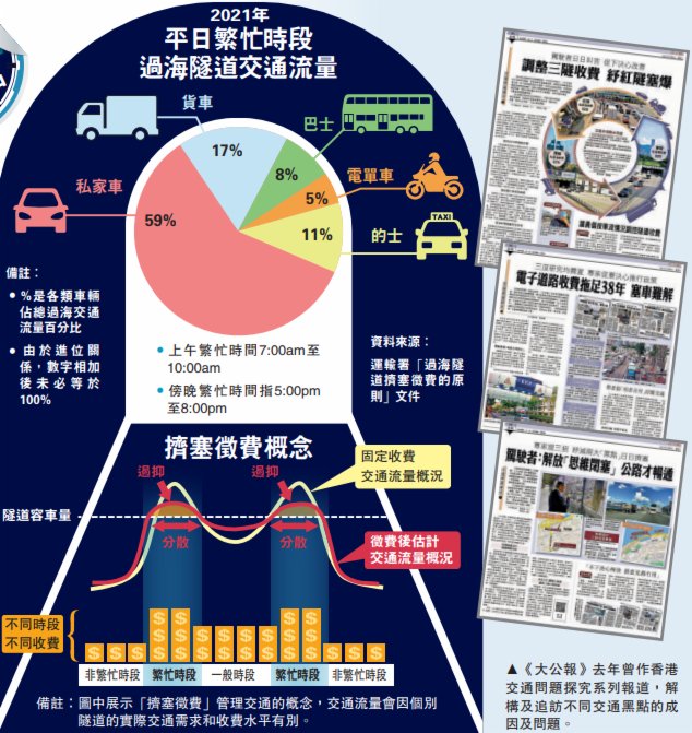 據了解,運輸署早已於2019年7月展開「擠塞徵費」研究,着重先解決三條過海隧道擠塞情況,現階段不會考慮推行至其他收費隧道或特別擠塞的路段。「過海隧道擠塞徵費的原則」文件內的整體過海交通數據,取自去年第四季部分時間段(2021年9月底至12月)的交通調查。