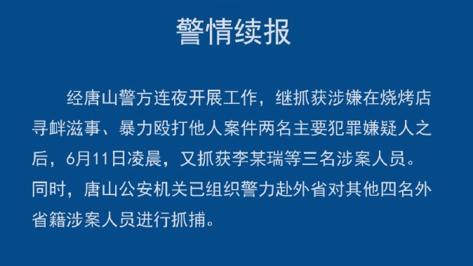 據唐山市公安局路北分局消息,經唐山警方連夜開展工作,繼抓獲涉嫌在燒烤店尋釁滋事、暴力毆打他人案件兩名主要犯罪嫌疑人之後,6月11日凌晨,又抓獲李某瑞等三名涉案人員。同時,唐山公安機關已組織警力赴外省對其他四名外省籍涉案人員進行抓捕。