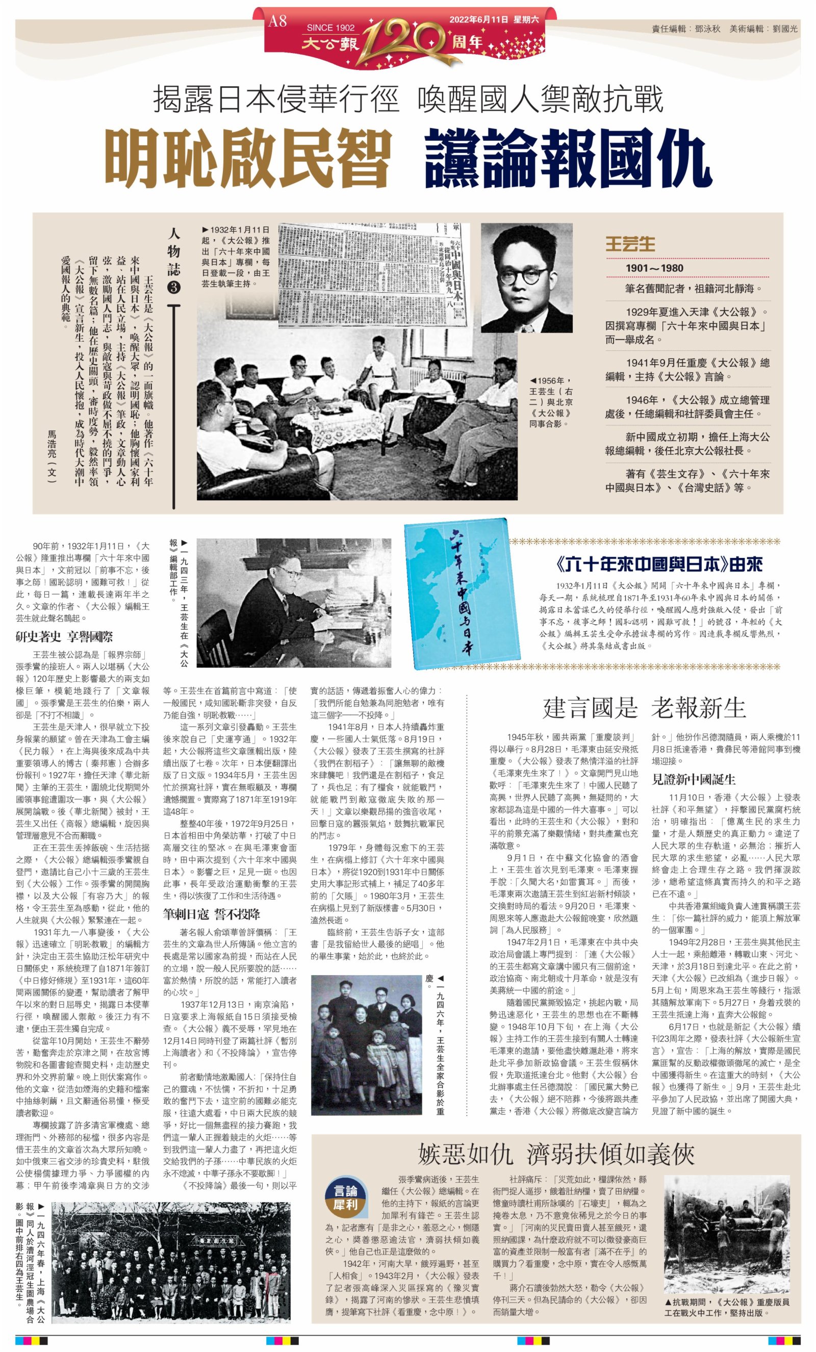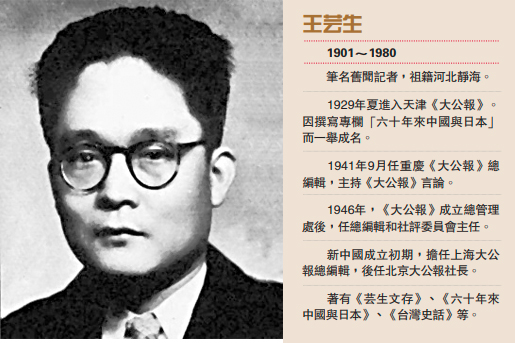 王芸生是《大公報》的一面旗幟。他著作《六十年來中國與日本》,喚醒大眾,認明國恥;他胸懷國家利益、站在人民立場,主持《大公報》筆政,文章動人心弦,激勵國人鬥志,與敵寇與苛政做不屈不撓的鬥爭,留下無數名篇;他在歷史關頭,審時度勢,毅然率領《大公報》宣言新生,投入人民懷抱,成為時代大潮中愛國報人的典範。