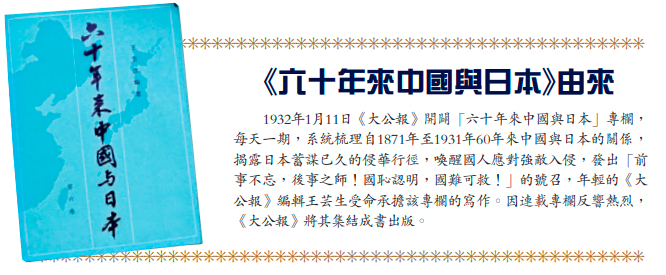 90年前,1932年1月11日,《大公報》隆重推出專欄「六十年來中國與日本」,文前冠以「前事不忘,後事之師!國恥認明,國難可救!」從此,每日一篇,連載長達兩年半之久。文章的作者、《大公報》編輯王芸生就此聲名鵲起。