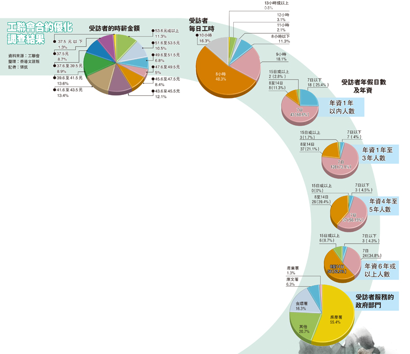 但同時,有四成受訪工友每日需工作9小時及以上。約一成受訪者透露勞工假無糧出、約兩成人不知道勞工假日有糧出。在年假方面,《僱傭條例》規定首、次年的有薪年假日數為7天,翌年起可由8天逐年遞增至最多14天,但調查指年假有8天以上的受訪者只有約三成。近四成受訪者不知在八號風球開工應獲1.5倍工資,知道但未領取過的亦有27%。