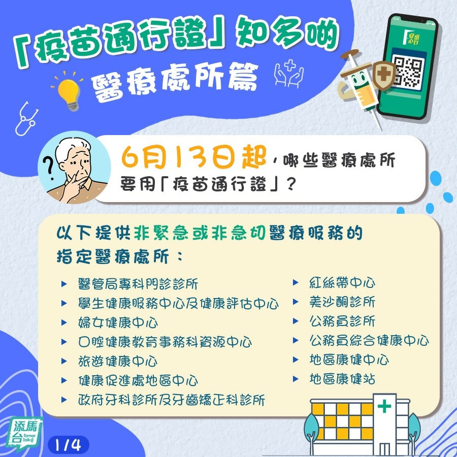 大公文匯全媒體報道,食物及衞生局、衞生署及醫院管理局轄下的指定醫療處所,將於明日(13日)起實施「疫苗通行證」,包括醫管局專科門診診所、學生健康服務中心及健康評估中心、婦女健康中心、地區康健中心等13類處所。