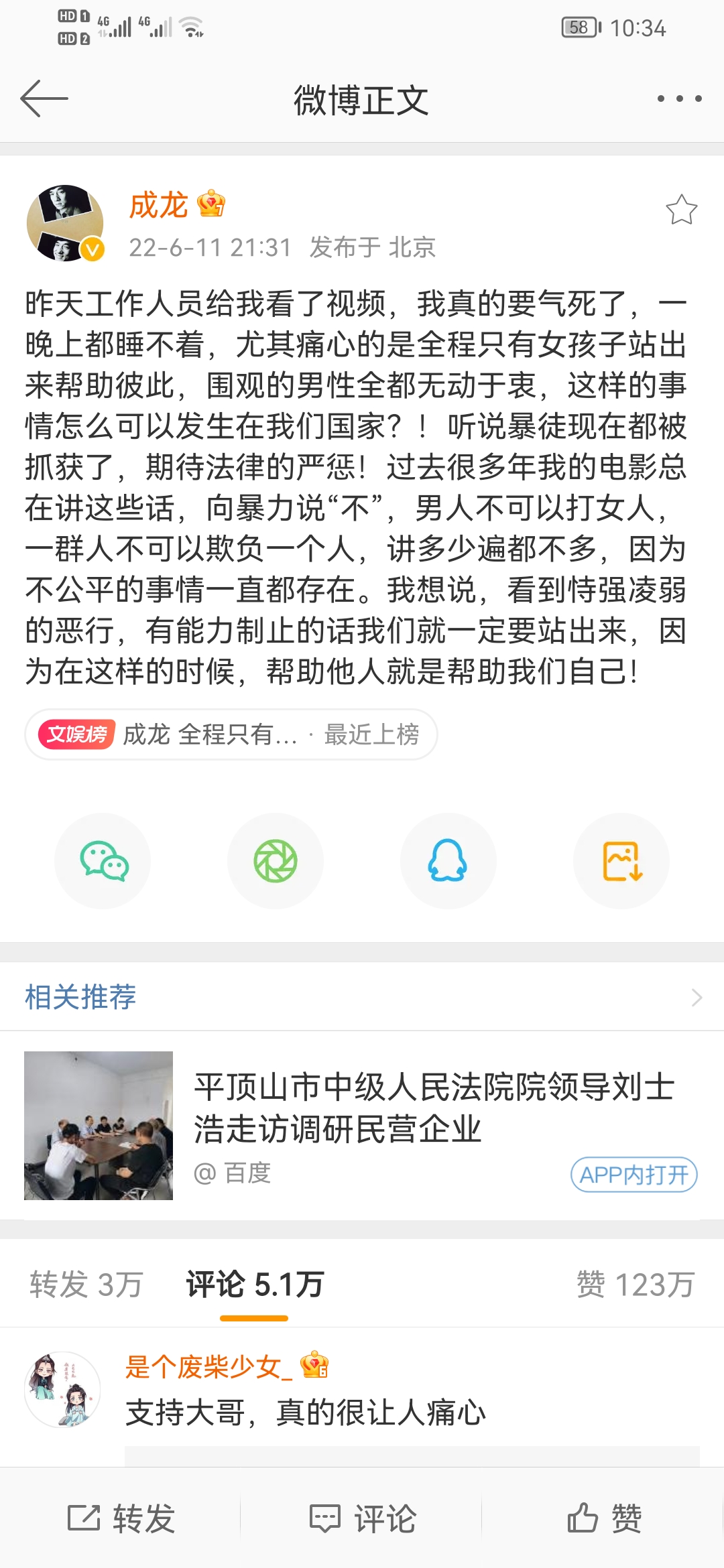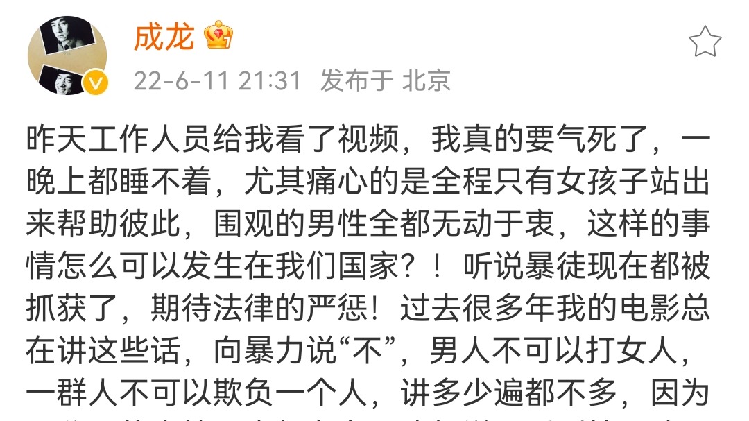 成龍於11晚九點半發布微博消息,並對「全程只有女孩子幫助彼此」表示痛心。他在微博說:昨天工作人員給我看了視頻,我真的要氣死了,一晚上都睡不着,尤其痛心的是全程只有女孩子站出來幫助彼此,圍觀的男性全都無動於衷,這樣的事情怎麼可以發生在我們國家?!聽說暴徒現在都被抓獲了,期待法律的嚴懲!過去很多年我的電影總在講這些話,向暴力說「不」,男人不可以打女人,一群人不可以欺負一個人,講多少遍都不多,因為不公平的事情一直都存在。我想說,看到恃強凌弱的惡行,有能力制止的話我們就一定要站出來,因為在這樣的時候,幫助他人就是幫助我們自己!