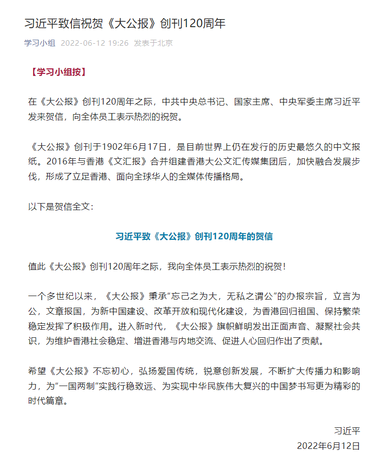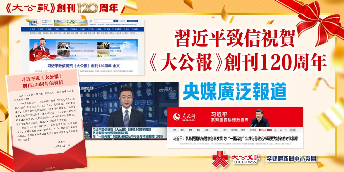 習近平致信祝賀《大公報》創刊120周年的消息,在央媒中廣泛報道。今日的央視新聞聯播頭條,以1分30秒的時長報道了這一重要消息。新華社在時政欄目播發通稿,報道了習近平致信祝賀《大公報》創刊120周年的消息及賀信全文,新華社還專門製作賀信海報予以重點報道。