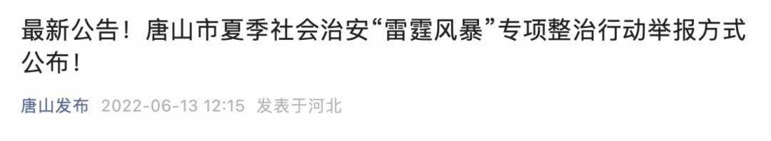 據唐山發布:自6月12日起,唐山在全市開展夏季社會治安整治「雷霆風暴」專項行動。現將專項行動舉報內容、舉報方式、舉報須知公告如下: