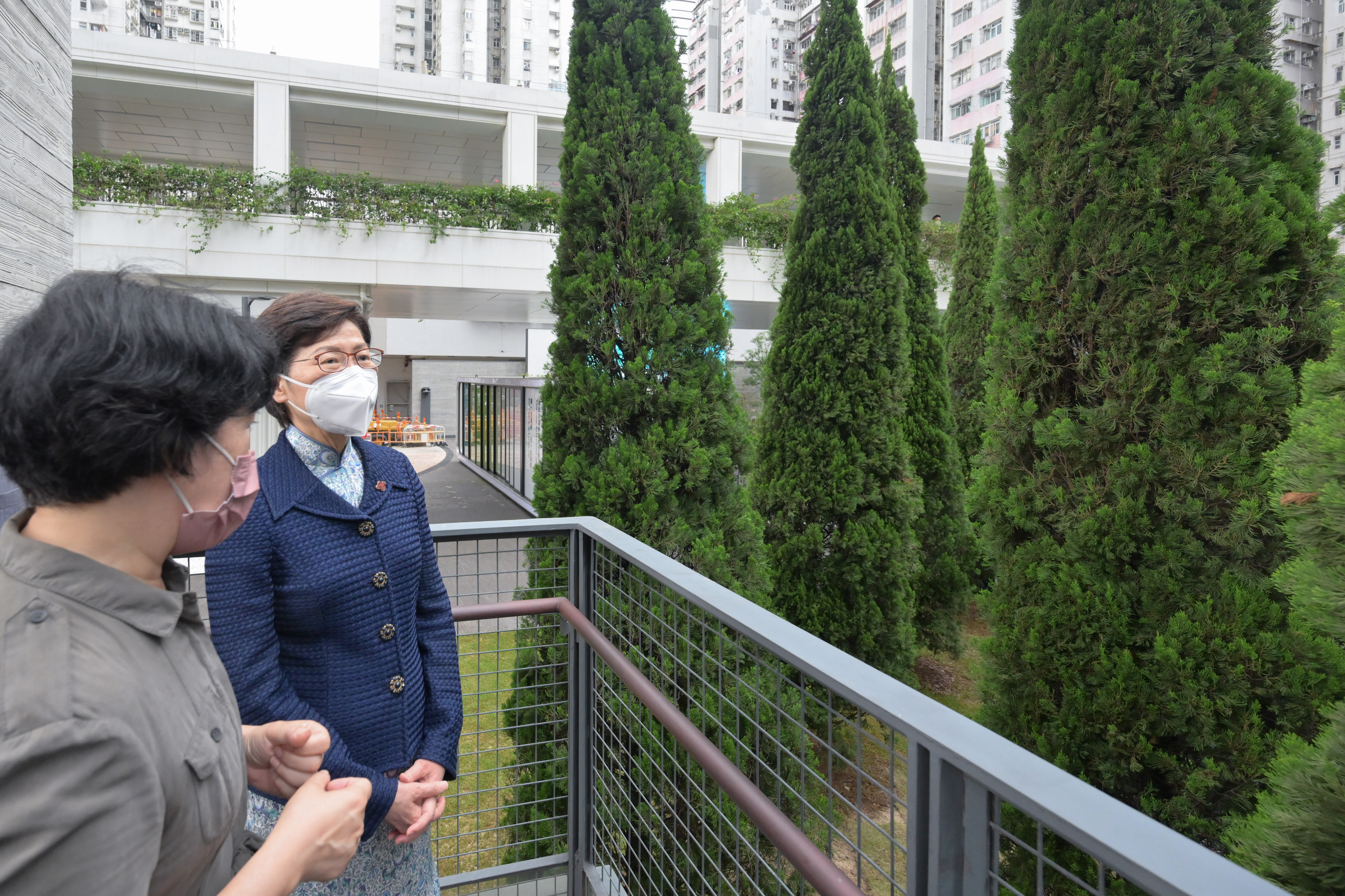 林鄭在康文署署長劉明光陪同下,參觀油街實現內不同項目,包括兩個慶祝香港特別行政區成立25周年的展覽,分別是由多棵龍柏樹組成的「賞森·悅木」和結合藝術與科技以展示翻騰巨浪和藍鯨暢泳的「新域混影」,亦聽取油街實現自2019年起進行擴展計劃的介紹及5月下旬開放後的運作情況。