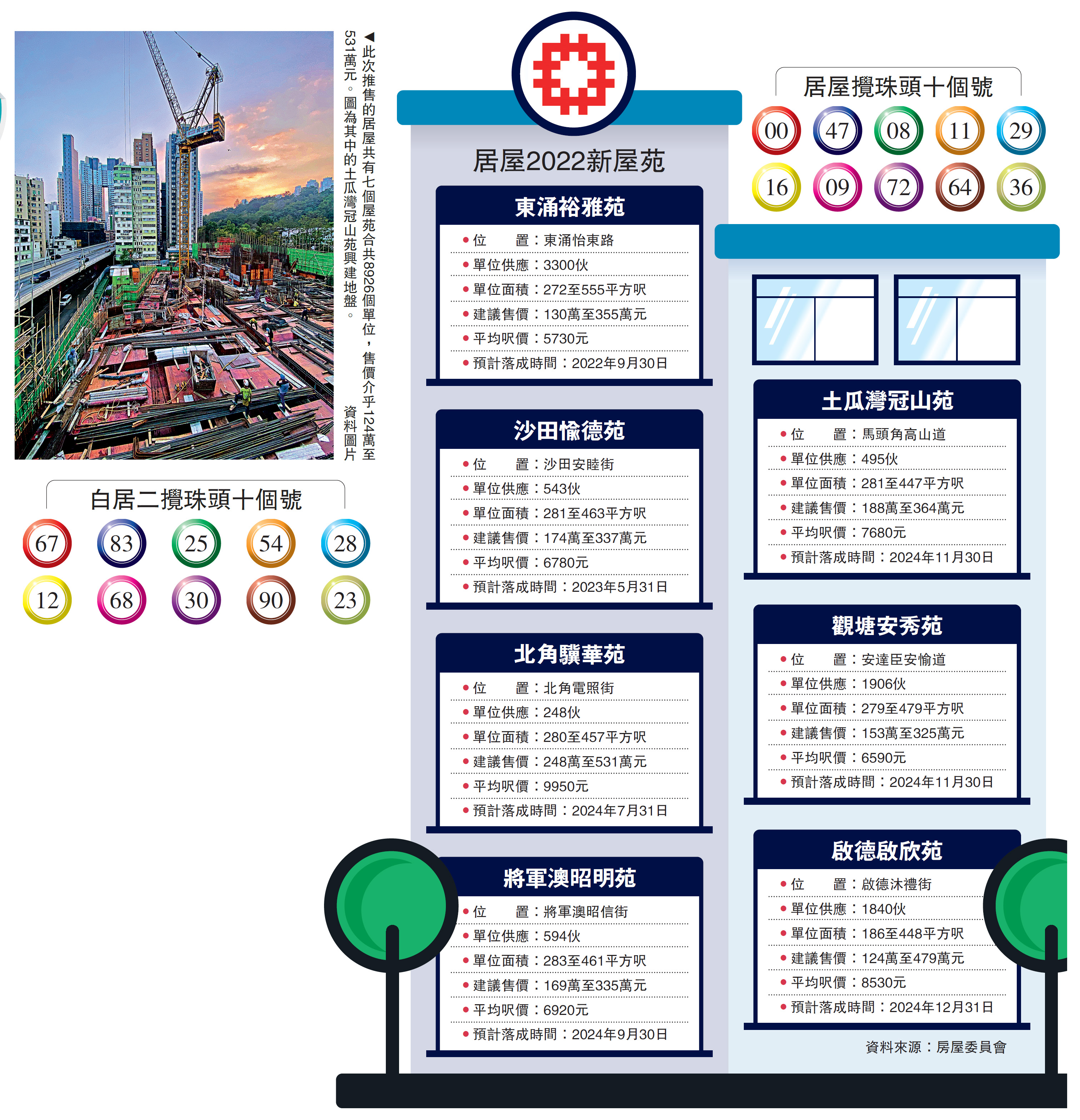 今期居屋有七個新屋苑,包括東涌裕雅苑、沙田愉德苑、北角驥華苑、馬頭角冠山苑、觀塘安秀苑、將軍澳昭明苑、啟德啟欣苑,合共提供8926個單位,將以市價五一折出售,售價介乎124萬至531萬元。