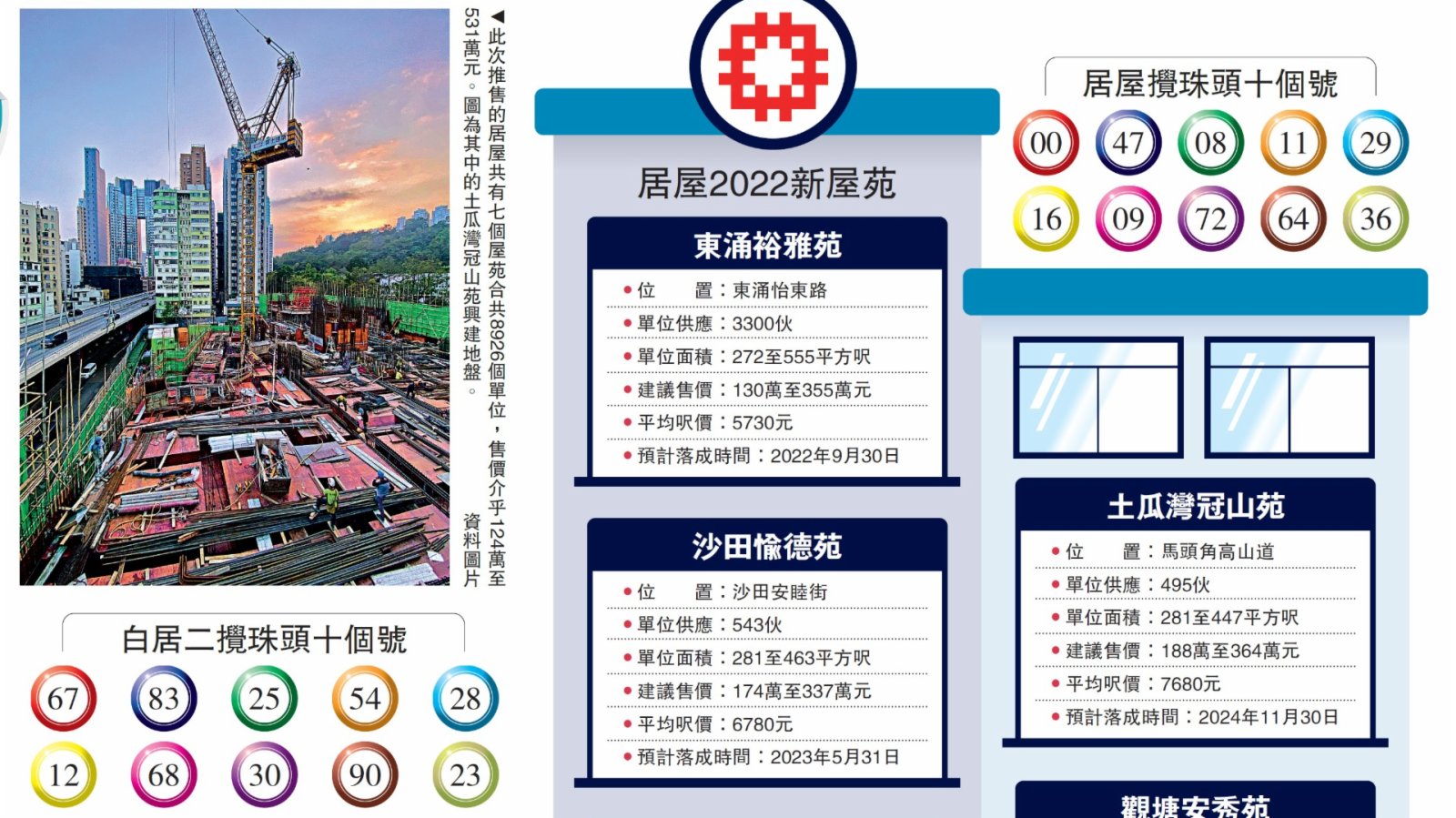 因應疫情,房委會昨日在網上直播新一期居屋及「白居二」攪珠,決定申請者揀樓先後次序。按申請編號最後兩個數字,居屋首五個號碼依次是00、47、08、11、29;「白居二」首五個號碼結果依次是67、83、25、54、28。