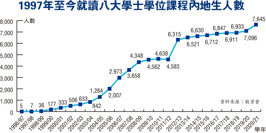 (香港文匯報 記者 詹漢基)香港回歸祖國25年來,香港的大學吸納了一批又一批高水平的內地尖子,在兩地人才交流及培育方面扮演了重要角色。1998年,透過賽馬會獎學金試驗計劃,香港開始有系統地招攬優秀的內地本科生。2003年,國家教育部首次批准港校於內地自主招生,香港非本地生政策亦逐步放寬,更掀起了一陣「港校熱」。時至今日,香港八間大學的內地本科生已增至超過7,000人的規模,是1997年僅得個位數的逾千倍。