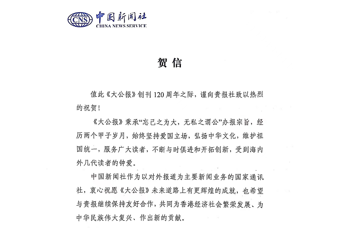 大公文匯網報道,中國新聞社今日(16日)發賀信,祝賀《大公報》創刊120周年。