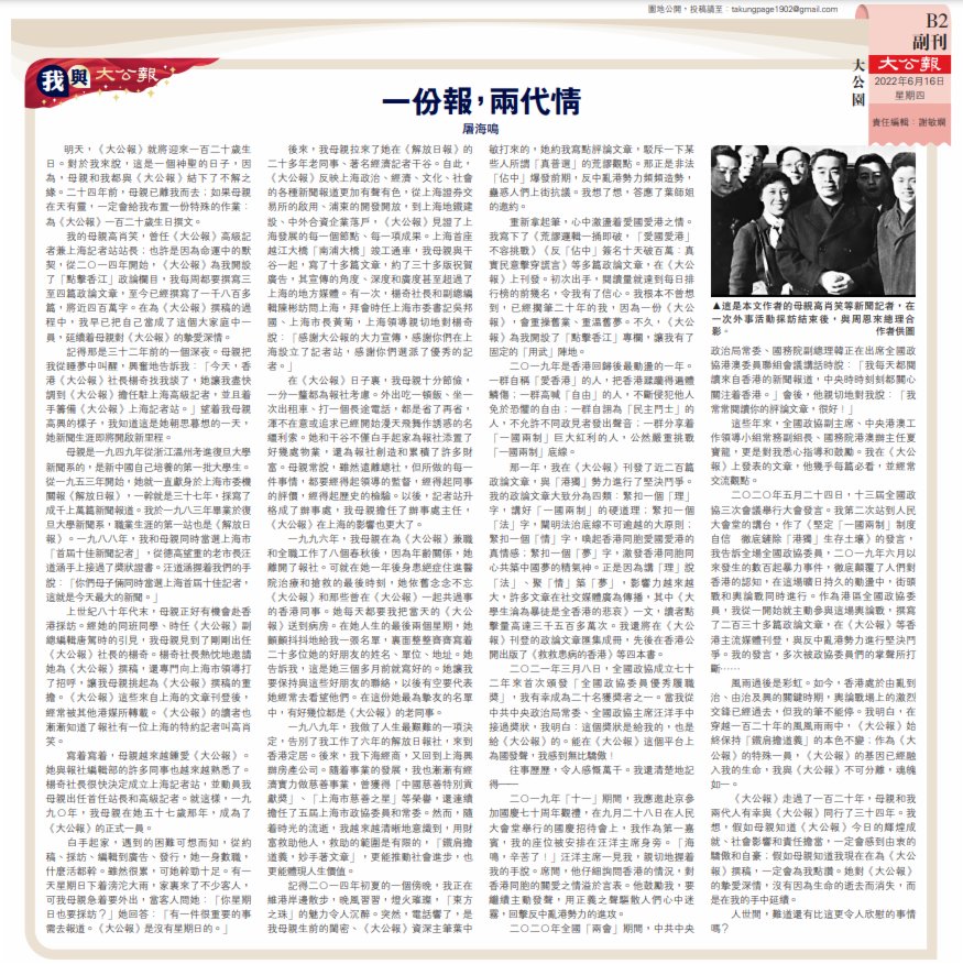 《大公報》走過了一百二十年,母親和我兩代人有幸與《大公報》同行了三十四年。我想,假如母親知道《大公報》今日的輝煌成就、社會影響和責任擔當,一定會感到由衷的驕傲和自豪;假如母親知道我現在在為《大公報》撰稿,一定會為我點讚。她對《大公報》的摯愛深情,沒有因為生命的逝去而消失,而是在我的手中延續。