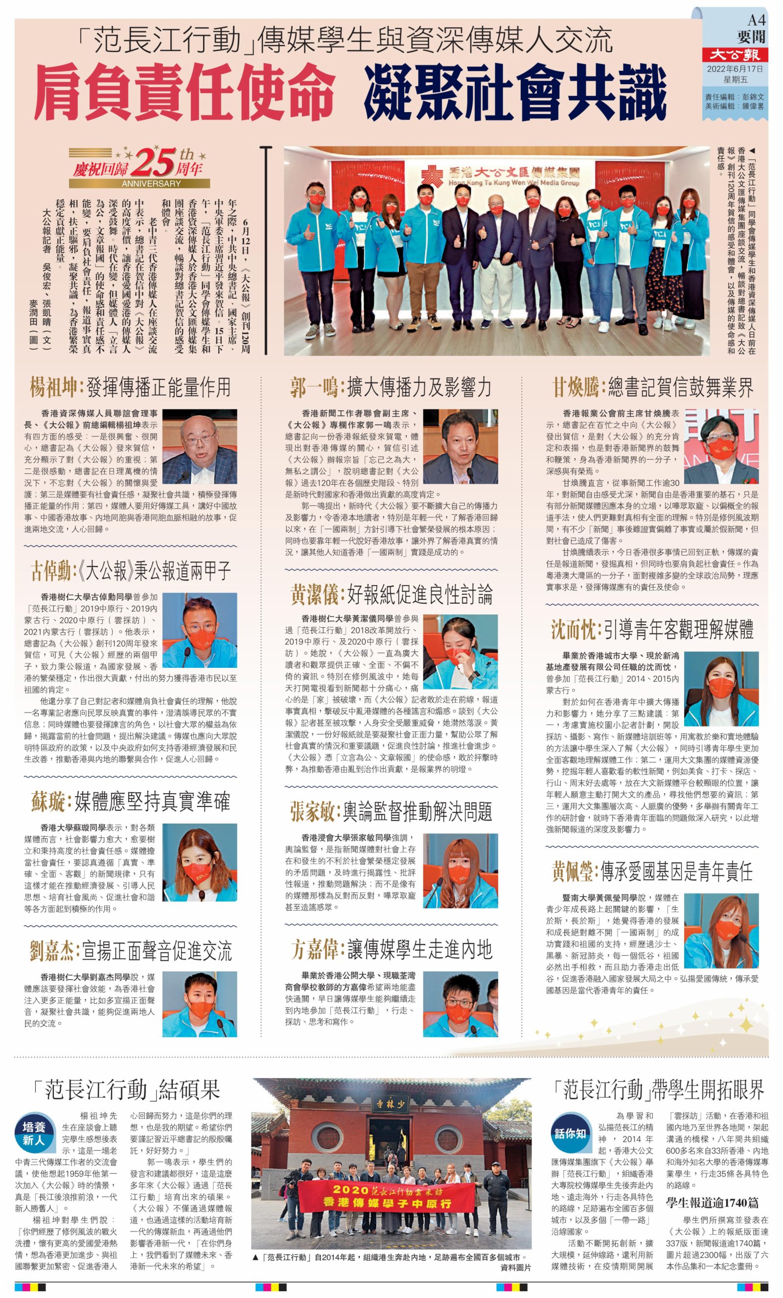 (大公報記者 吳俊宏、張凱晴)6月12日,《大公報》創刊120周年之際,中共中央總書記、國家主席、中央軍委主席習近平發來賀信。15日下午,「范長江行動」同學會傳媒學生和香港資深傳媒人於香港大公文匯傳媒集團座談交流,暢談對總書記賀信的感受和體會。