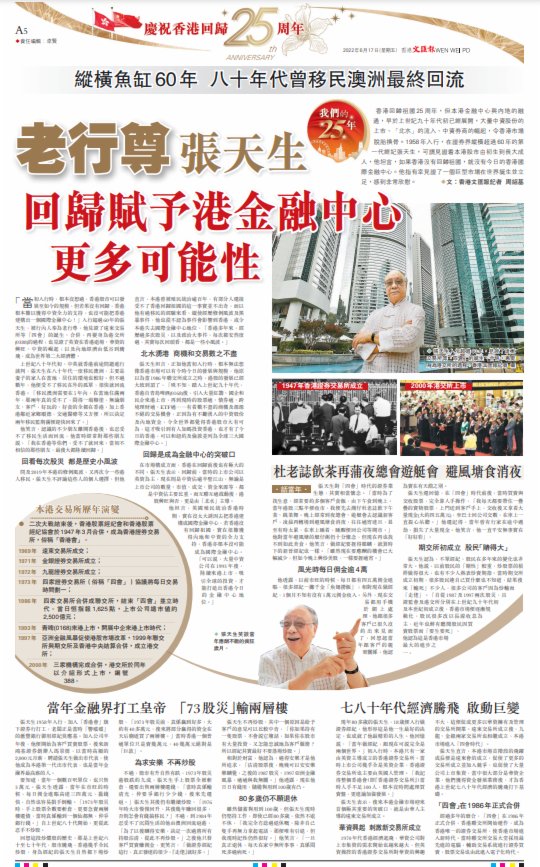 (香港文匯報 記者 周紹基)香港回歸祖國25周年,但本港金融中心與內地的融通,早於上世紀九十年代初已經展開,大量中資股份的上市、「北水」的流入、中資券商的崛起,令香港市場脫胎換骨。1958年入行,在證券界縱橫超過60年的第一代經紀張天生,可謂見證着本港股市由初生到長大成人,他坦言,如果香港沒有回歸祖國,就沒有今日的香港國際金融中心。他指有幸見證了一個巨型市場在世界誕生並立足,感到非常欣慰。