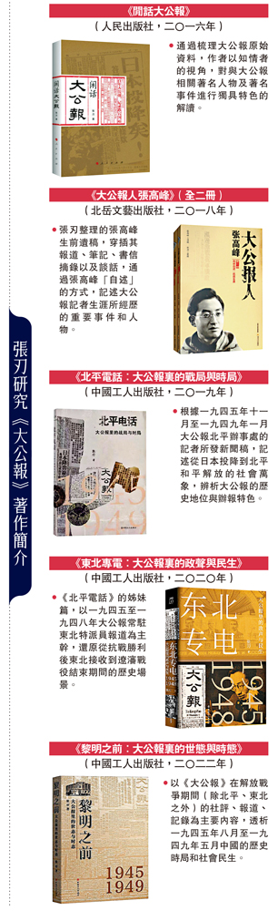 退休以後,為了研究大公報,張刃整理了父親留存的文稿、書信、筆記、剪報,查閱北京、重慶等多地圖書館保存的大公報,一些抗戰時期的報紙因為材質差如今已薄如蟬翼,只能翻閱縮微膠片,拍照後逐字謄寫,累計近二百萬字,近年來陸續出版了多本有關大公報的著作。