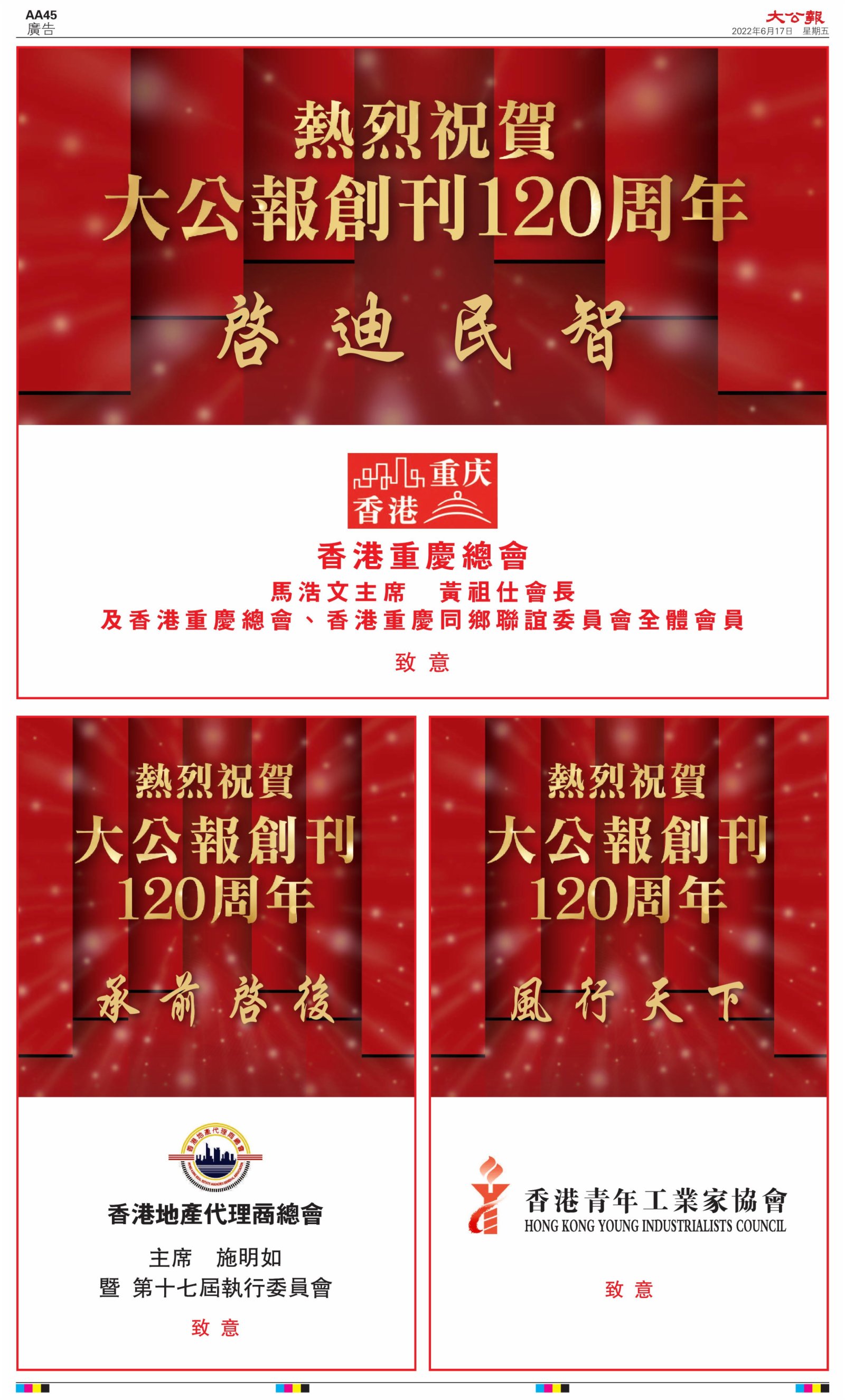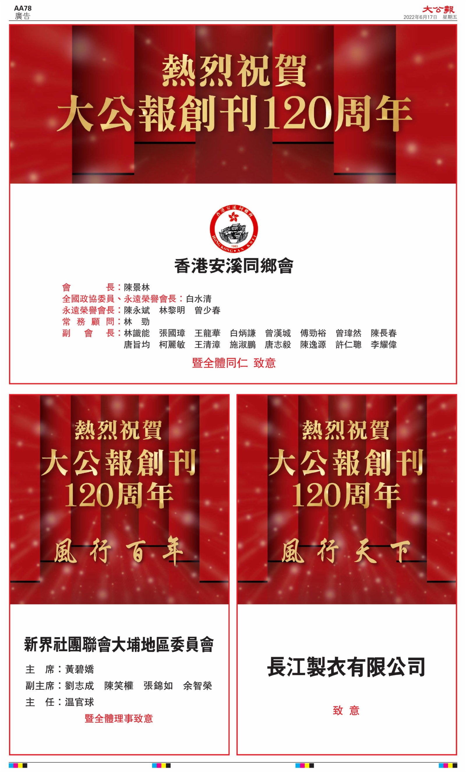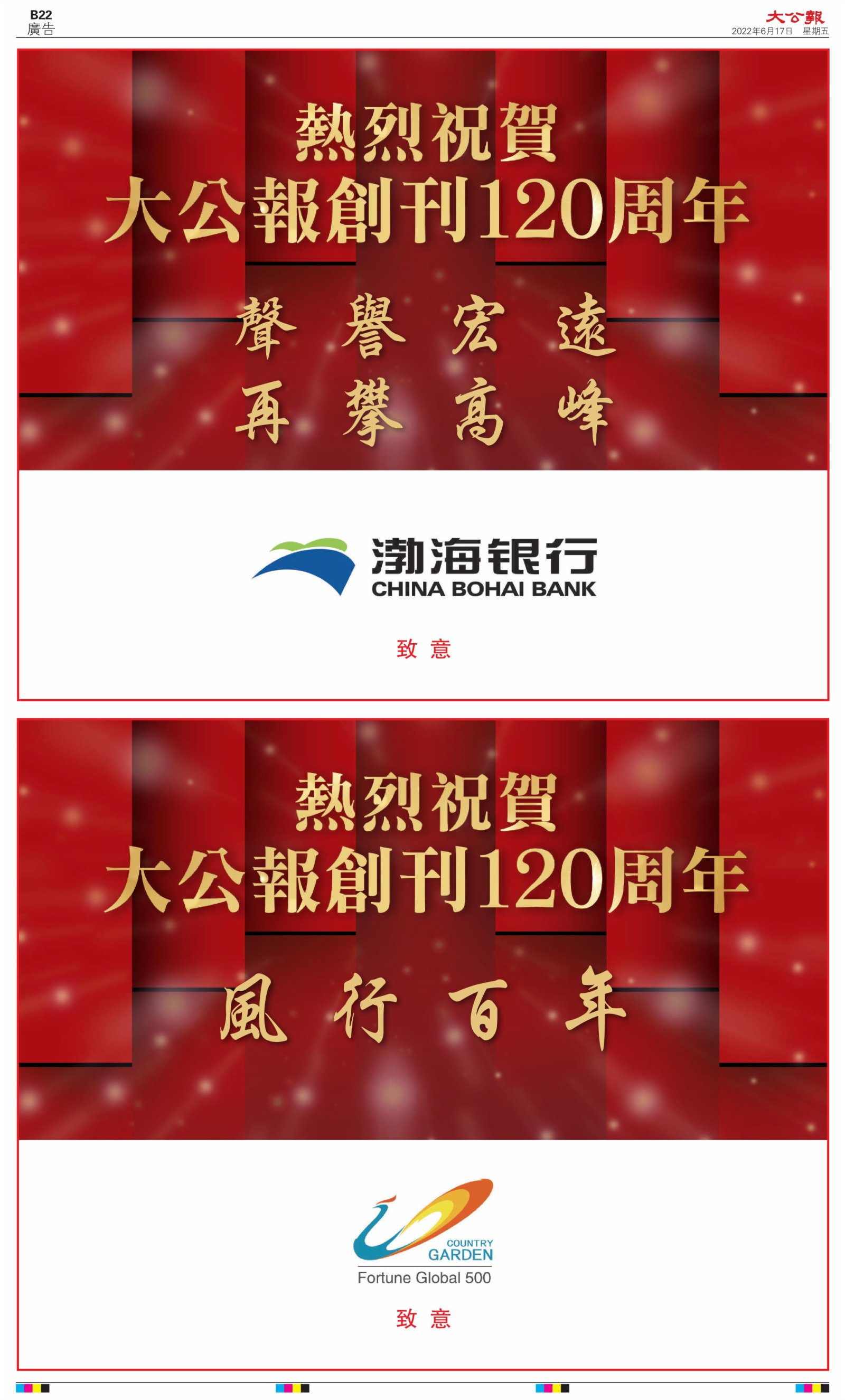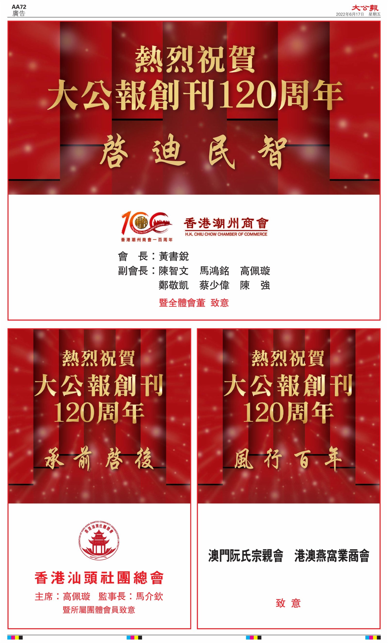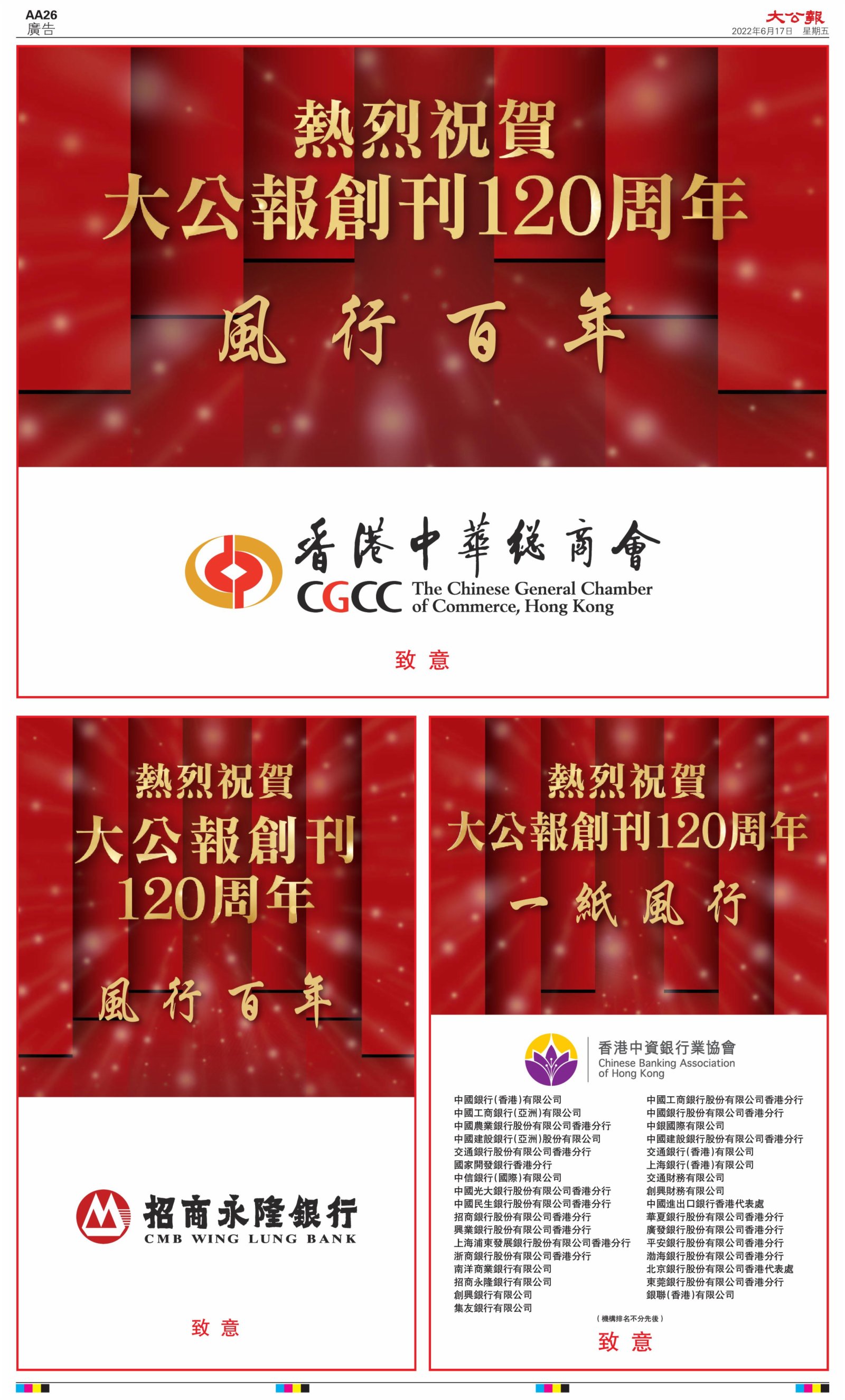 2022年6月17日是《大公報》創刊120周年紀念日,香港工商界、政黨、社團、協會、僑界、教育界、個人,及內地央企、內地企業、內地政府機構,澳門工商界,紛紛在《大公報》刊登廣告,共計100個版面,熱烈祝賀《大公報》創刊120周年。