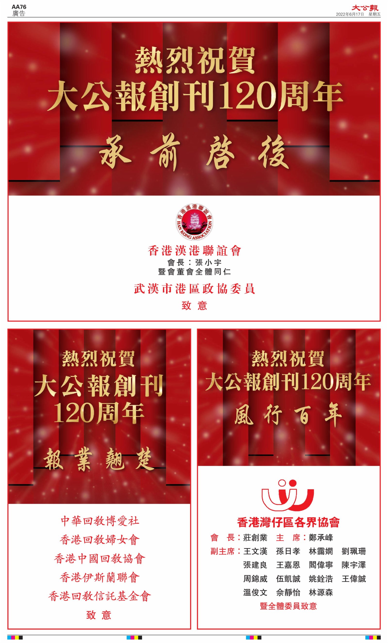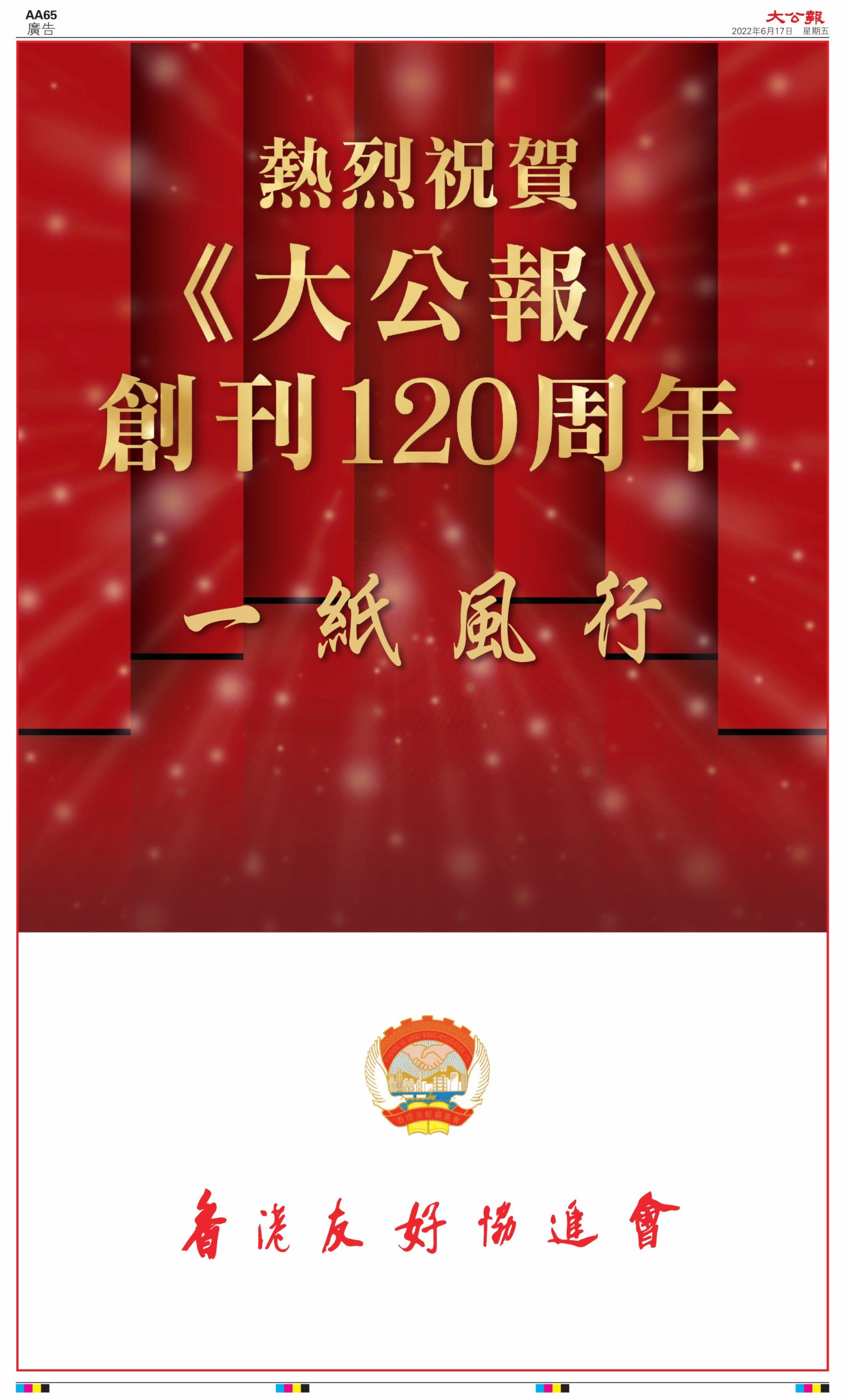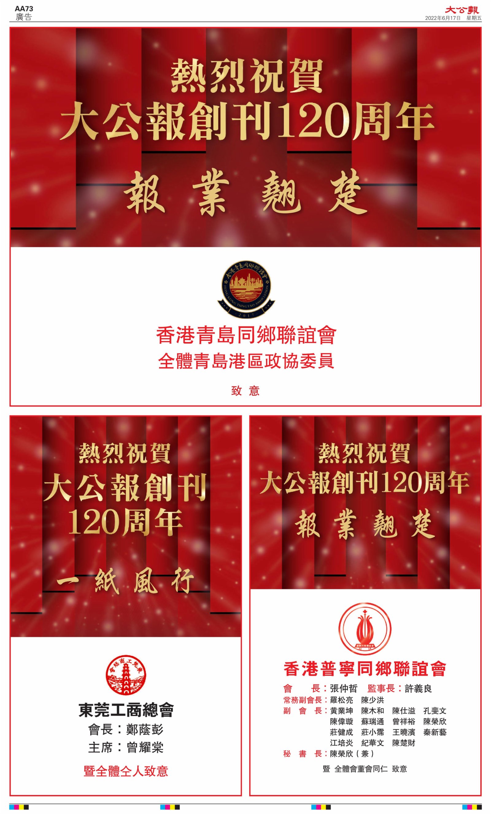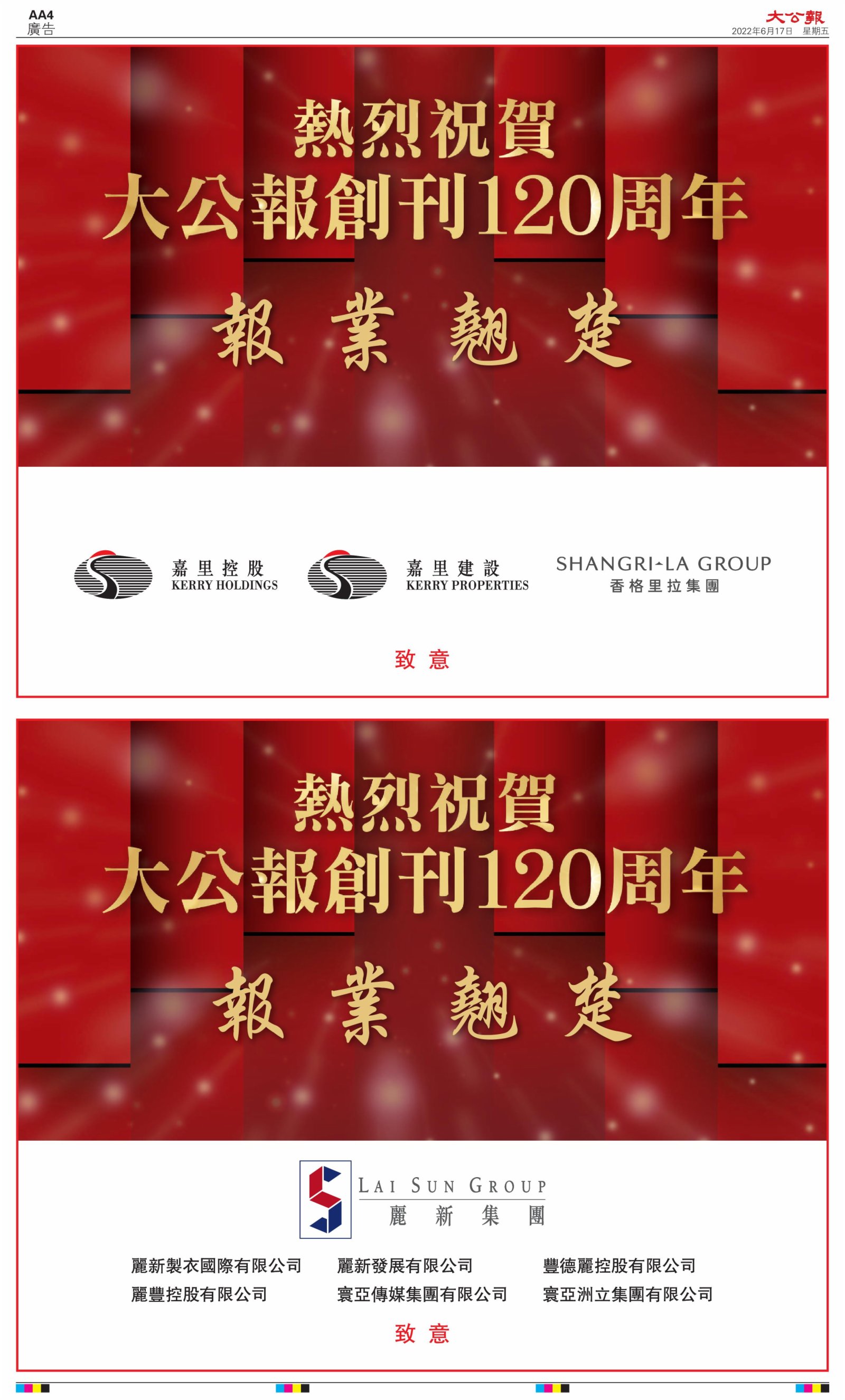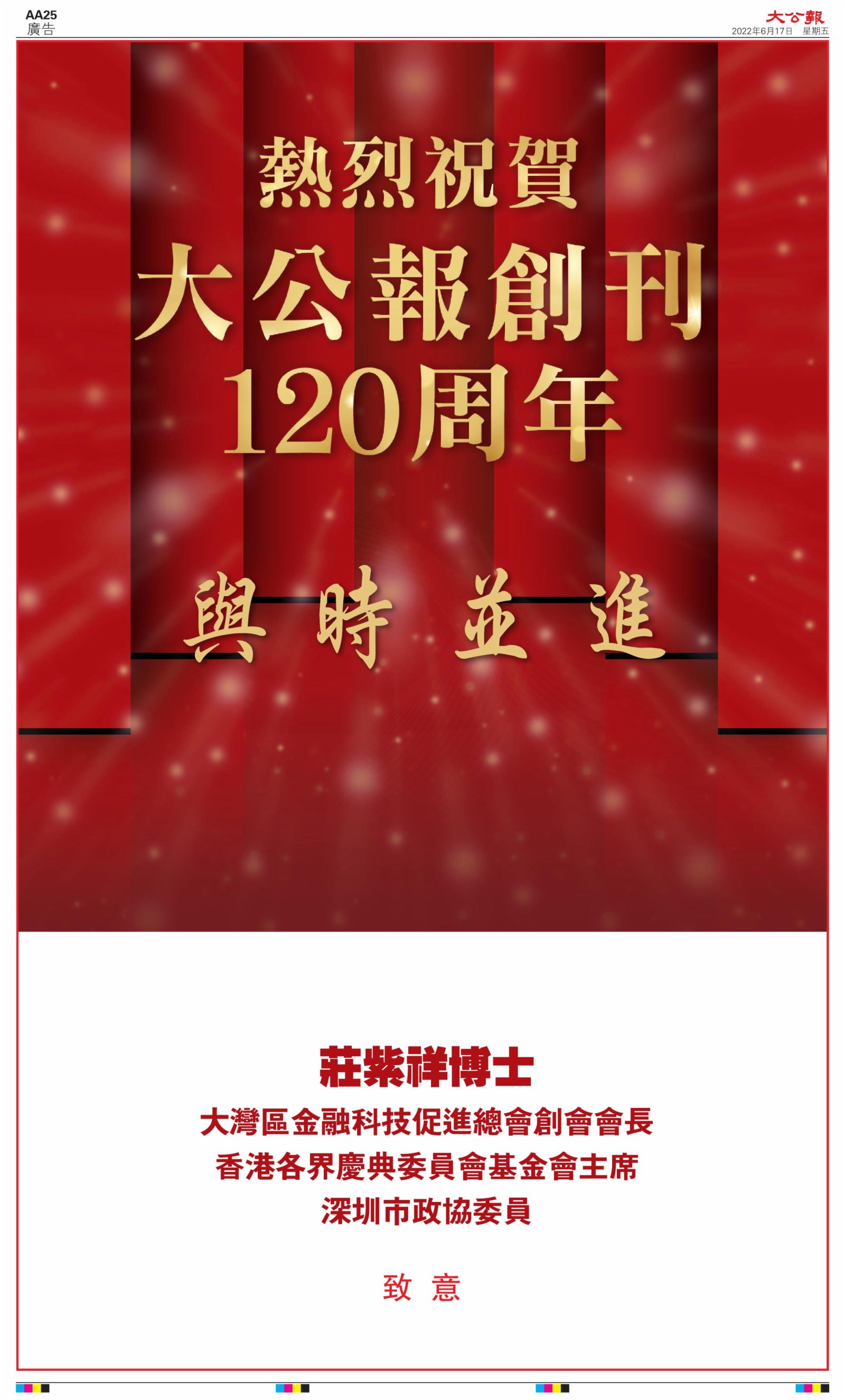 2022年6月17日是《大公報》創刊120周年紀念日,香港工商界、政黨、社團、協會、僑界、教育界、個人,及內地央企、內地企業、內地政府機構,澳門工商界,紛紛在《大公報》刊登廣告,共計100個版面,熱烈祝賀《大公報》創刊120周年。