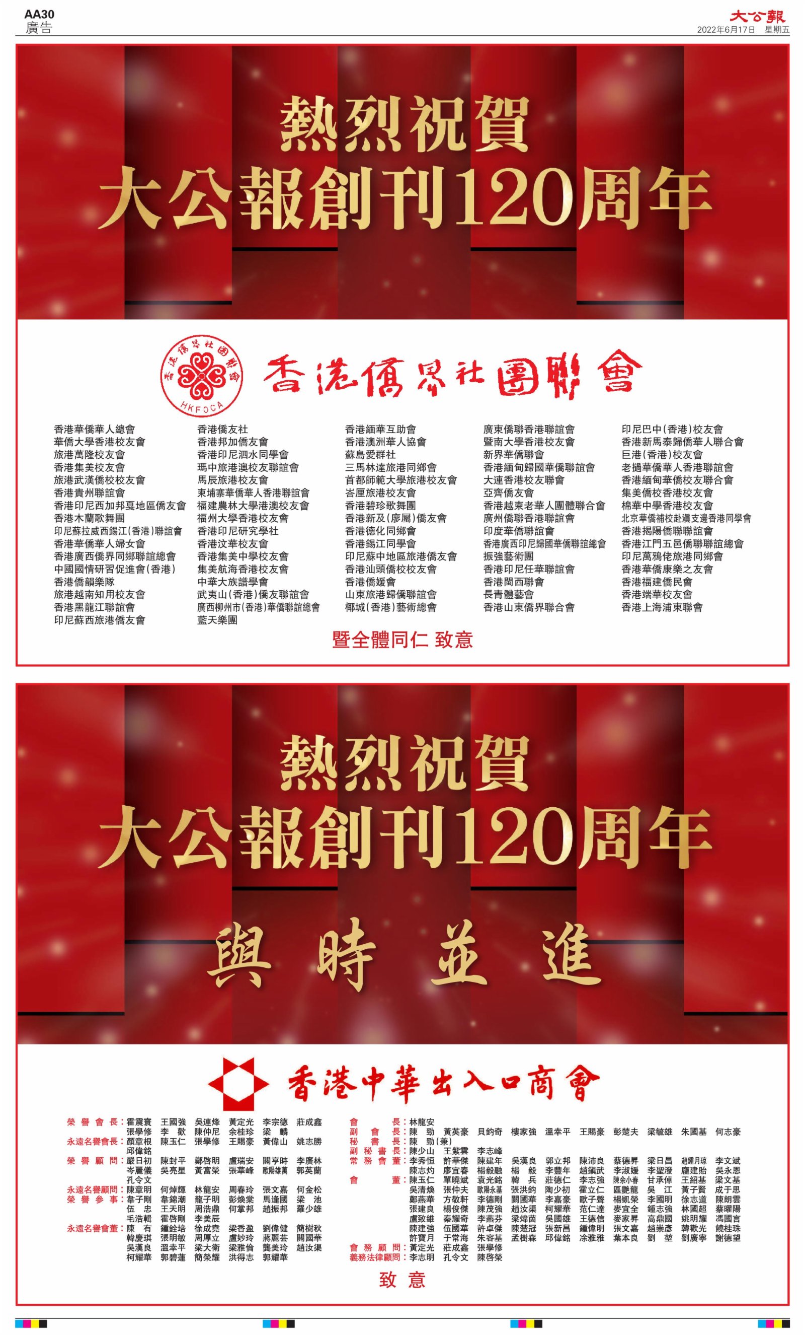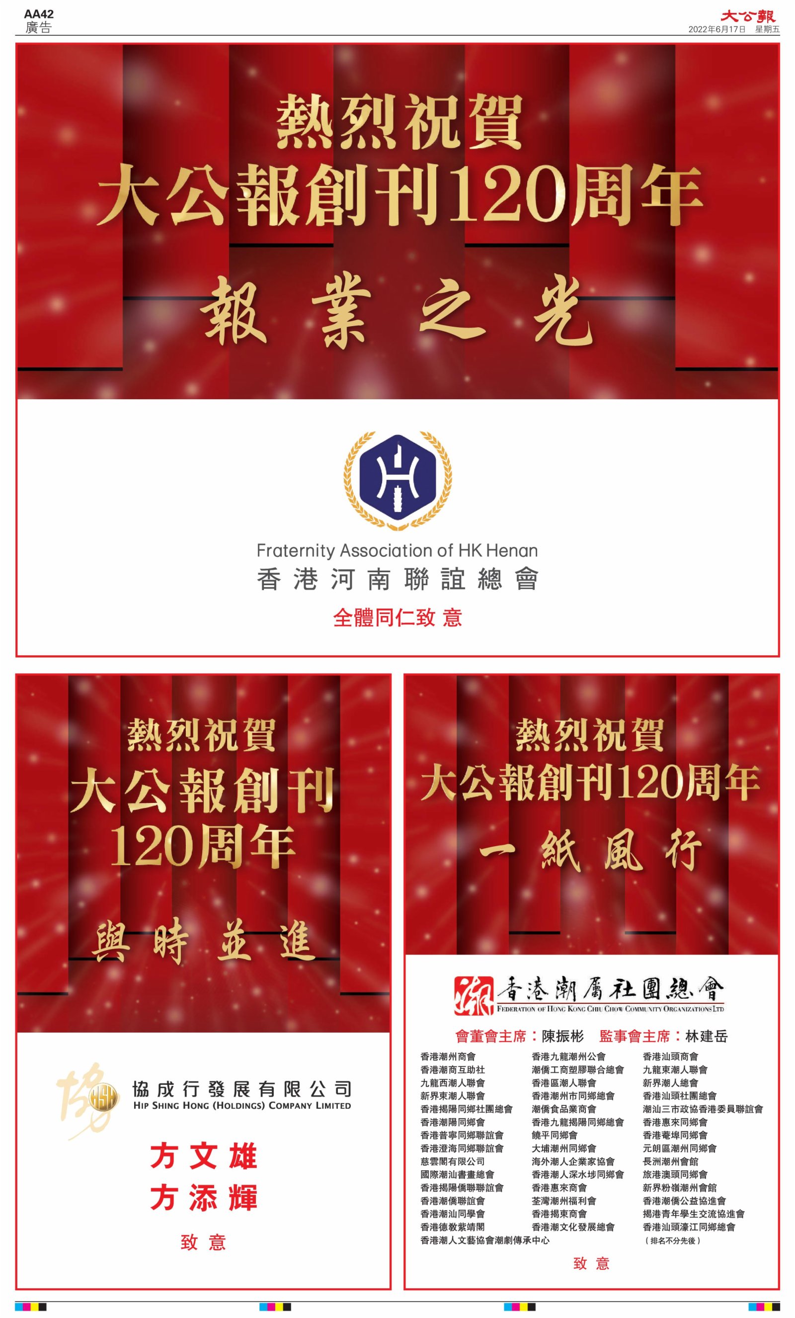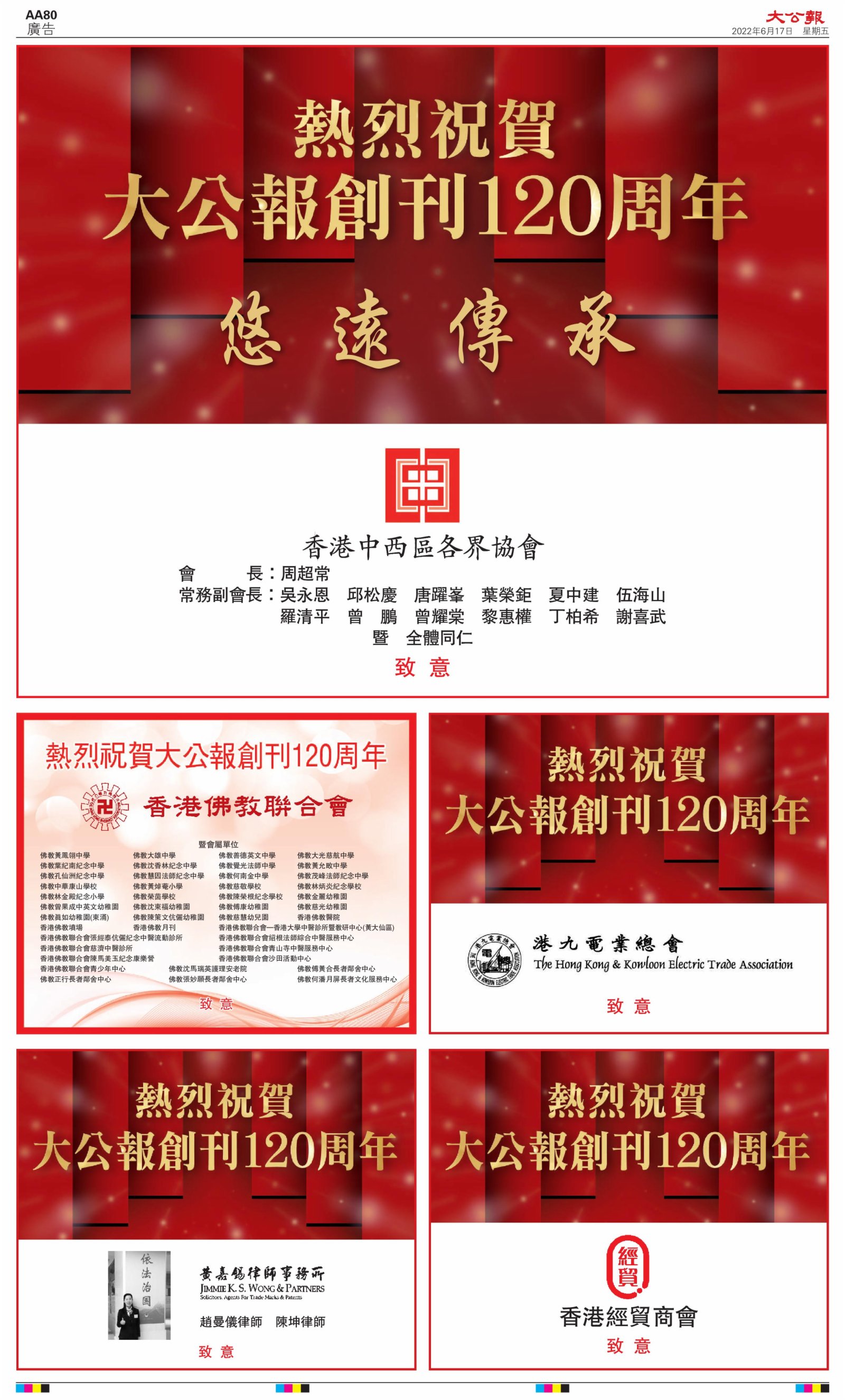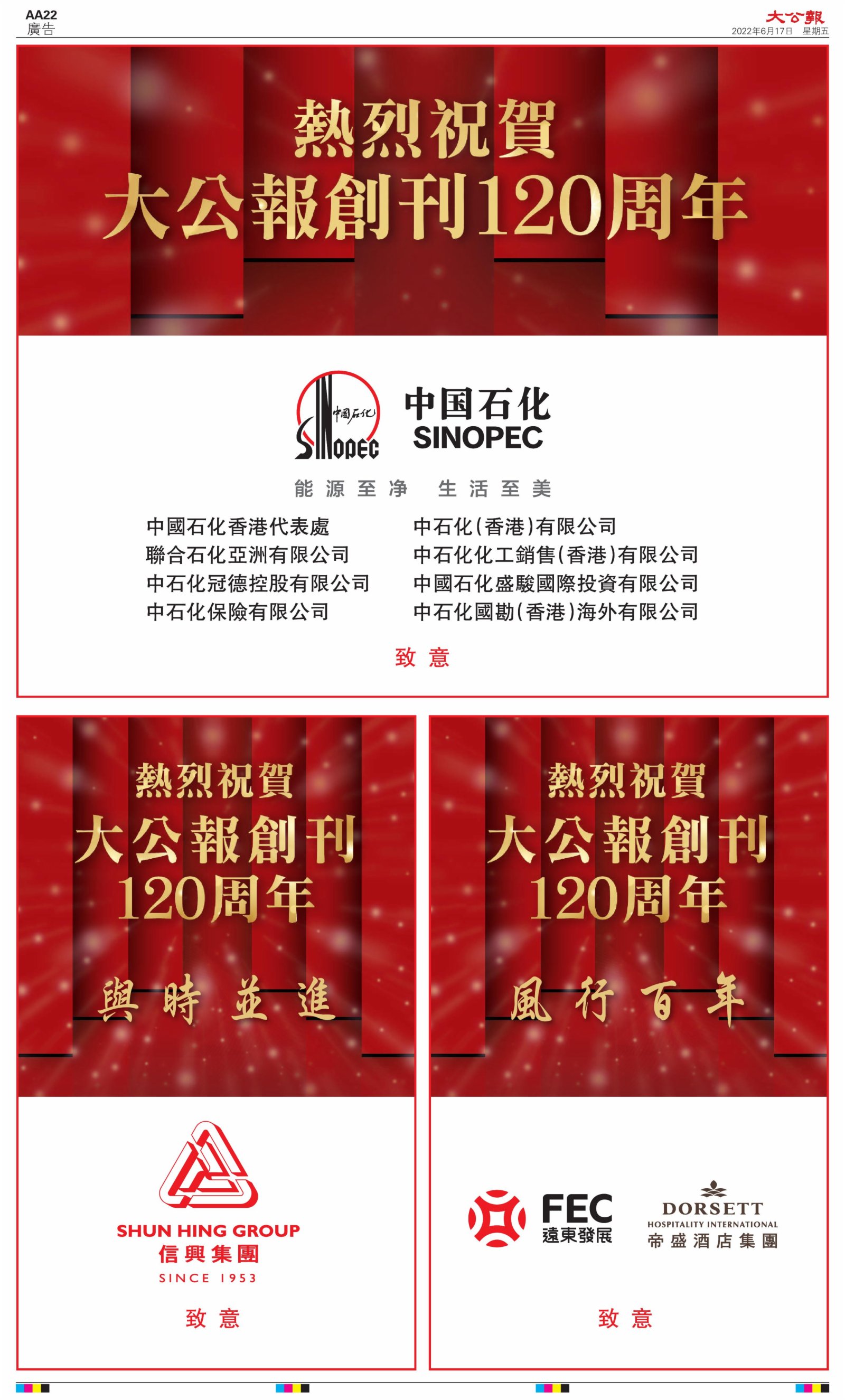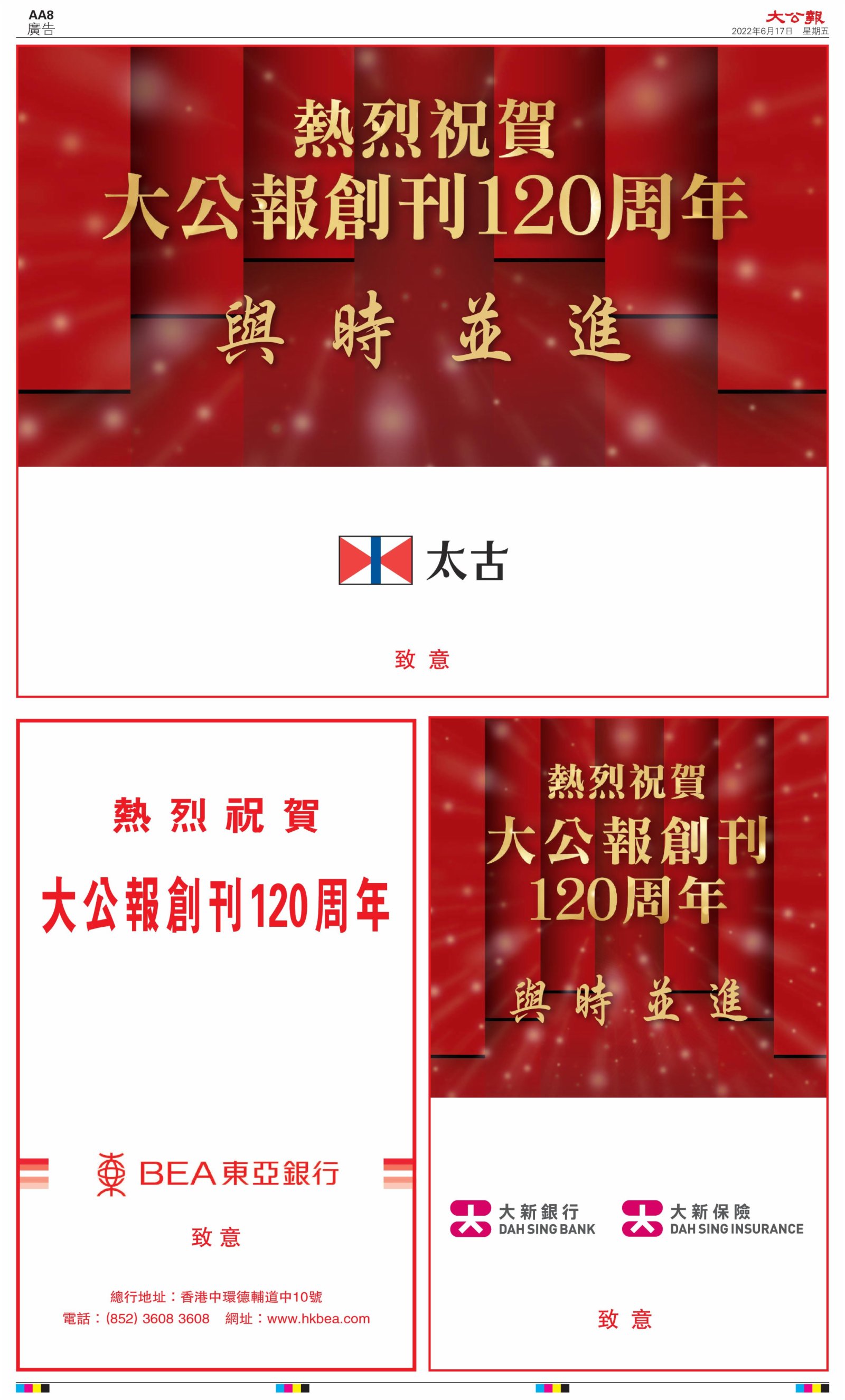 2022年6月17日是《大公報》創刊120周年紀念日,香港工商界、政黨、社團、協會、僑界、教育界、個人,及內地央企、內地企業、內地政府機構,澳門工商界,紛紛在《大公報》刊登廣告,共計100個版面,熱烈祝賀《大公報》創刊120周年。