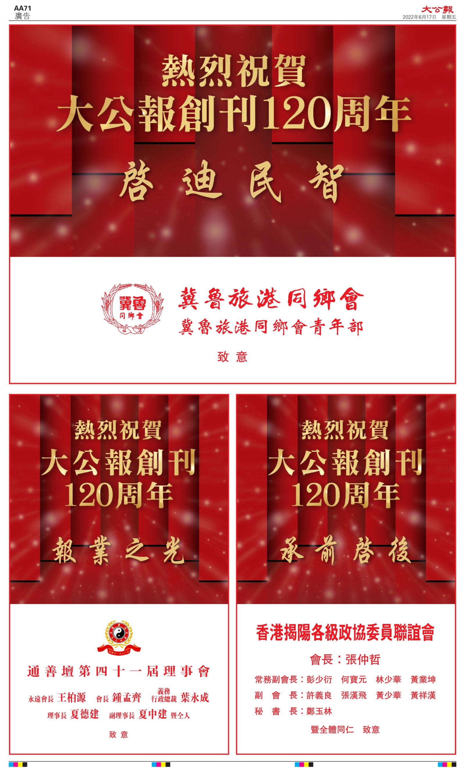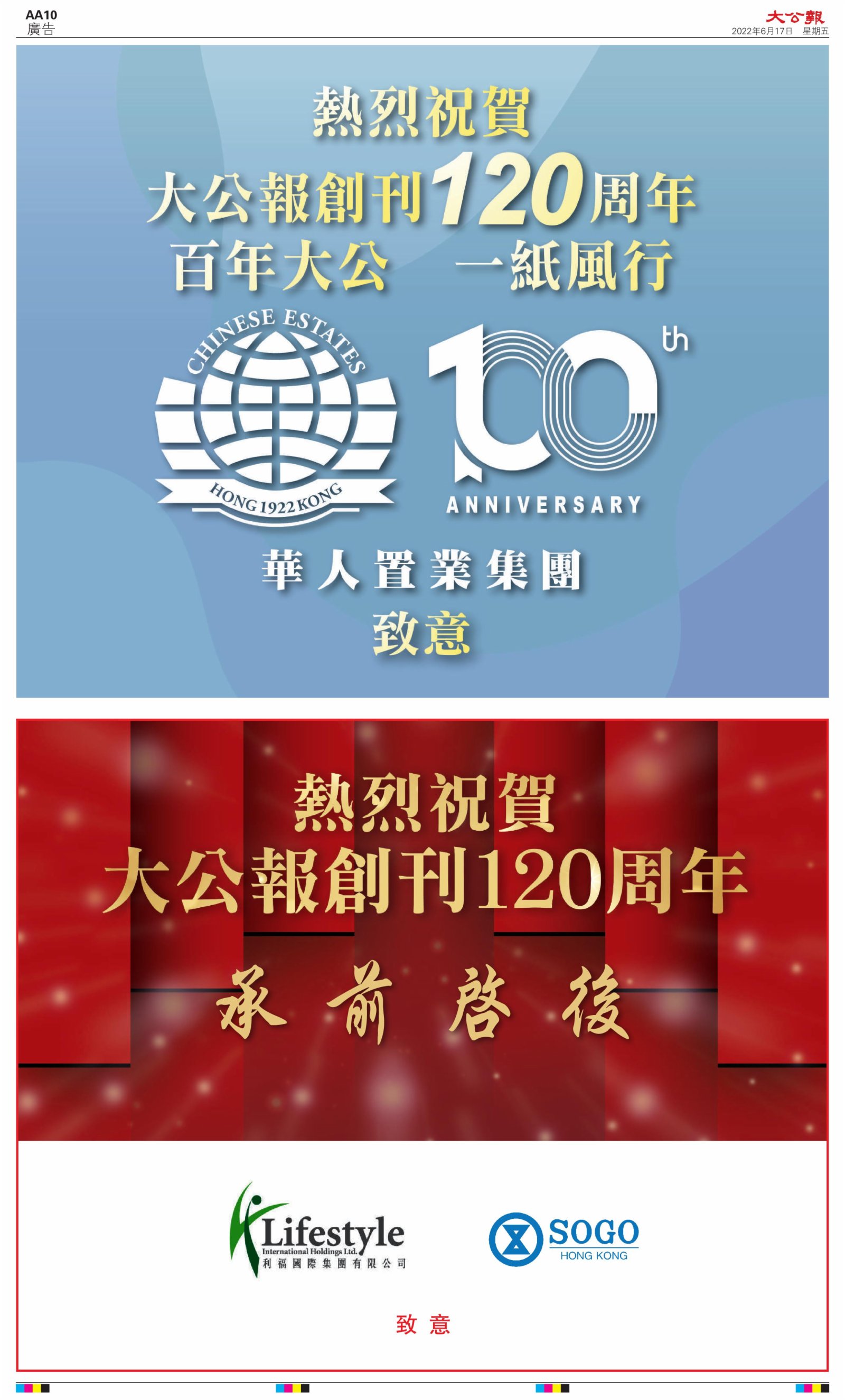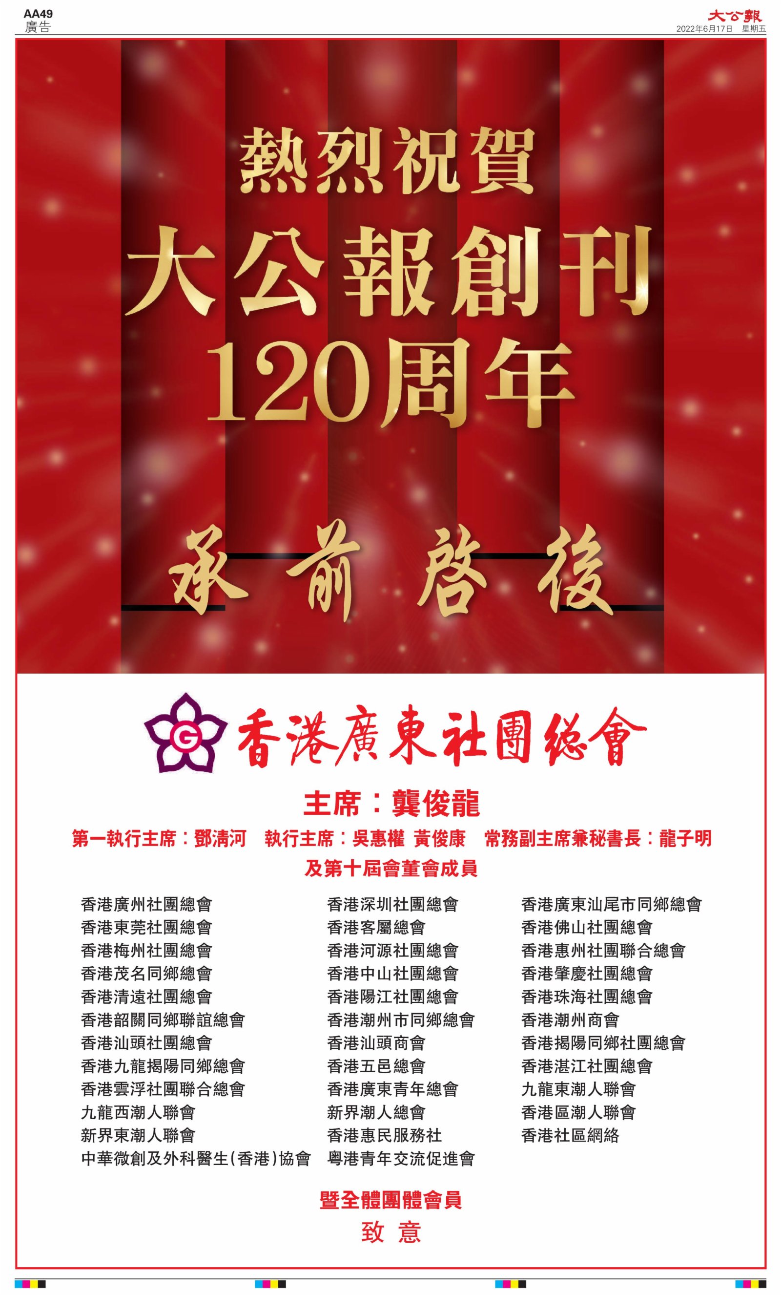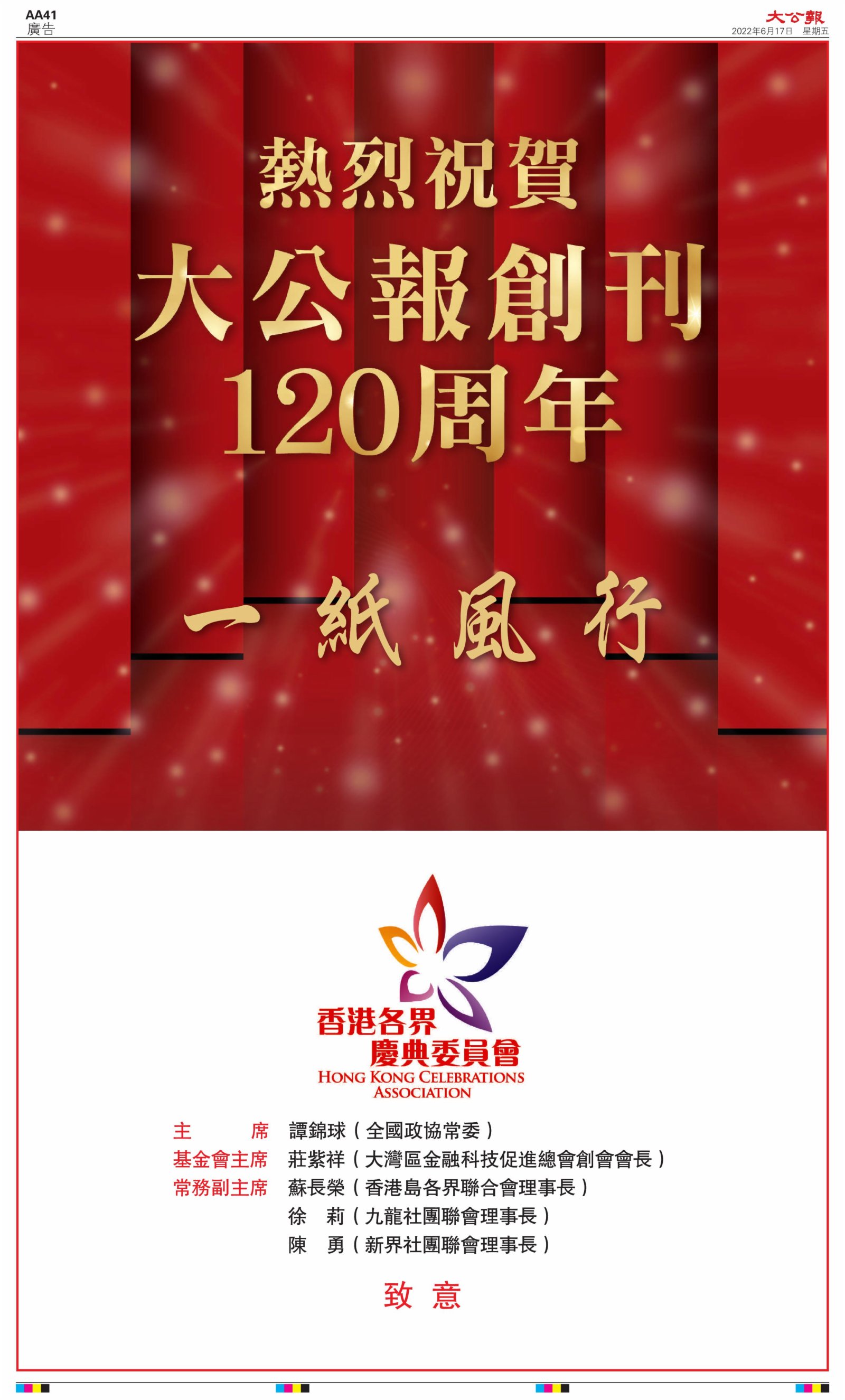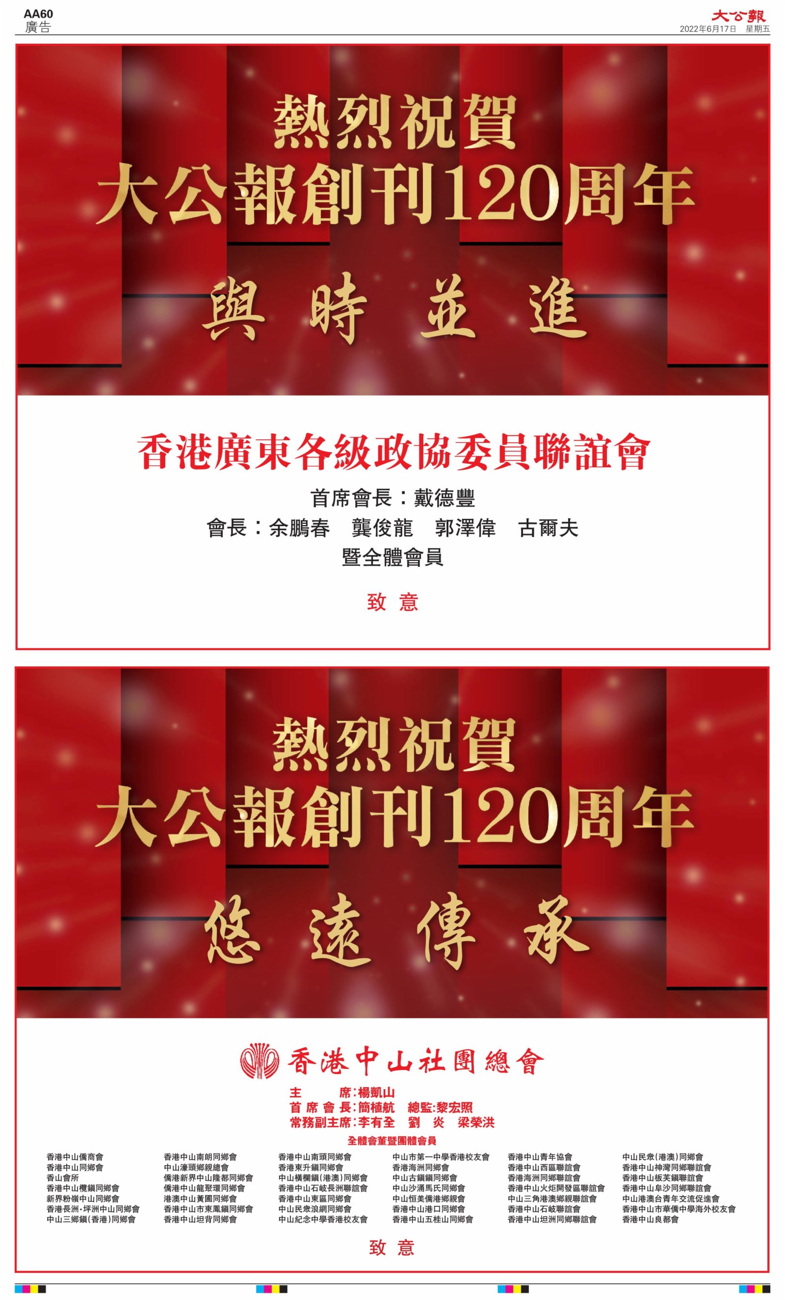 2022年6月17日是《大公報》創刊120周年紀念日,香港工商界、政黨、社團、協會、僑界、教育界、個人,及內地央企、內地企業、內地政府機構,澳門工商界,紛紛在《大公報》刊登廣告,共計100個版面,熱烈祝賀《大公報》創刊120周年。