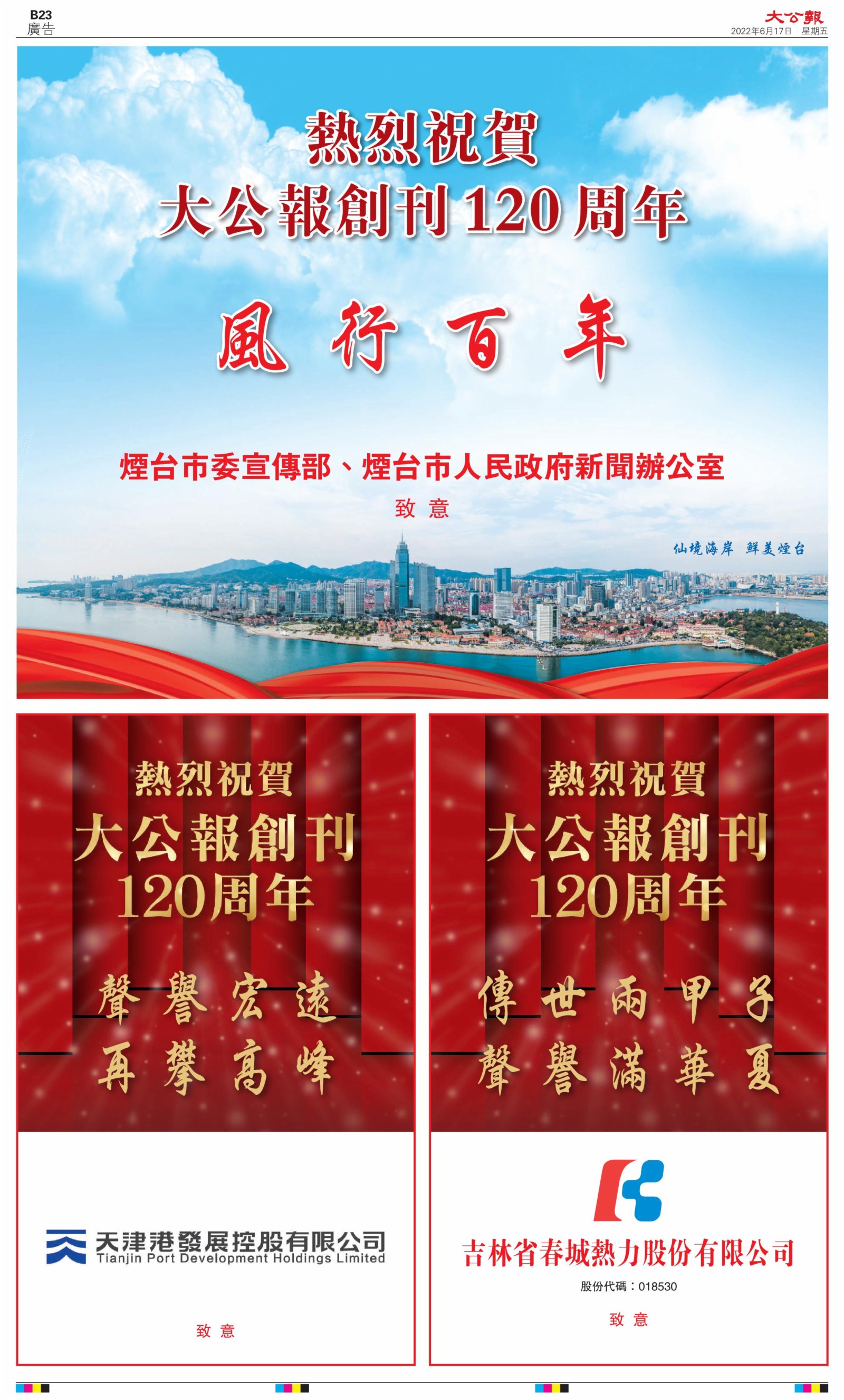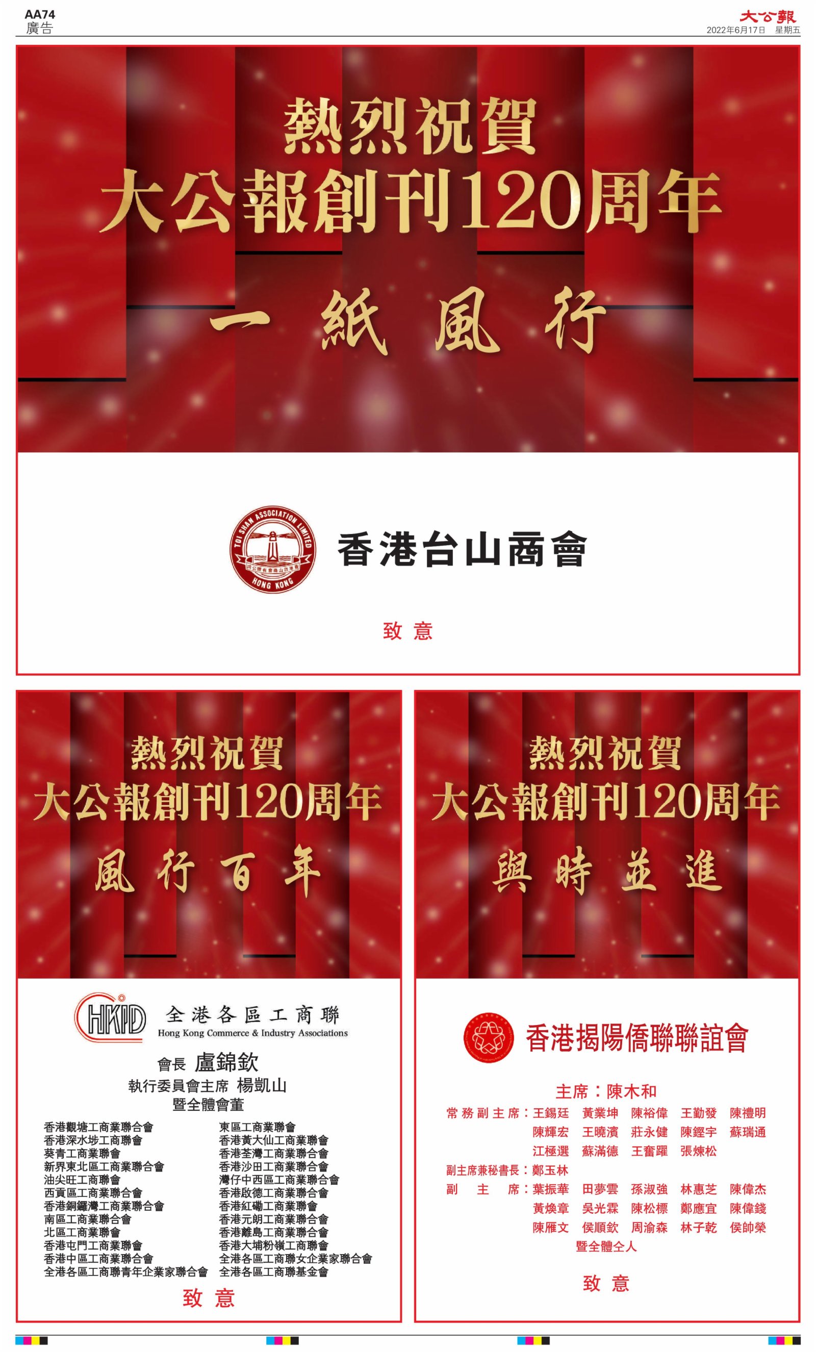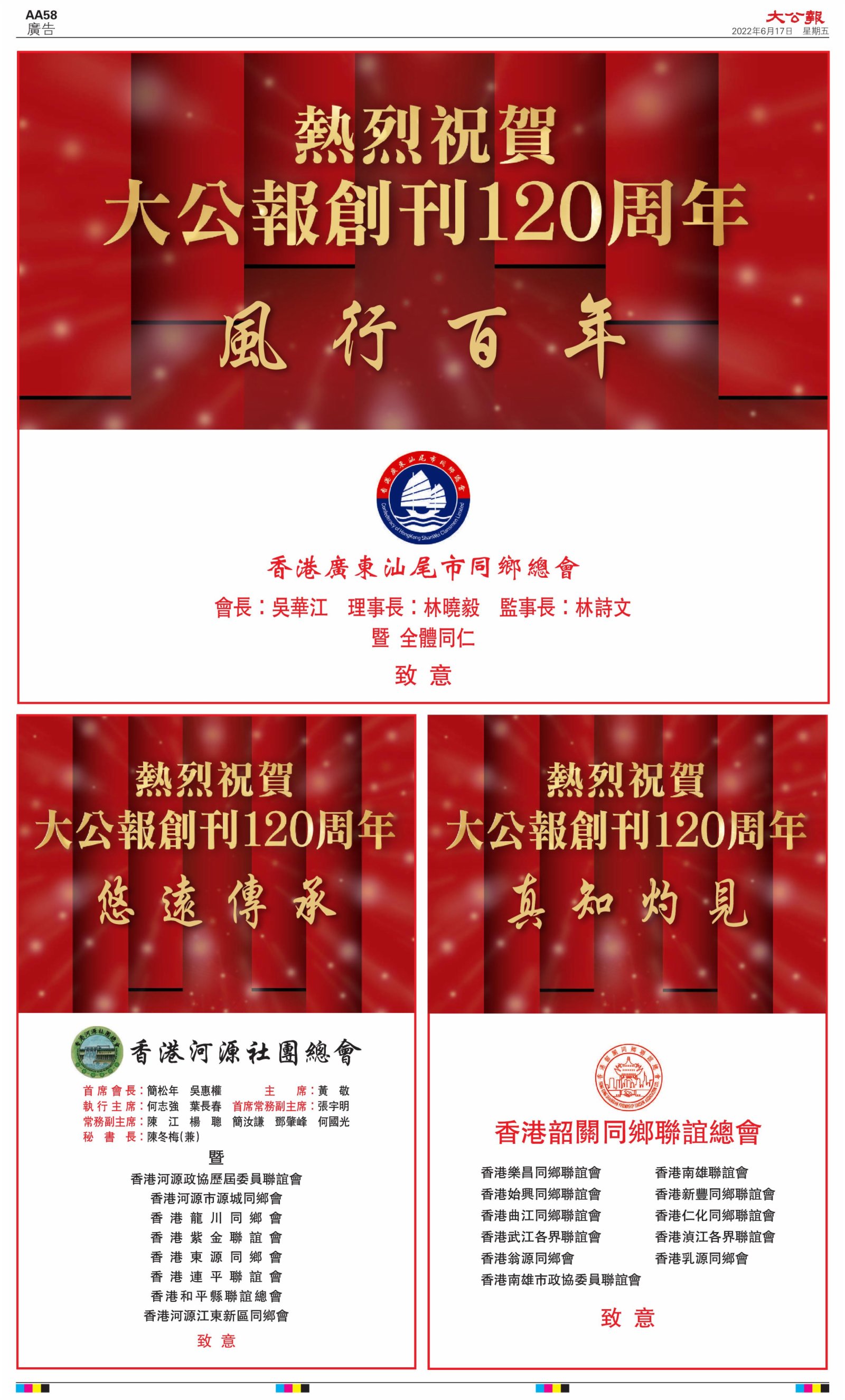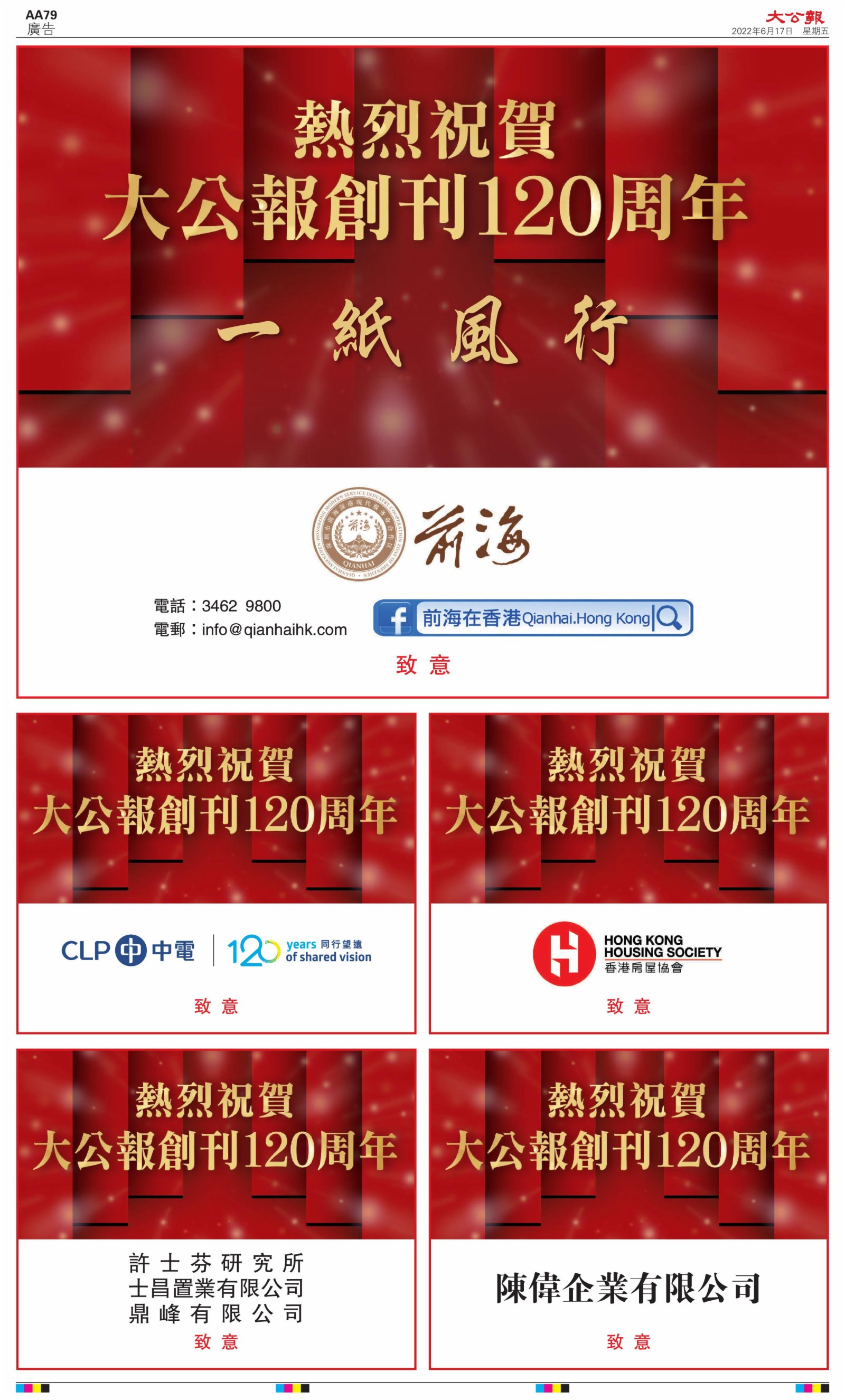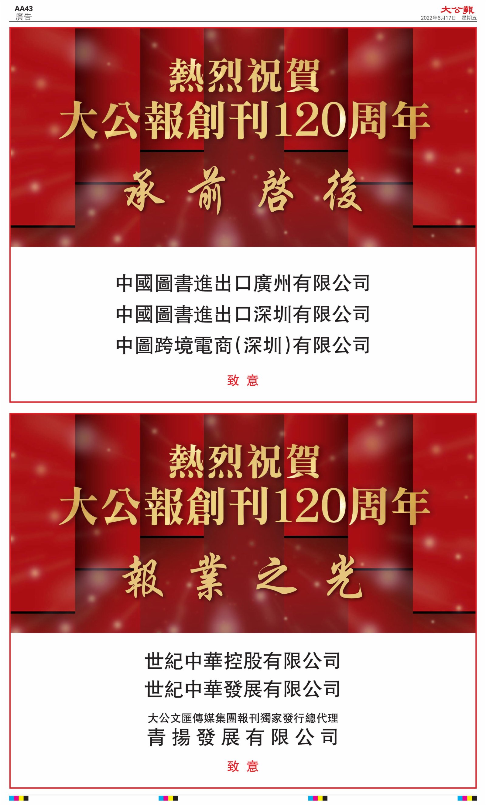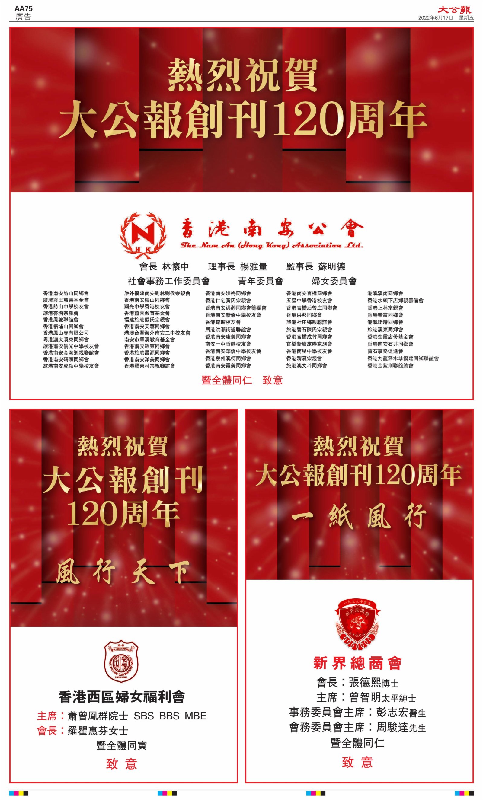 2022年6月17日是《大公報》創刊120周年紀念日,香港工商界、政黨、社團、協會、僑界、教育界、個人,及內地央企、內地企業、內地政府機構,澳門工商界,紛紛在《大公報》刊登廣告,共計100個版面,熱烈祝賀《大公報》創刊120周年。
