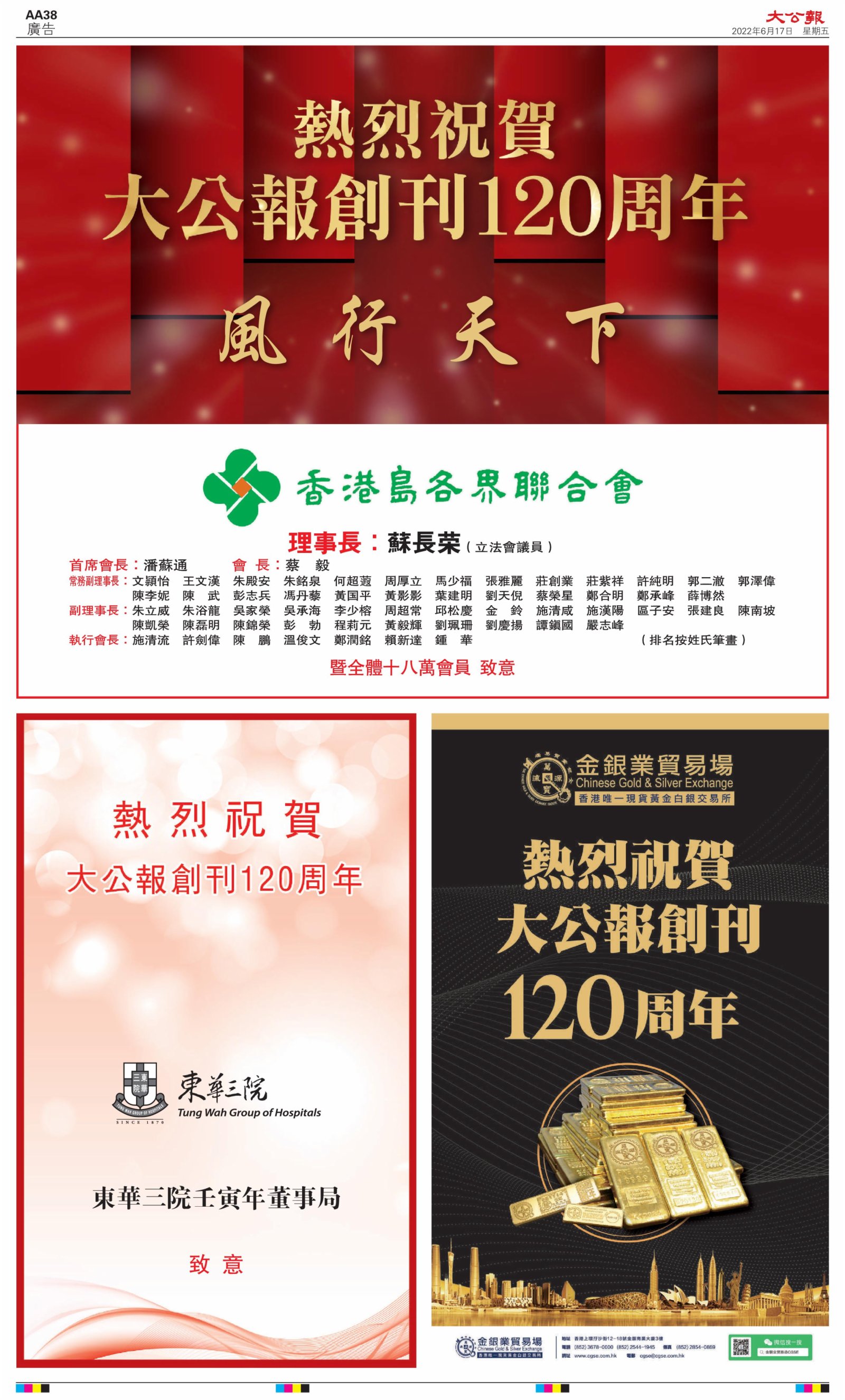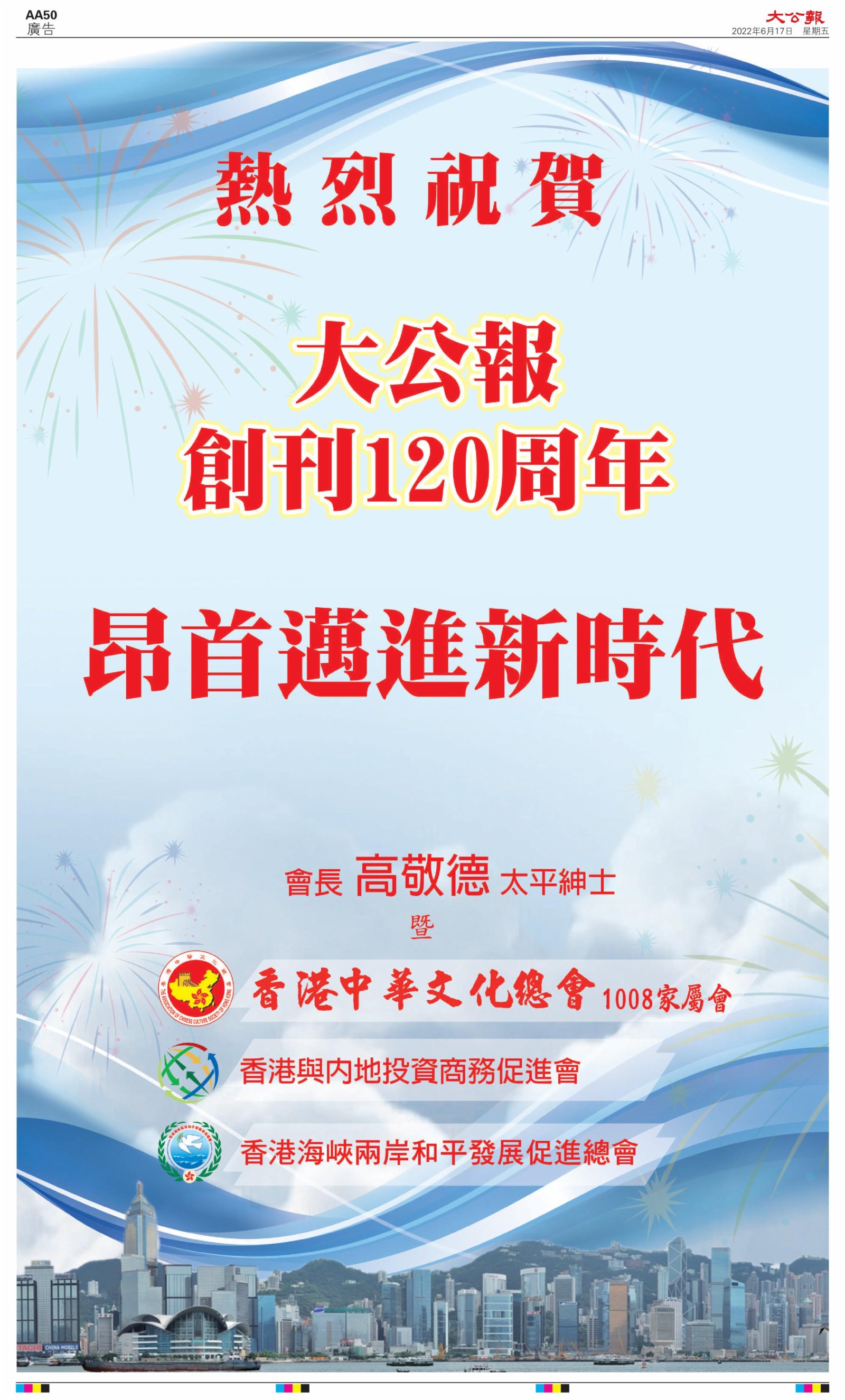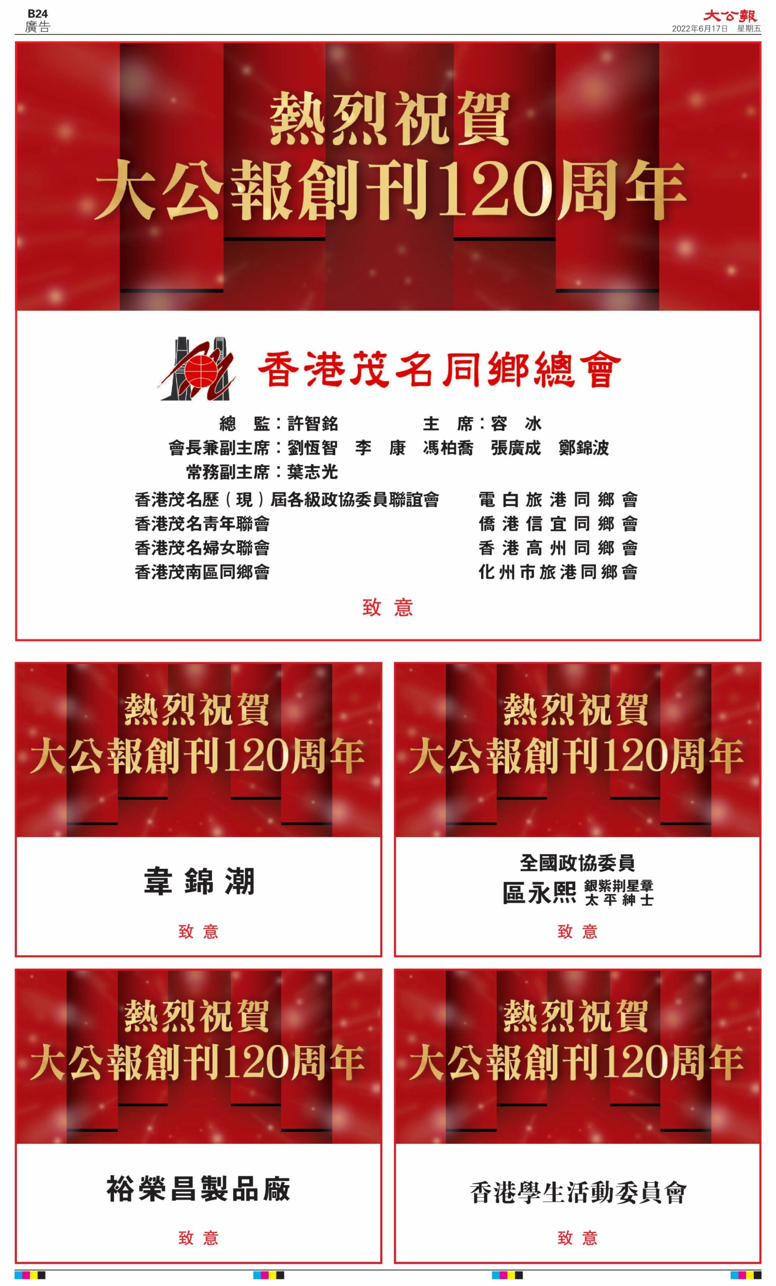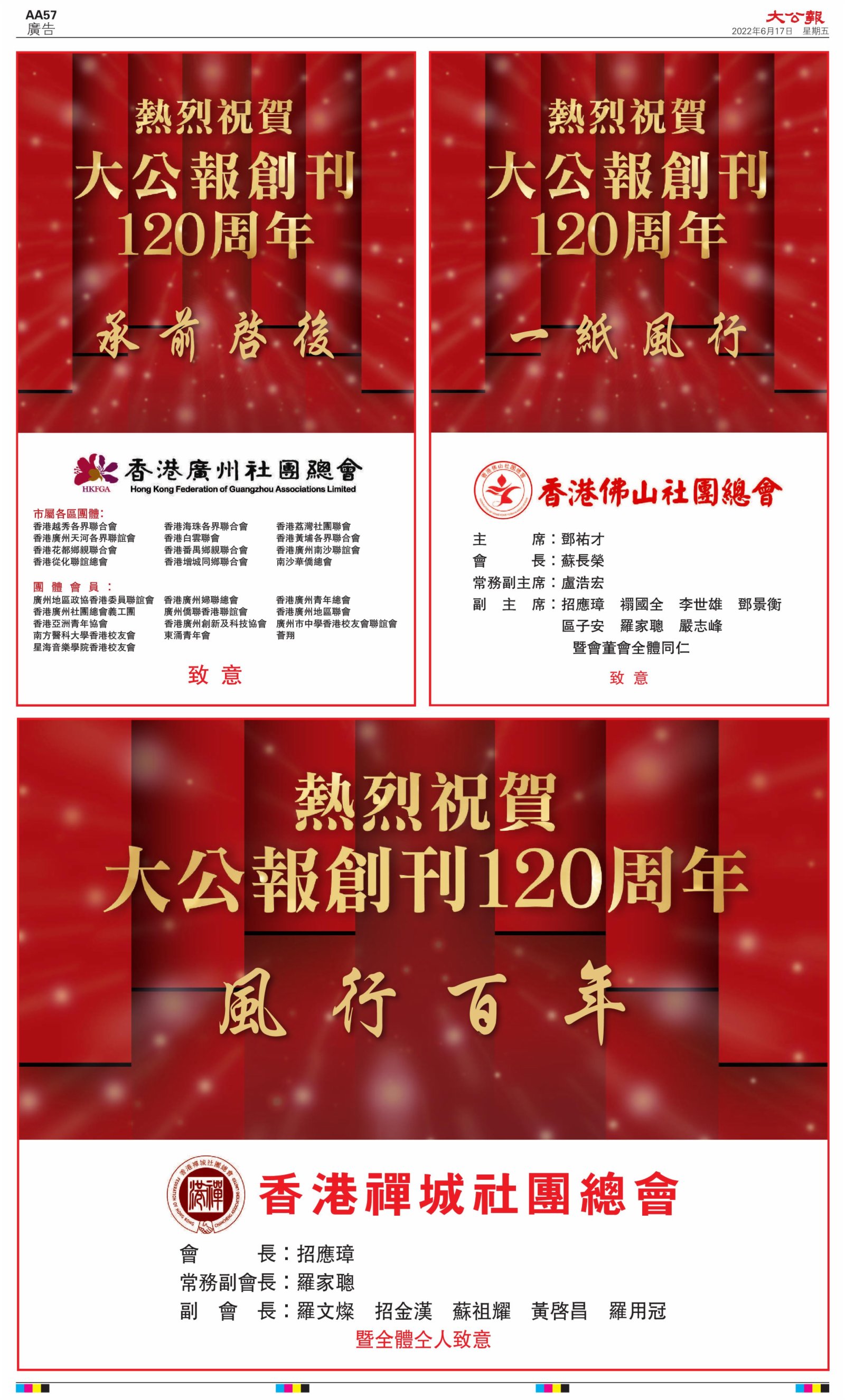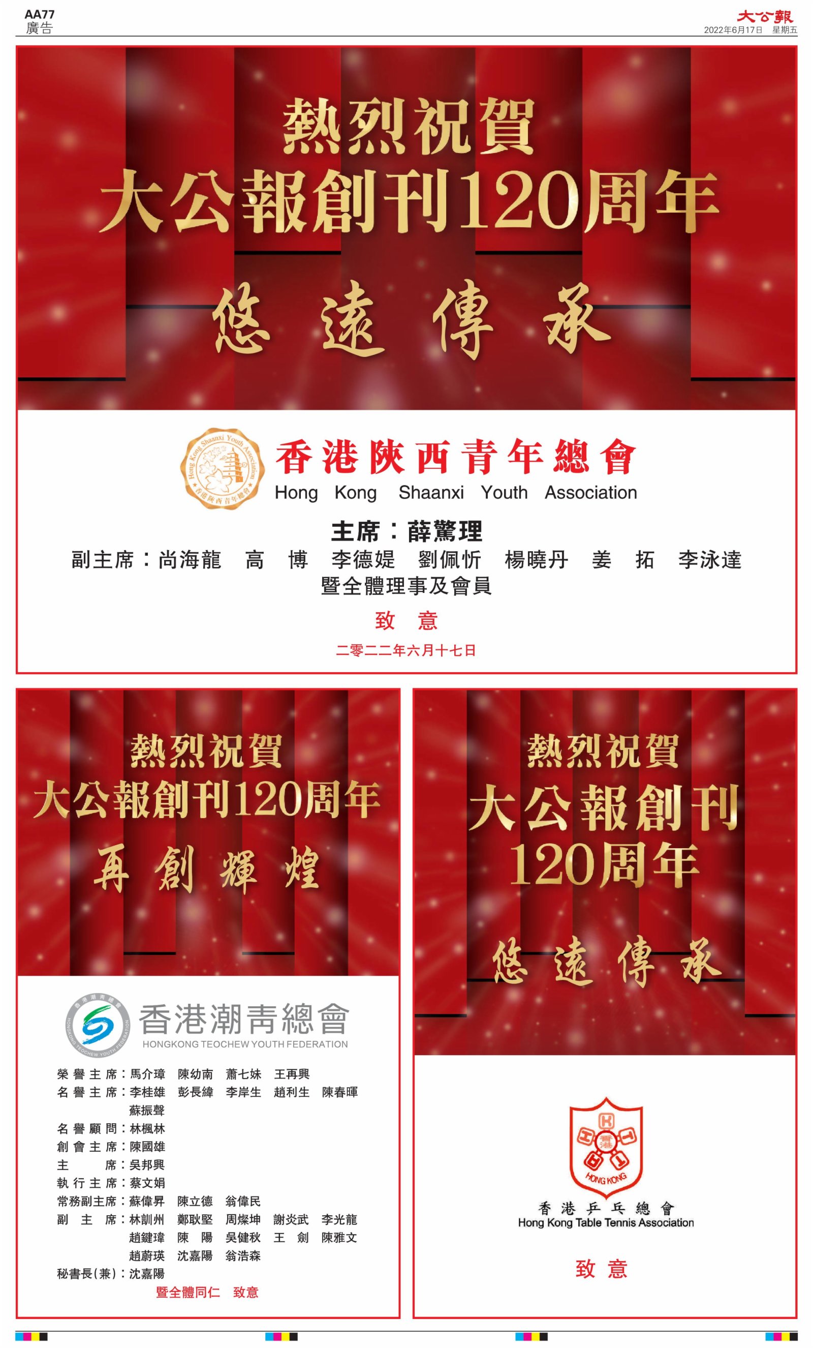 2022年6月17日是《大公報》創刊120周年紀念日,香港工商界、政黨、社團、協會、僑界、教育界、個人,及內地央企、內地企業、內地政府機構,澳門工商界,紛紛在《大公報》刊登廣告,共計100個版面,熱烈祝賀《大公報》創刊120周年。