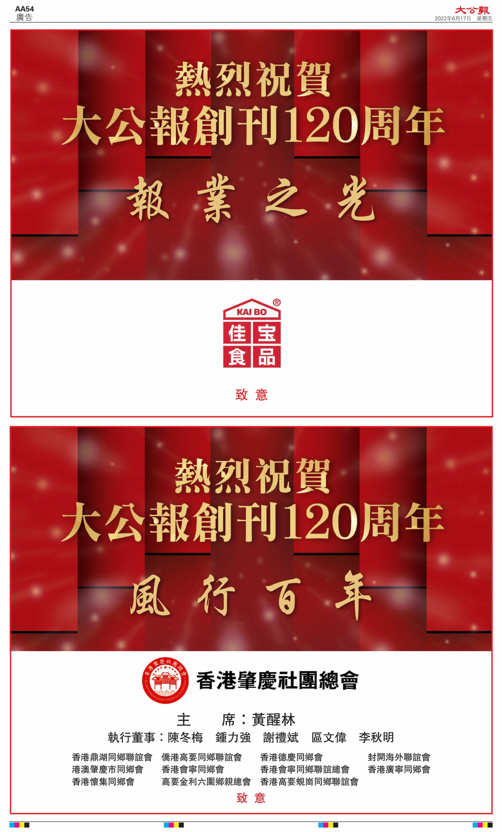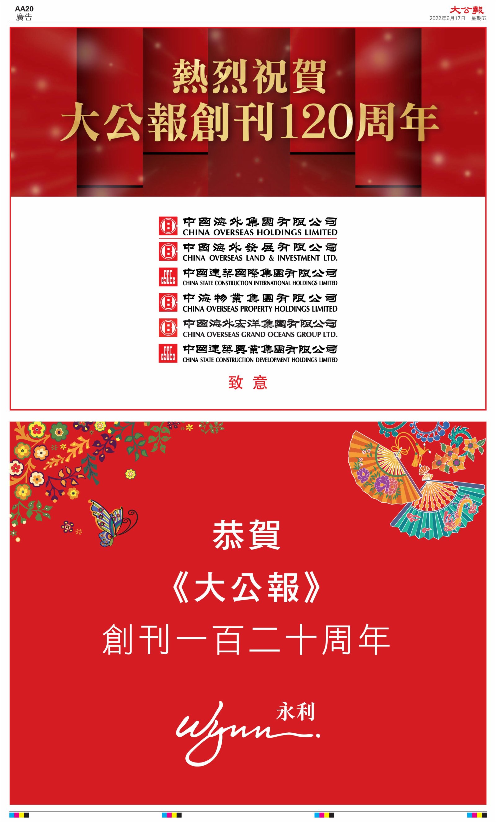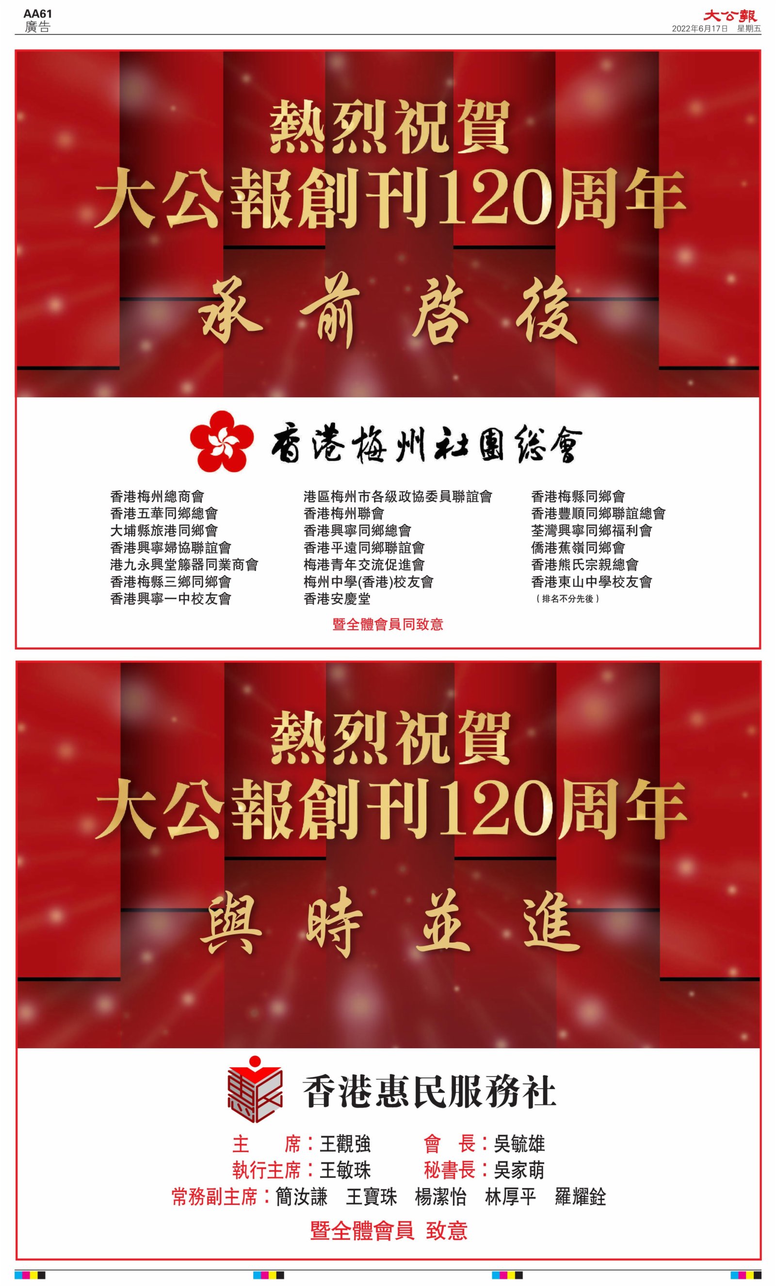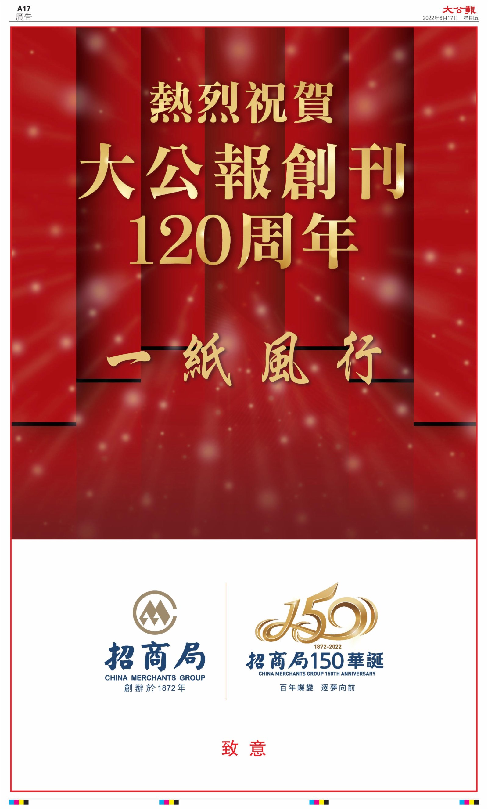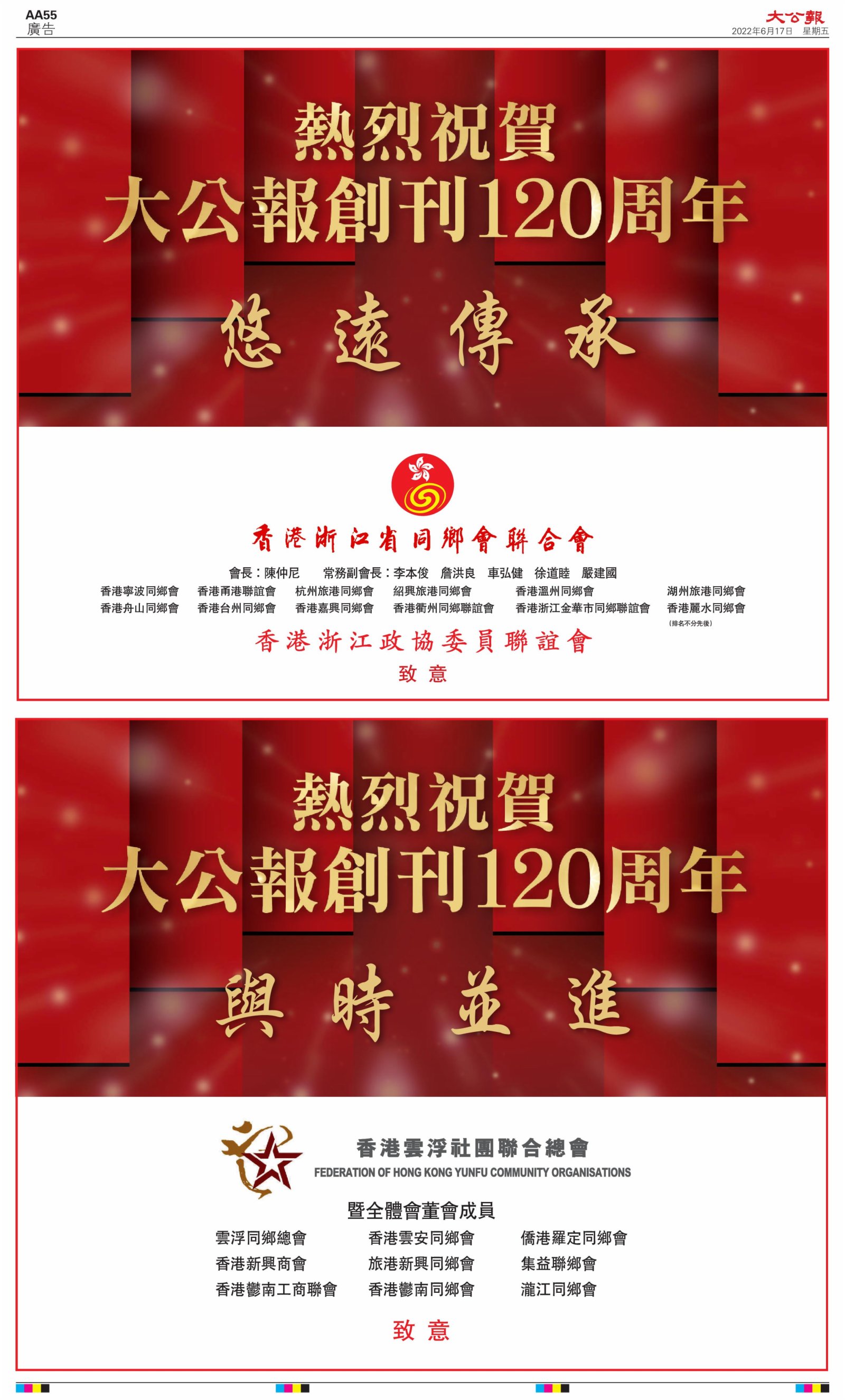 2022年6月17日是《大公報》創刊120周年紀念日,香港工商界、政黨、社團、協會、僑界、教育界、個人,及內地央企、內地企業、內地政府機構,澳門工商界,紛紛在《大公報》刊登廣告,共計100個版面,熱烈祝賀《大公報》創刊120周年。