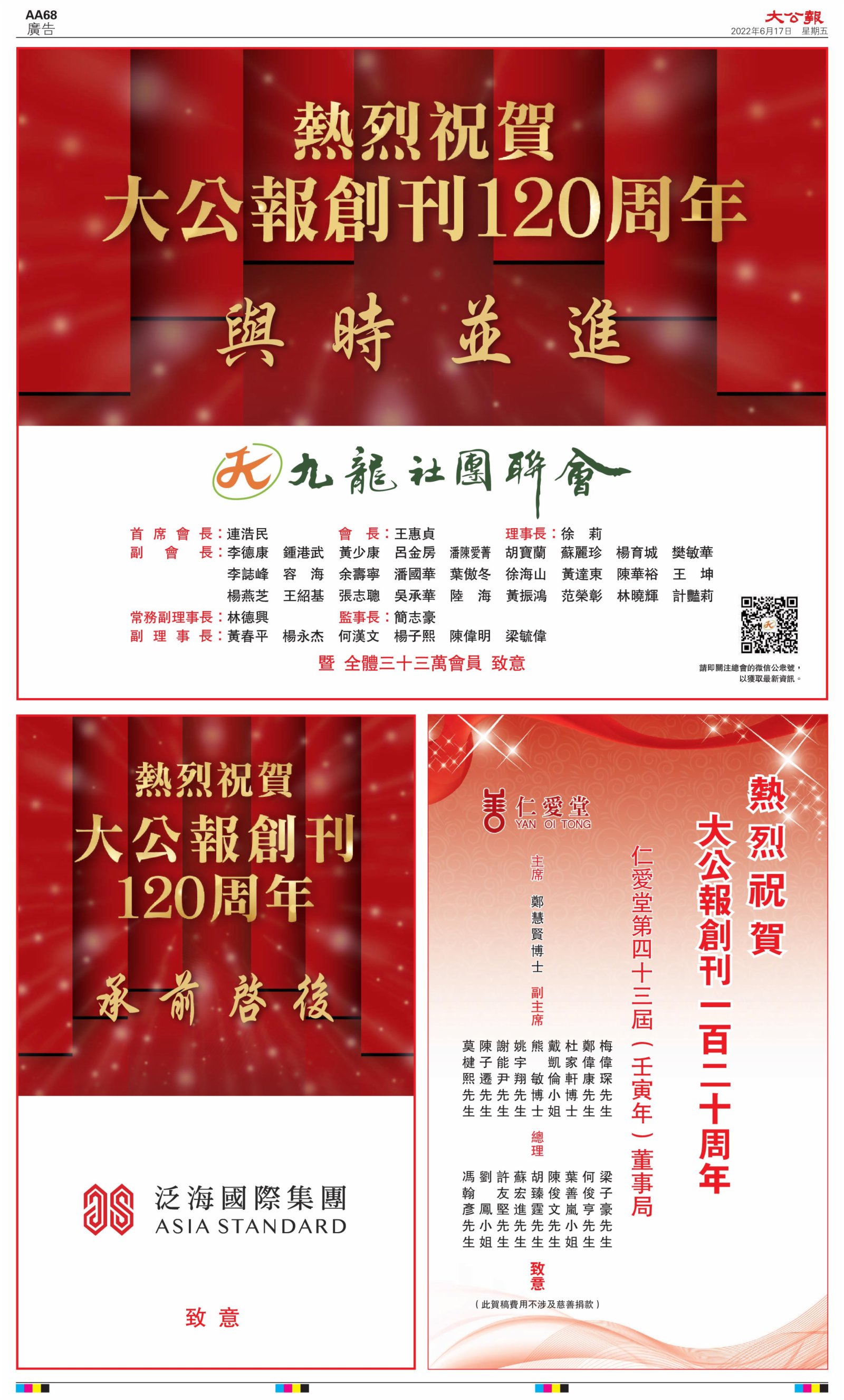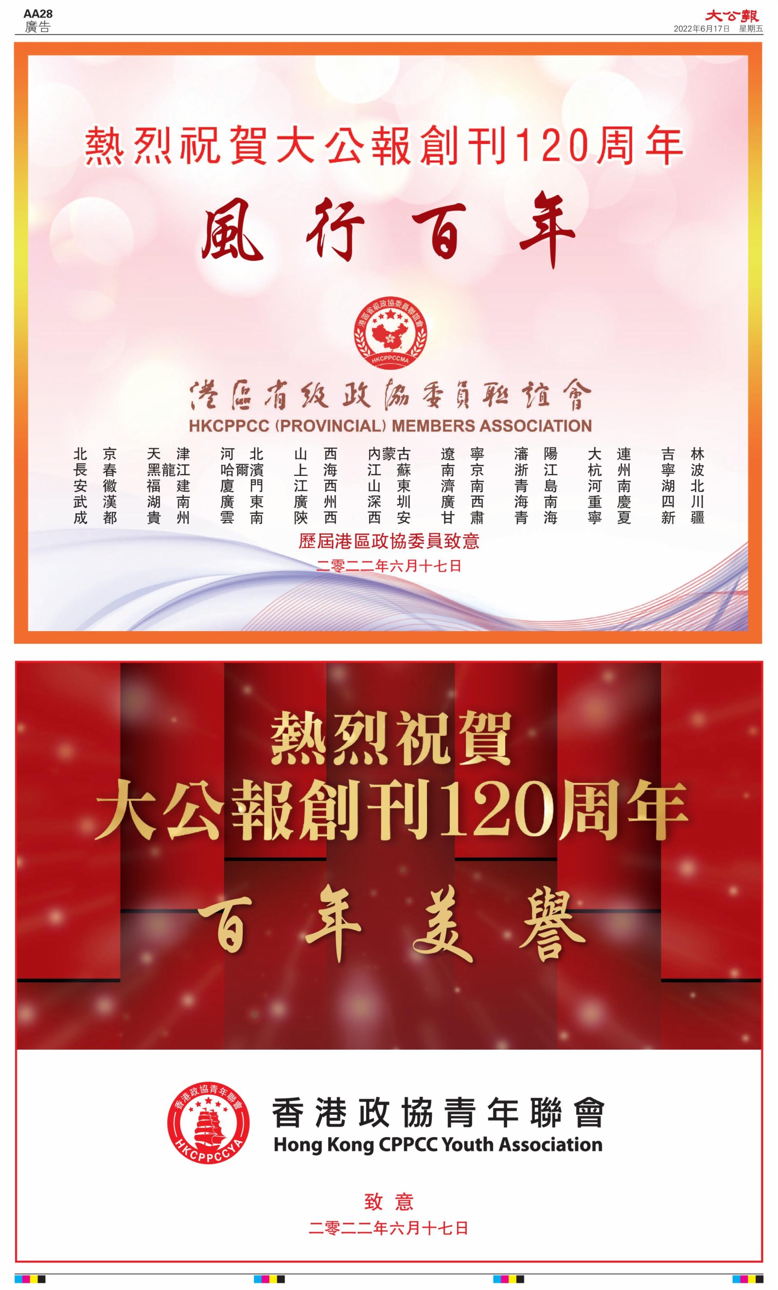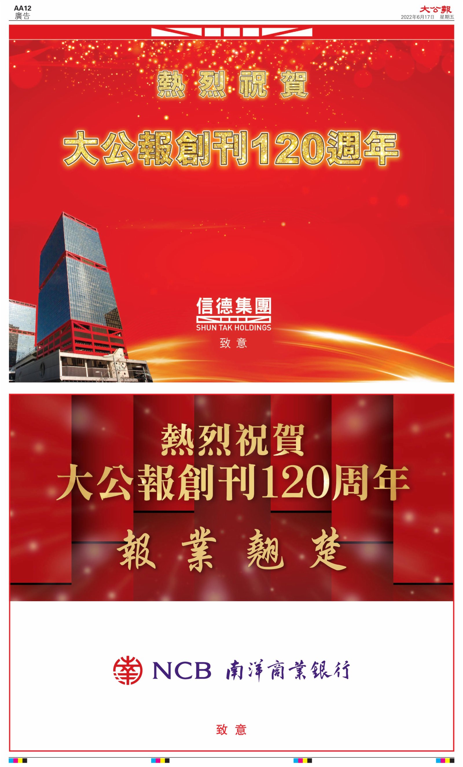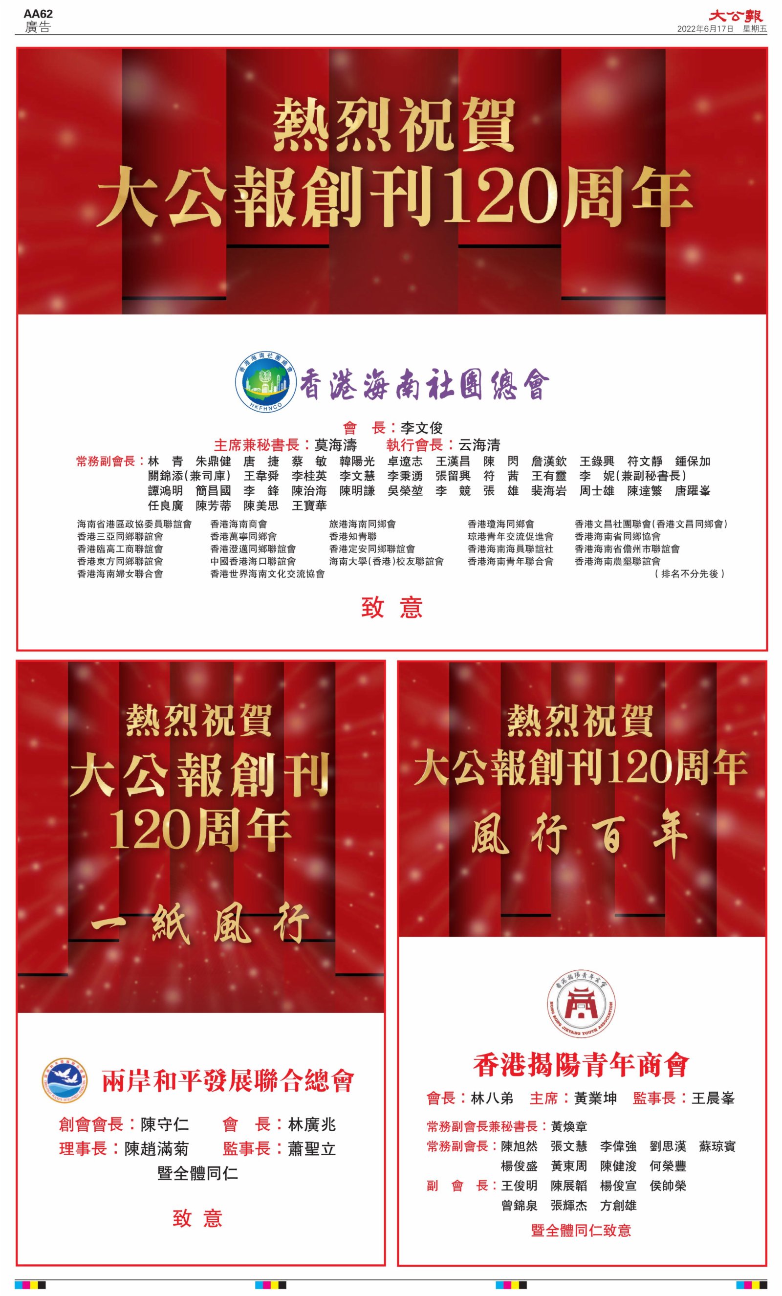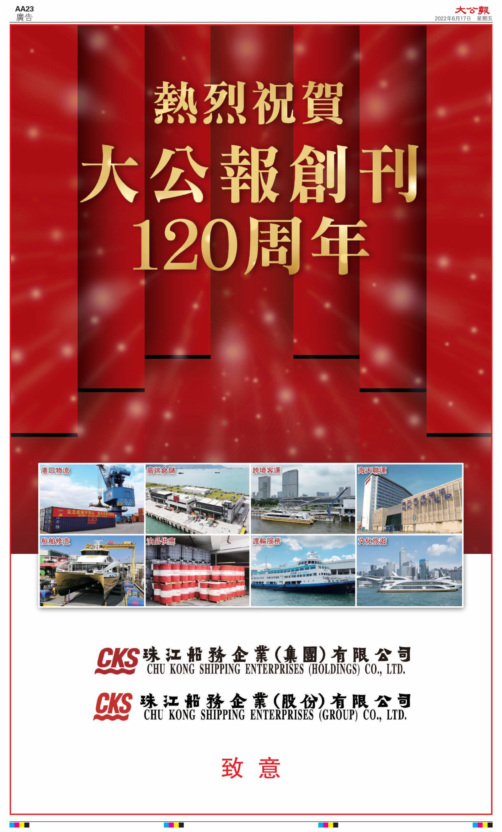 2022年6月17日是《大公報》創刊120周年紀念日,香港工商界、政黨、社團、協會、僑界、教育界、個人,及內地央企、內地企業、內地政府機構,澳門工商界,紛紛在《大公報》刊登廣告,共計100個版面,熱烈祝賀《大公報》創刊120周年。