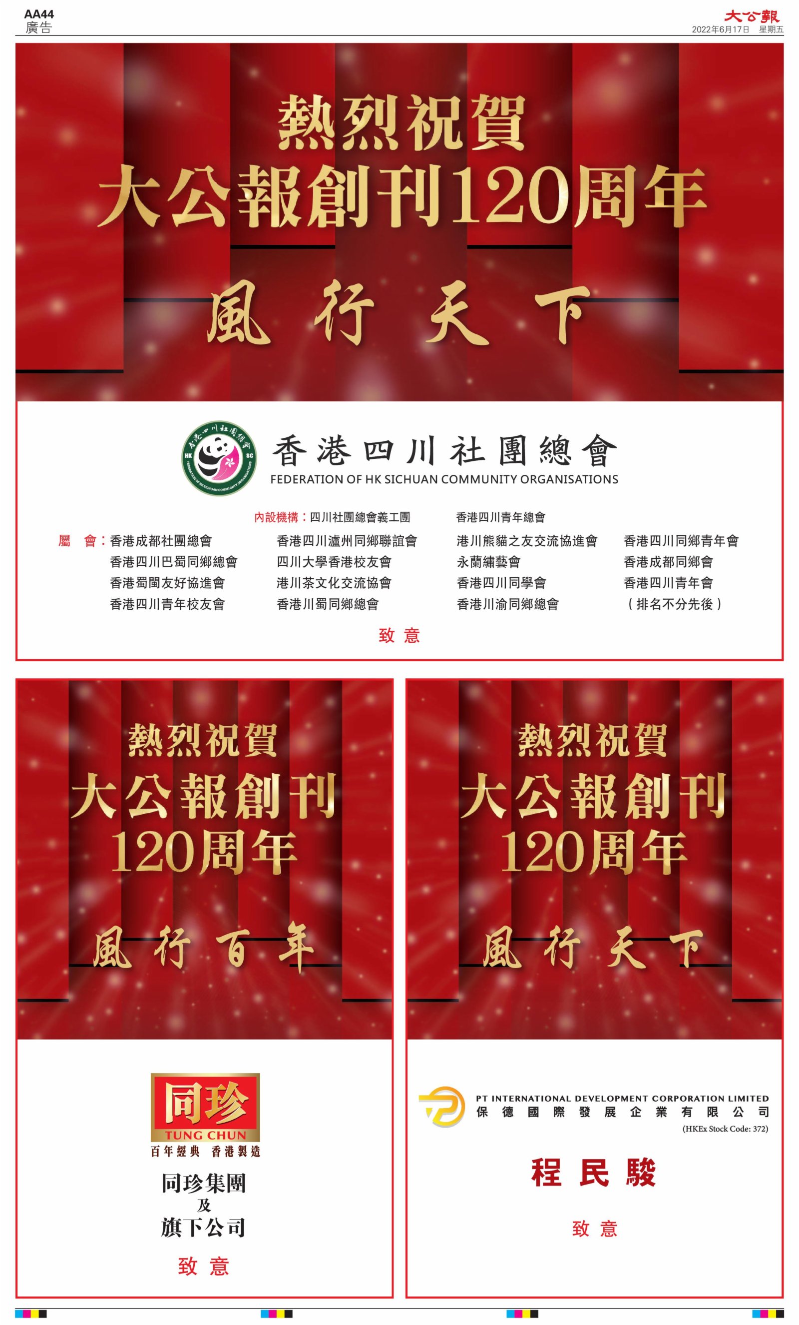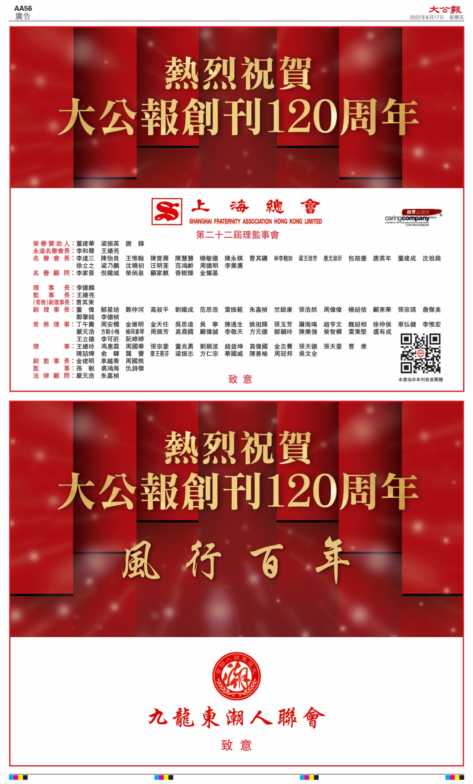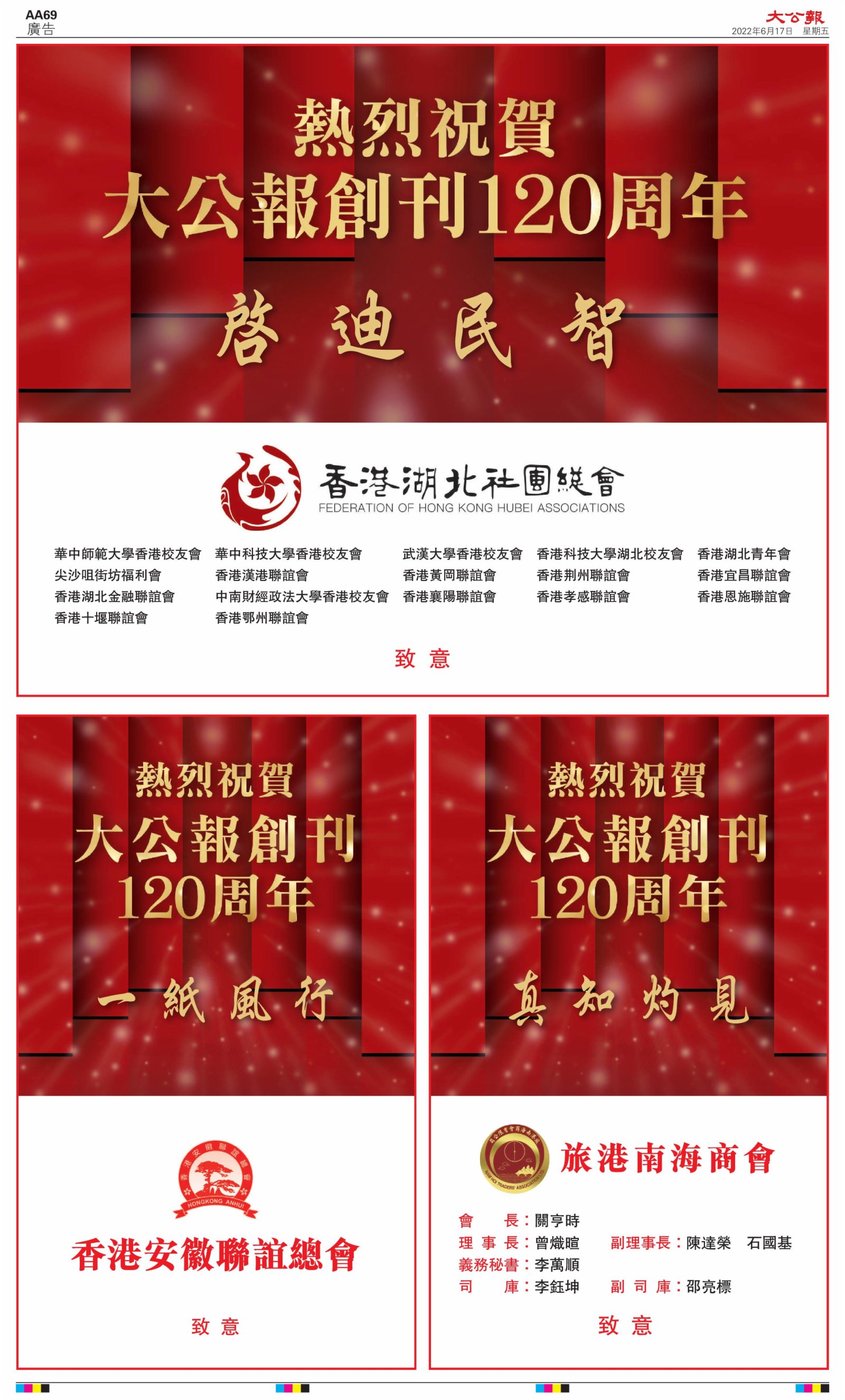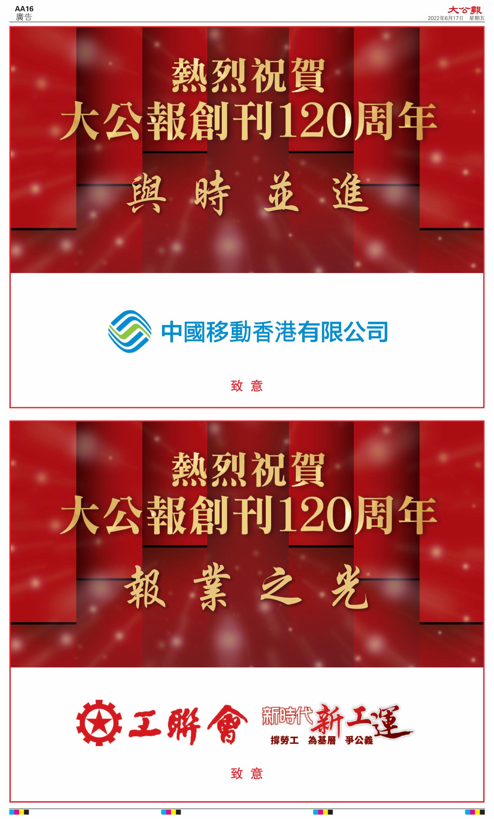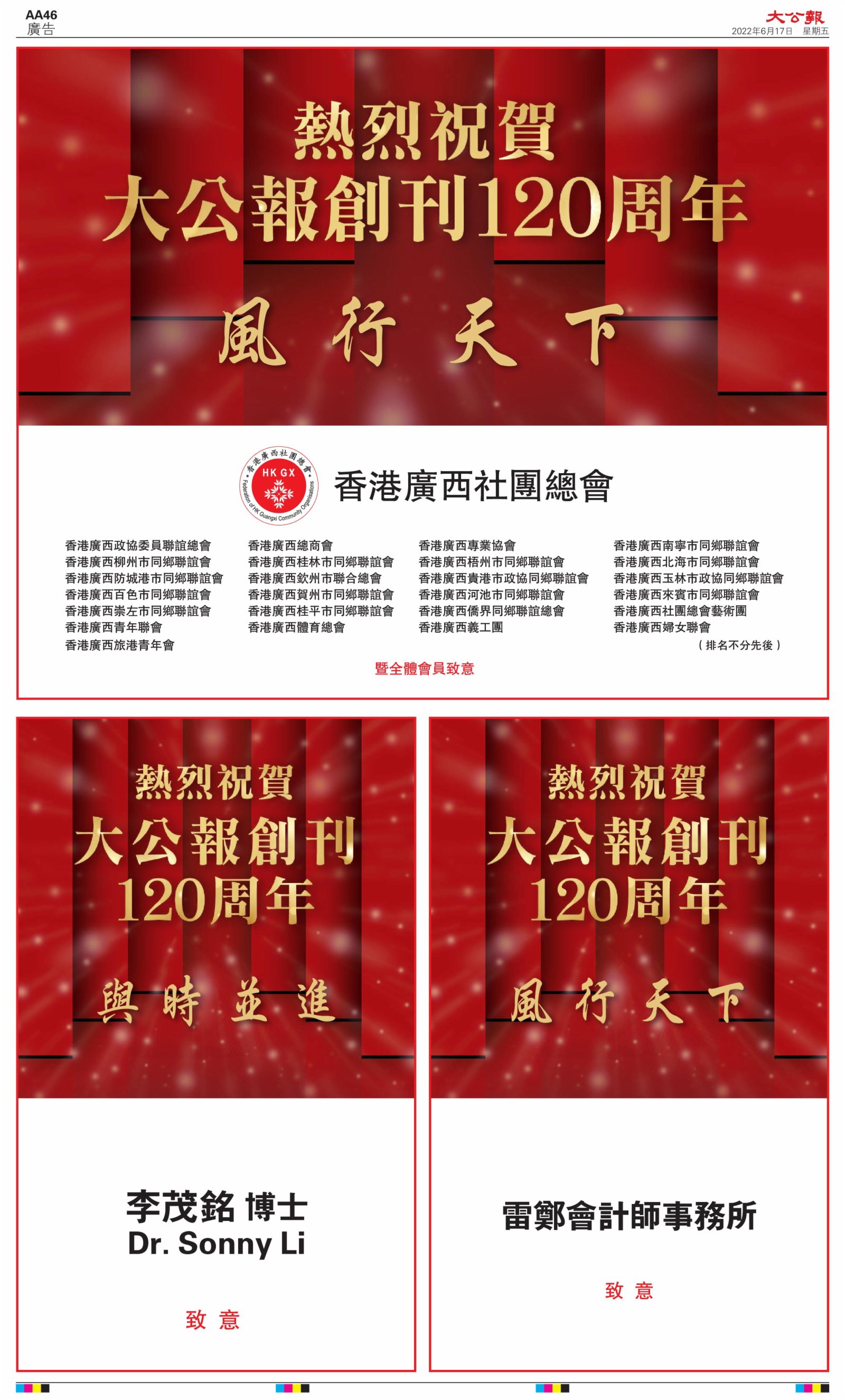 2022年6月17日是《大公報》創刊120周年紀念日,香港工商界、政黨、社團、協會、僑界、教育界、個人,及內地央企、內地企業、內地政府機構,澳門工商界,紛紛在《大公報》刊登廣告,共計100個版面,熱烈祝賀《大公報》創刊120周年。