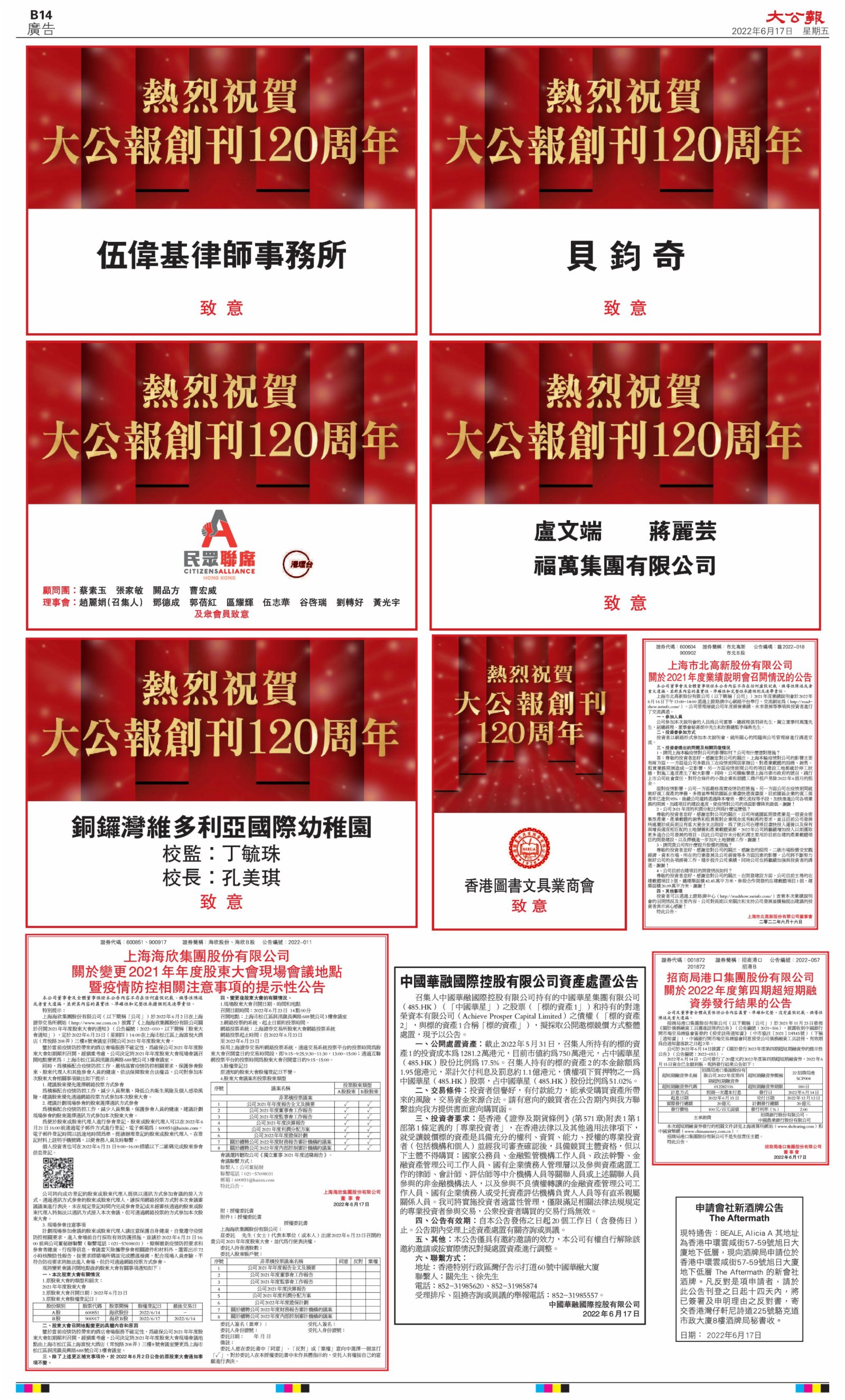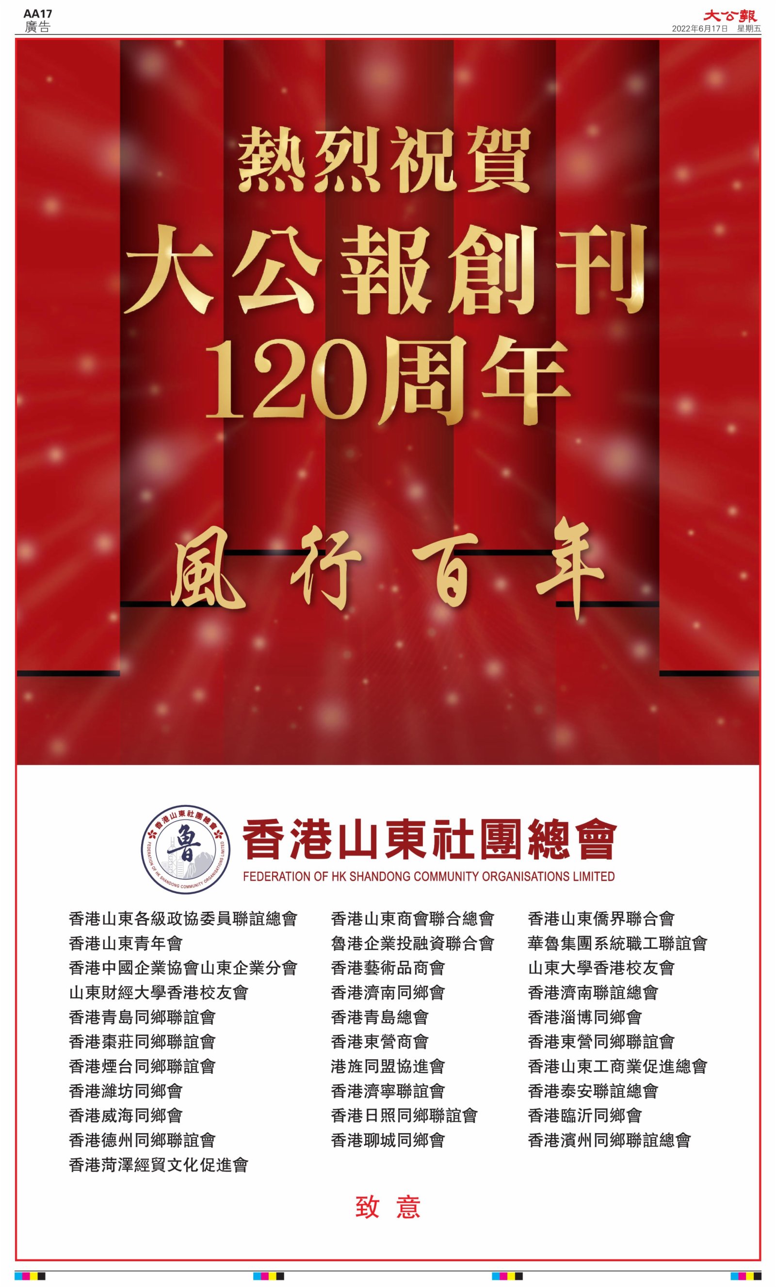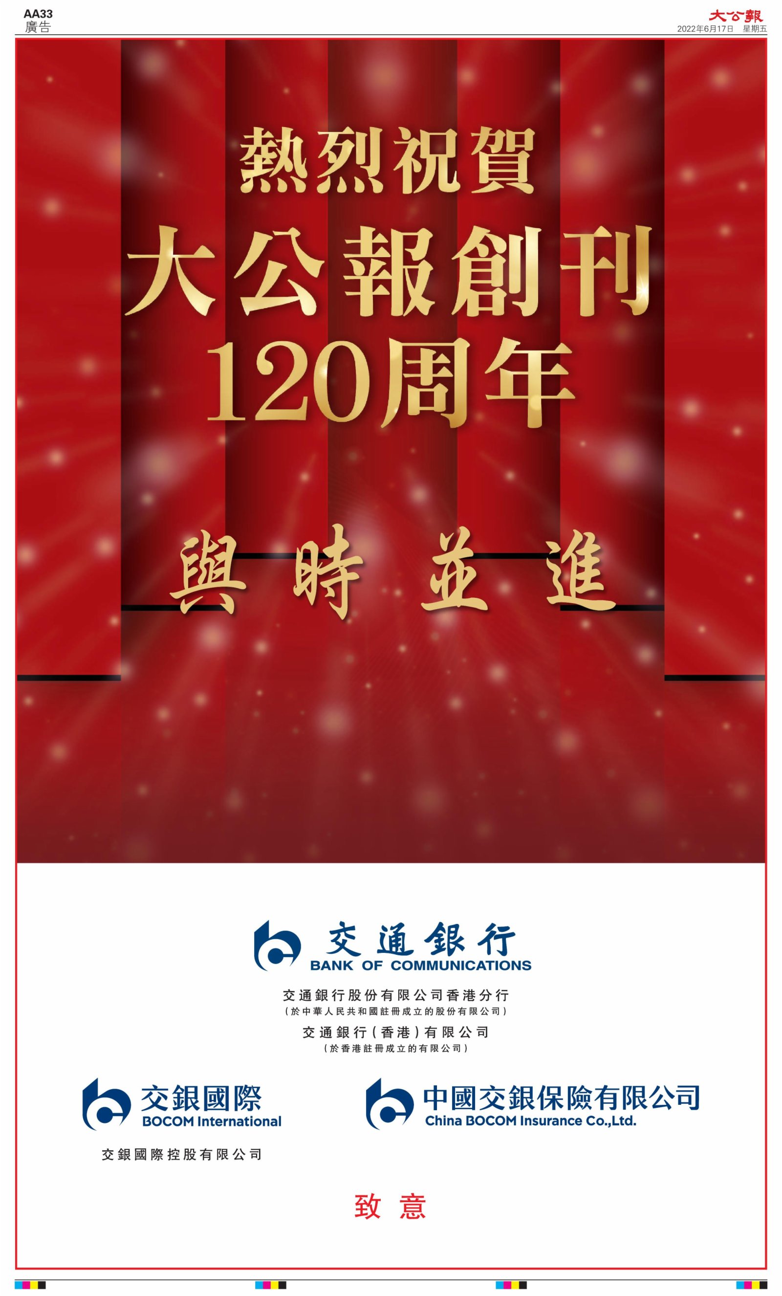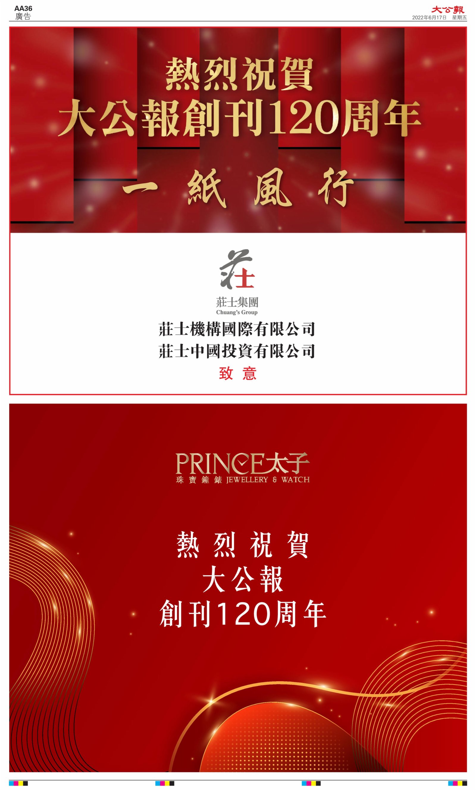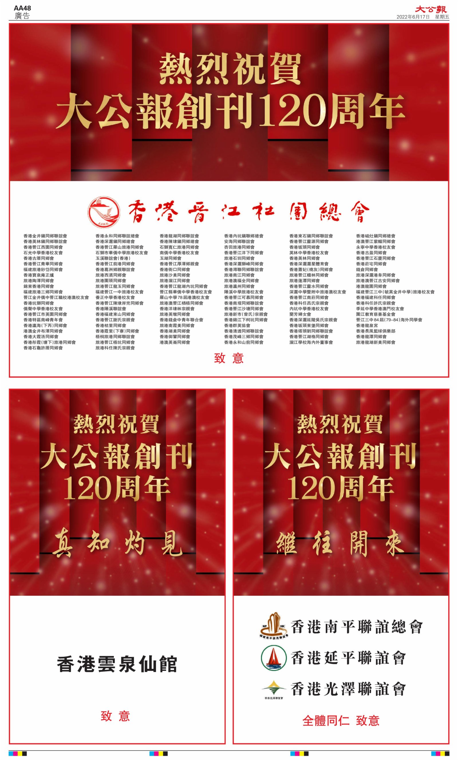 2022年6月17日是《大公報》創刊120周年紀念日,香港工商界、政黨、社團、協會、僑界、教育界、個人,及內地央企、內地企業、內地政府機構,澳門工商界,紛紛在《大公報》刊登廣告,共計100個版面,熱烈祝賀《大公報》創刊120周年。