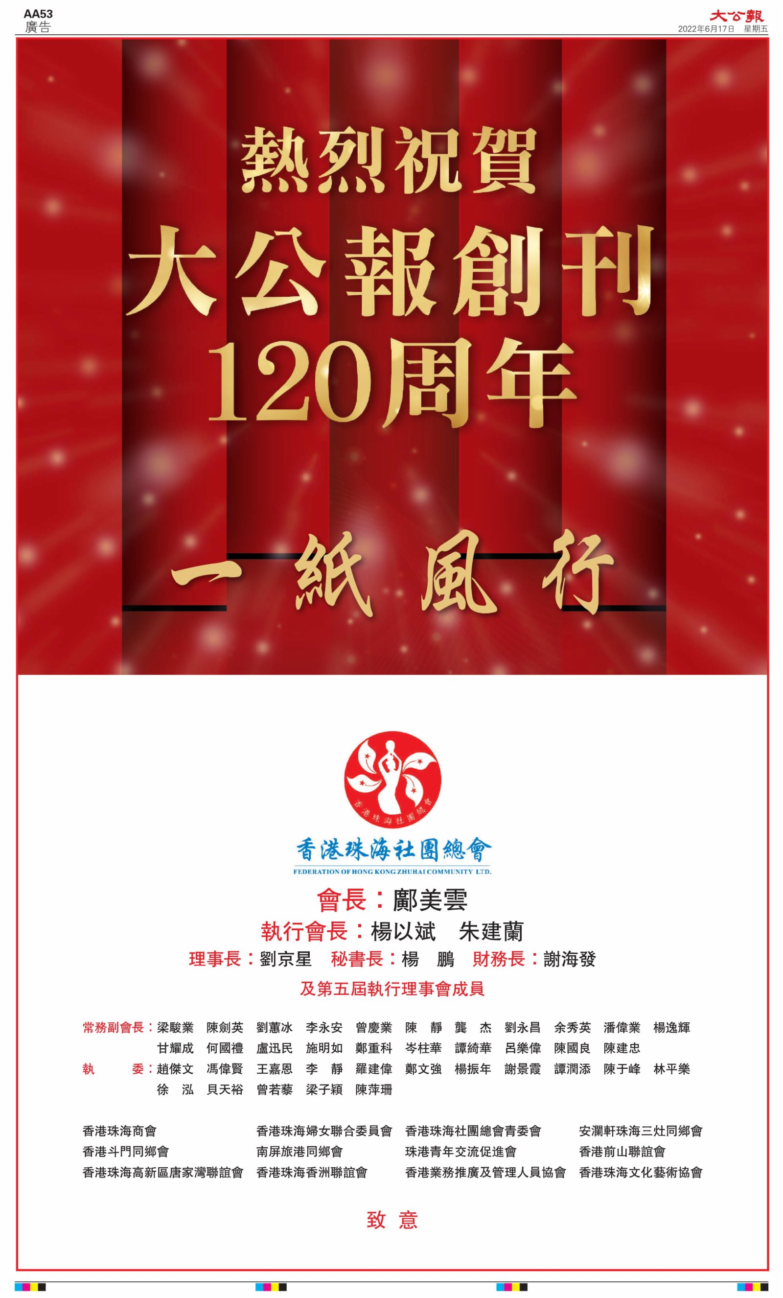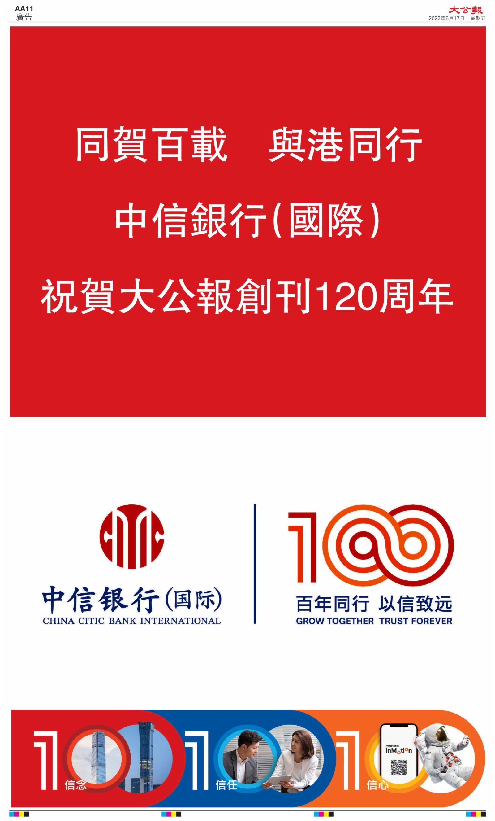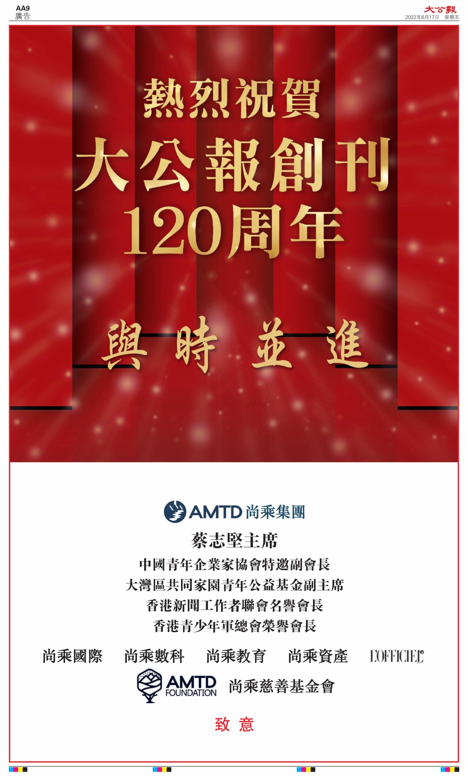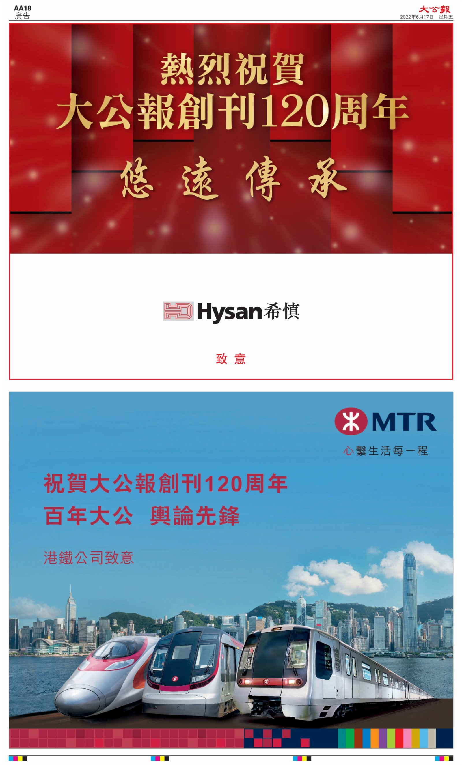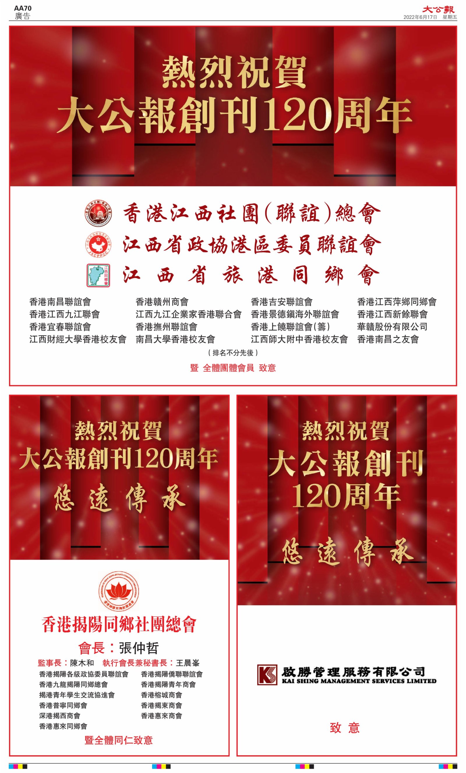 2022年6月17日是《大公報》創刊120周年紀念日,香港工商界、政黨、社團、協會、僑界、教育界、個人,及內地央企、內地企業、內地政府機構,澳門工商界,紛紛在《大公報》刊登廣告,共計100個版面,熱烈祝賀《大公報》創刊120周年。