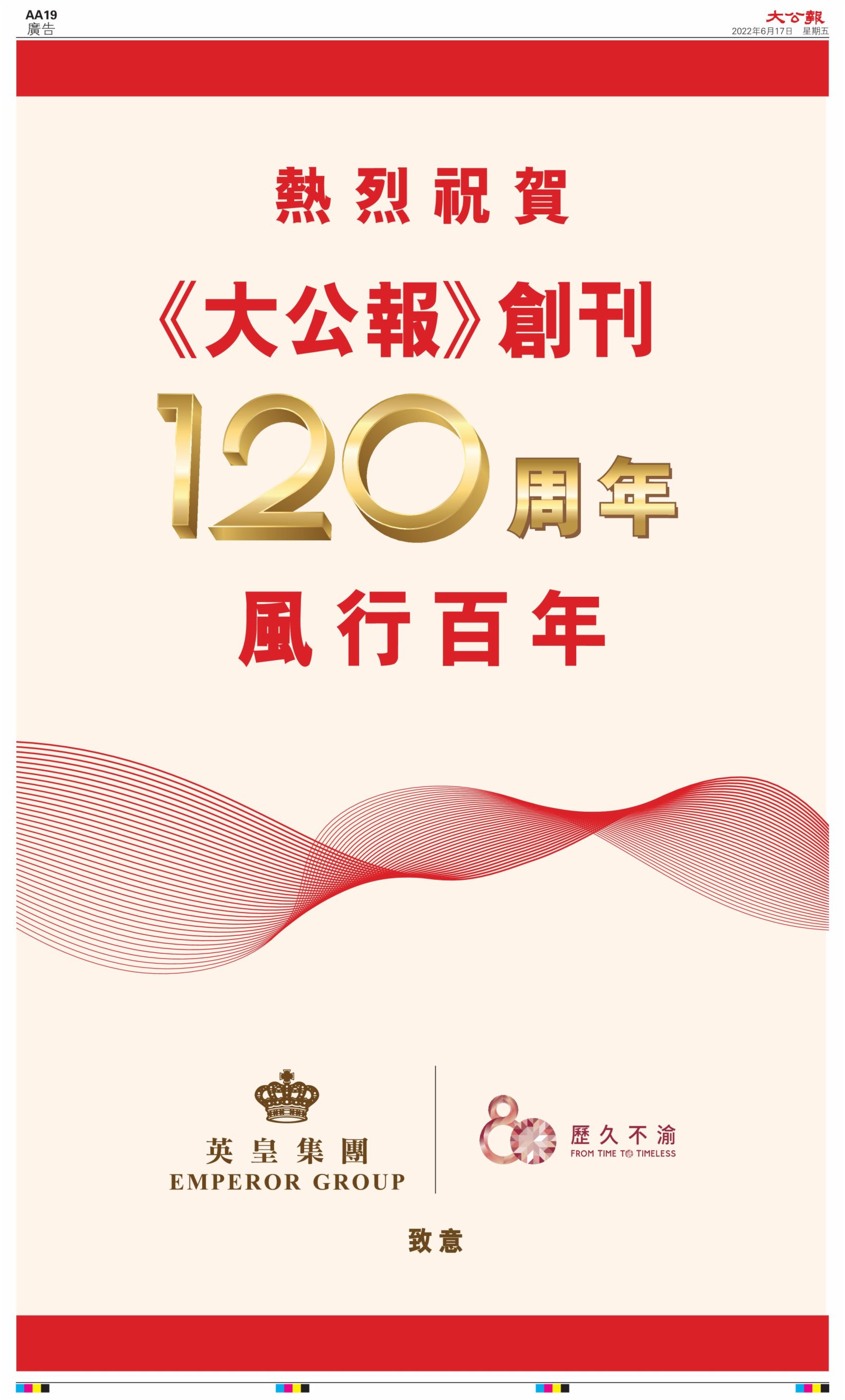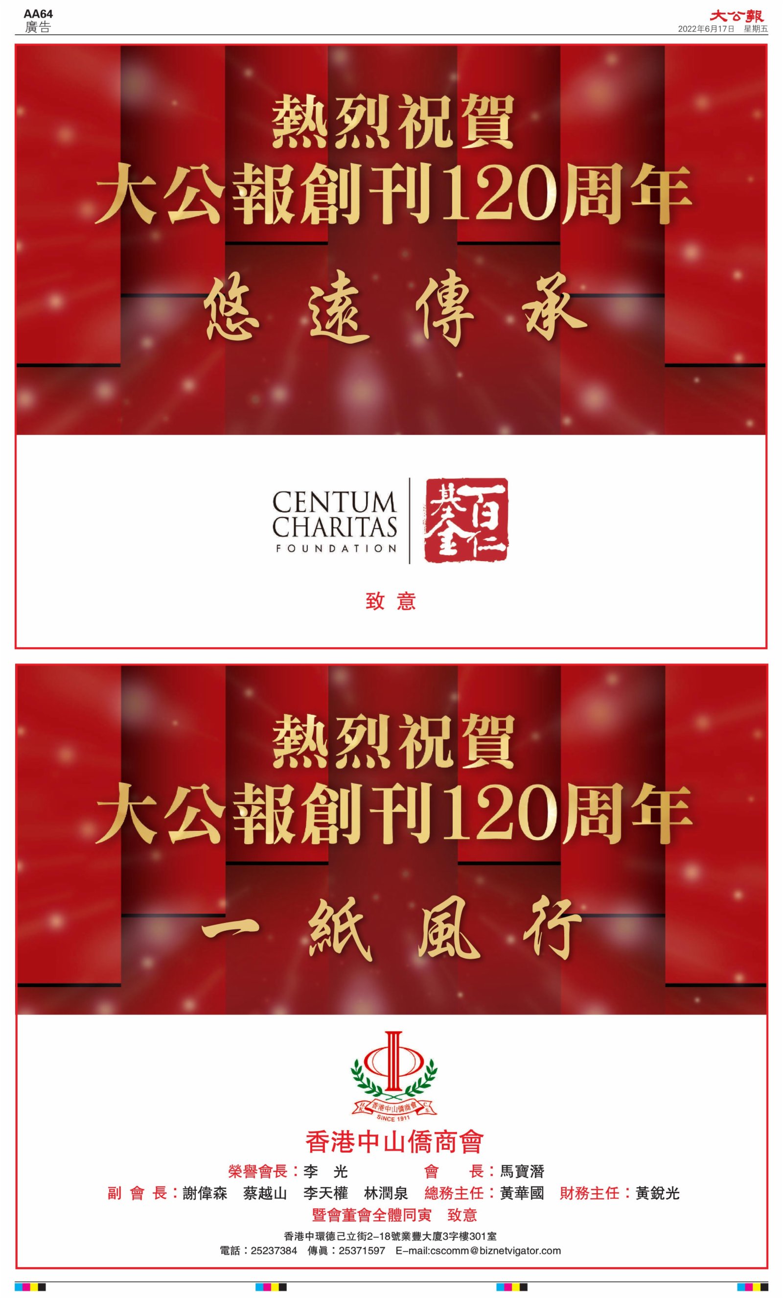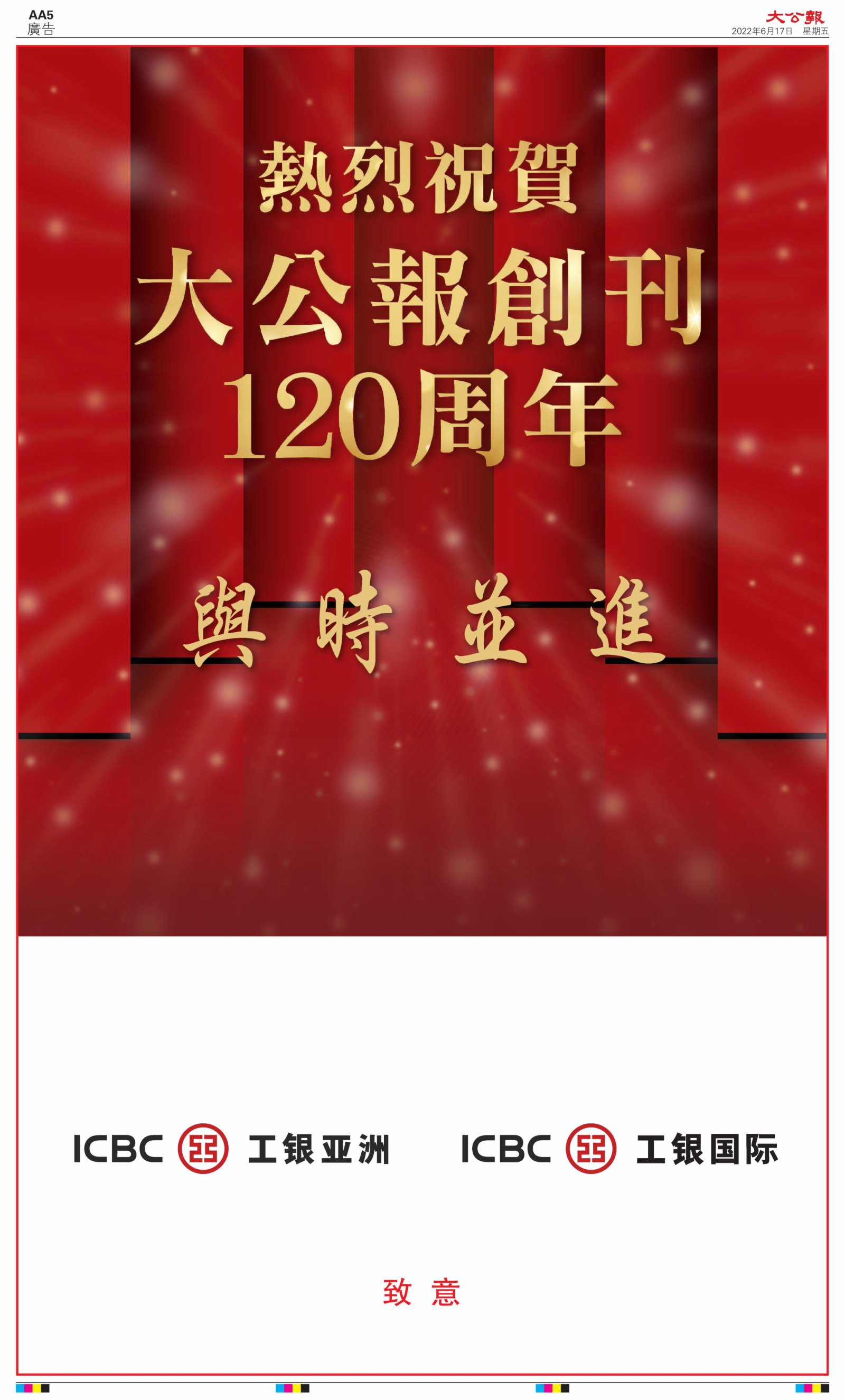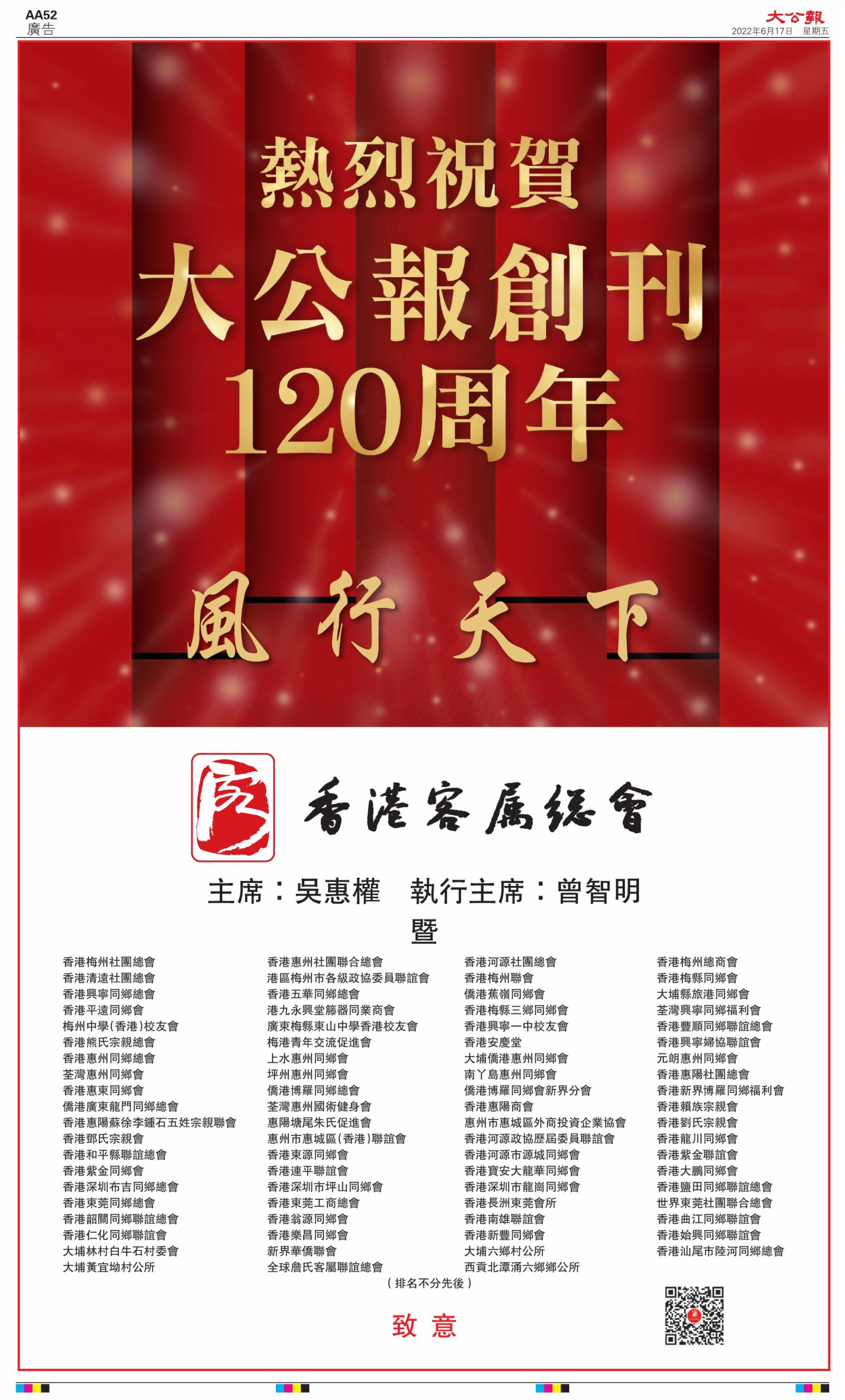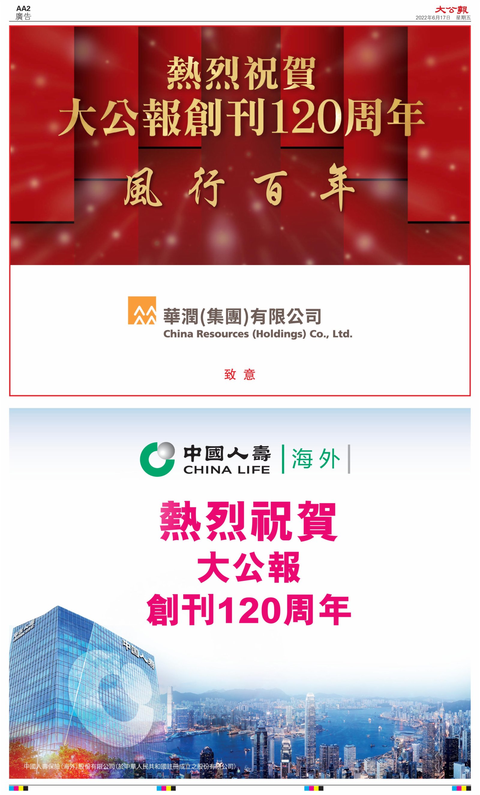 2022年6月17日是《大公報》創刊120周年紀念日,香港工商界、政黨、社團、協會、僑界、教育界、個人,及內地央企、內地企業、內地政府機構,澳門工商界,紛紛在《大公報》刊登廣告,共計100個版面,熱烈祝賀《大公報》創刊120周年。