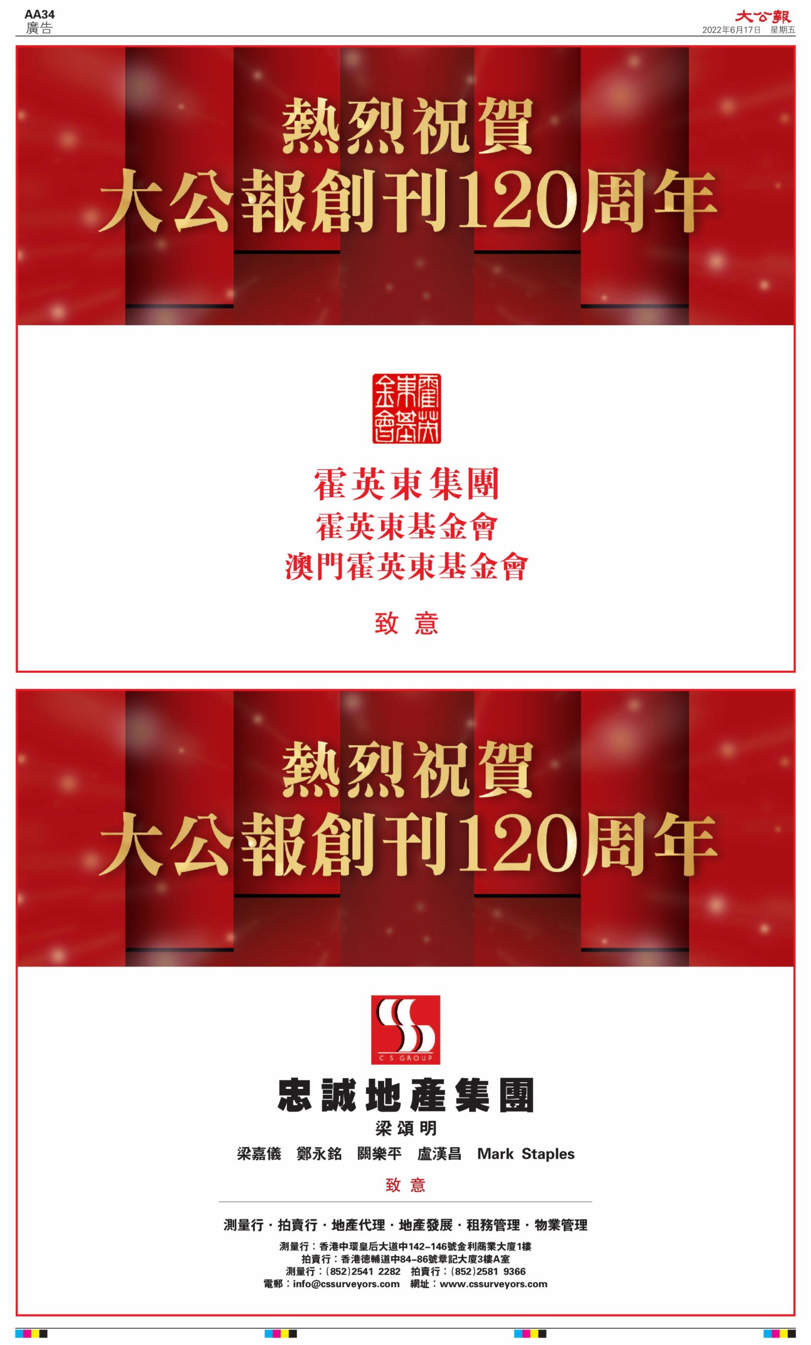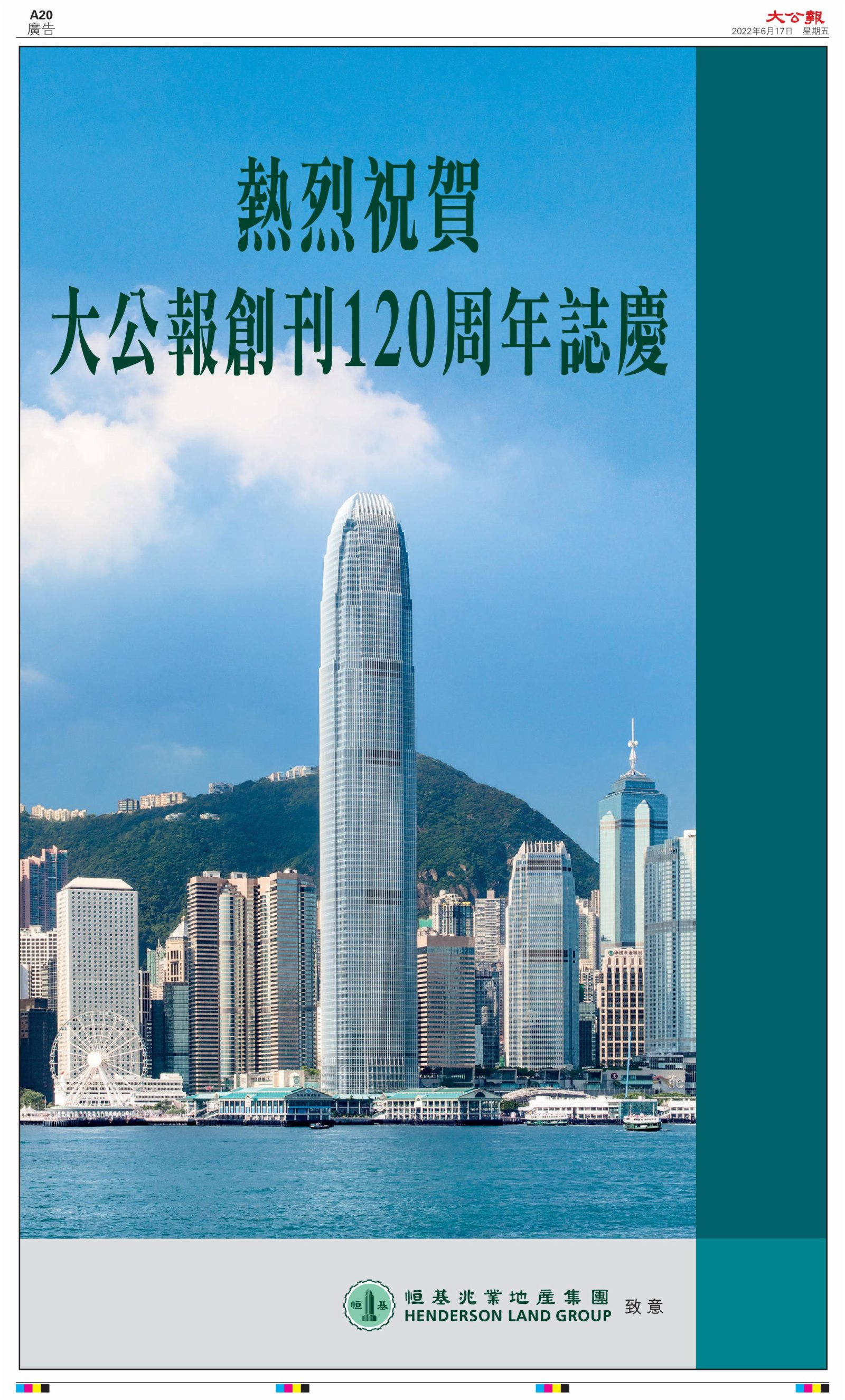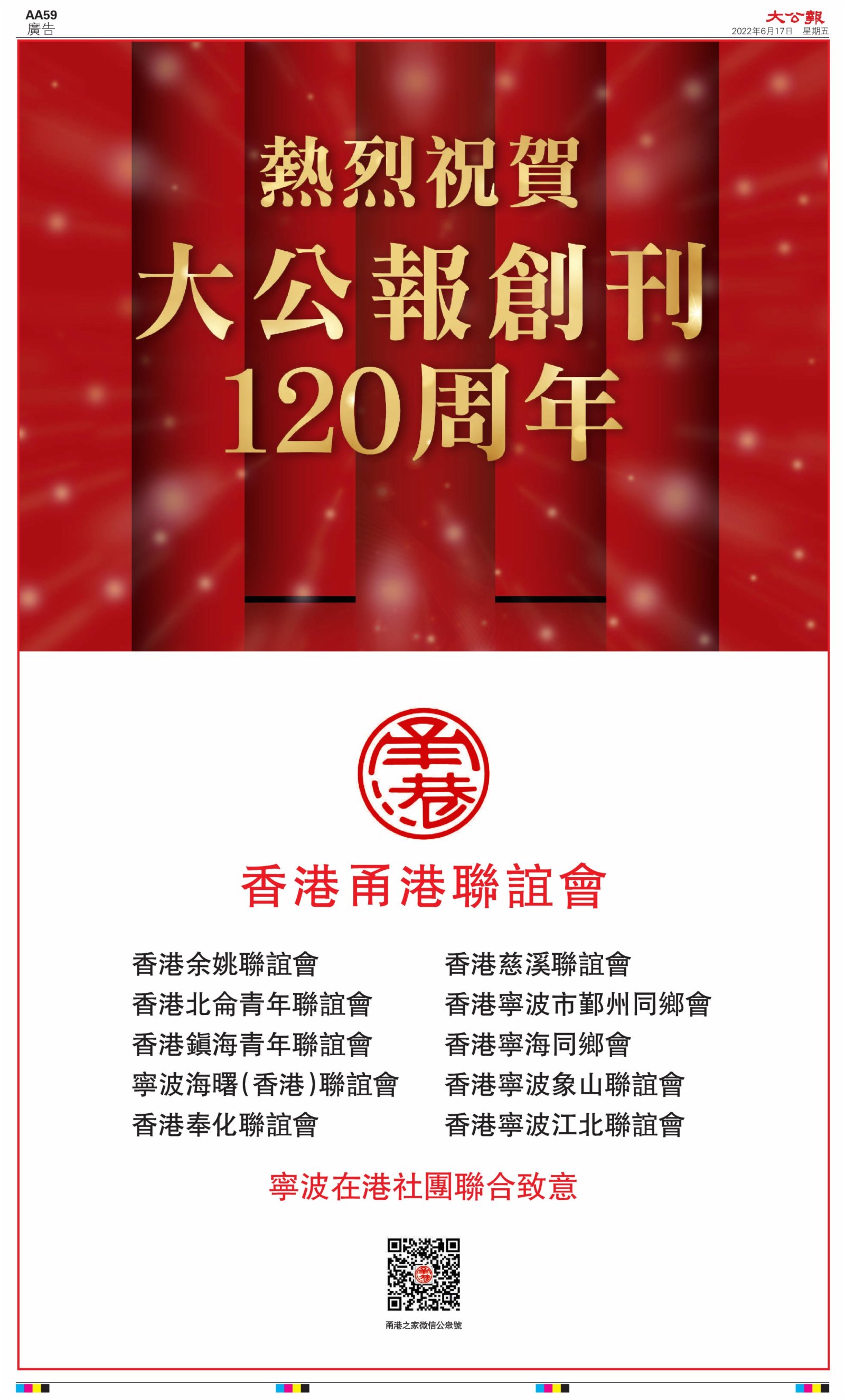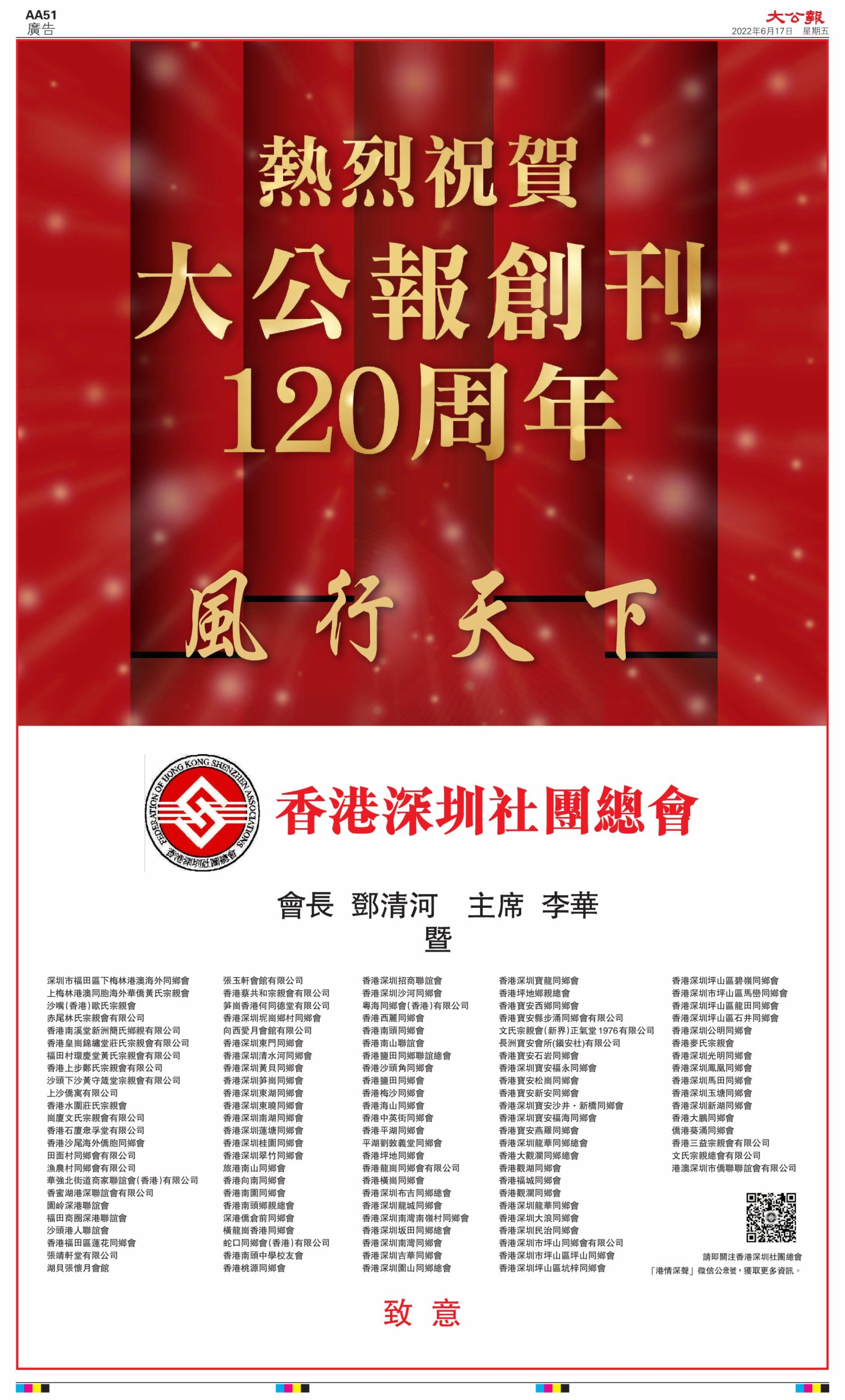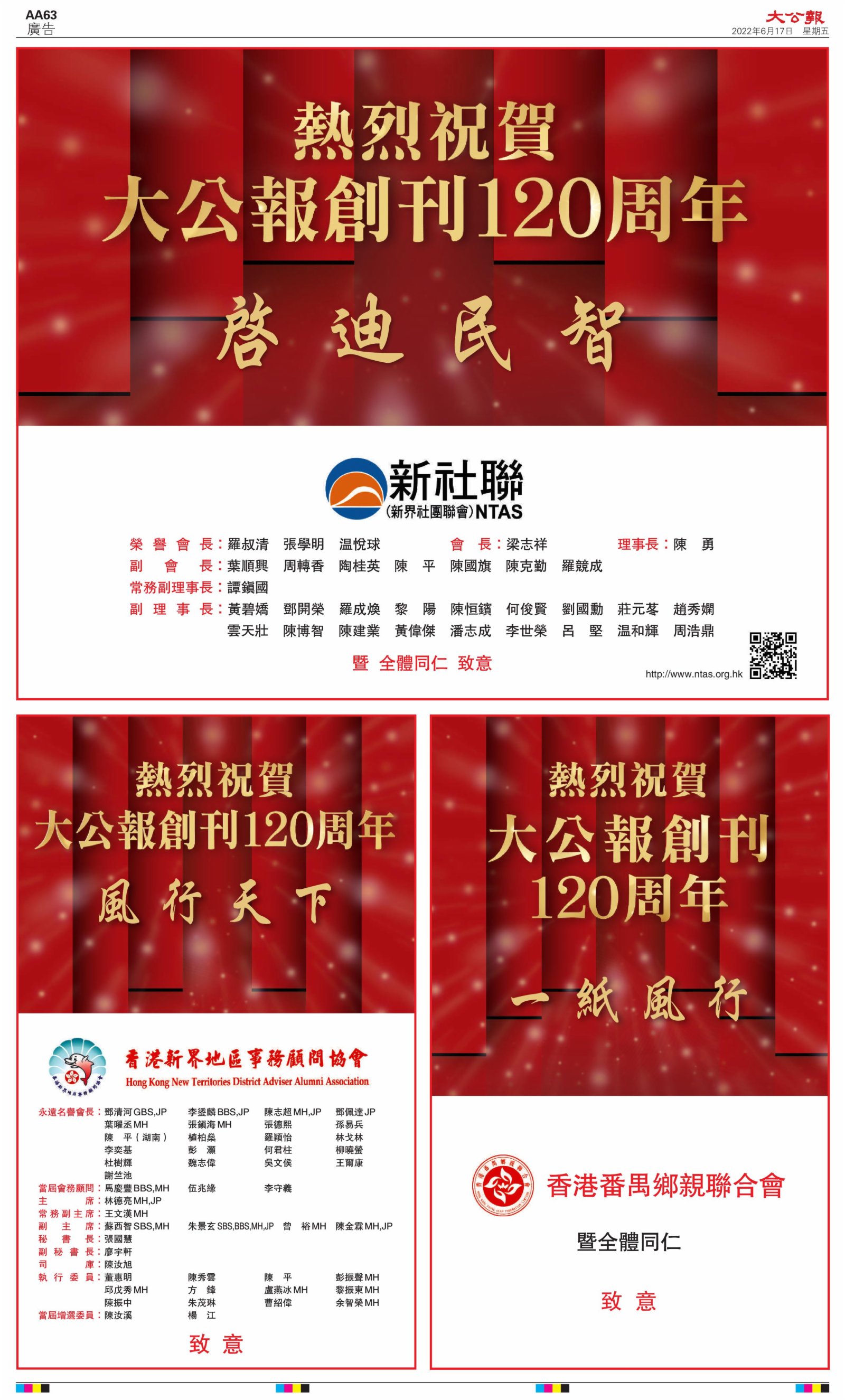 2022年6月17日是《大公報》創刊120周年紀念日,香港工商界、政黨、社團、協會、僑界、教育界、個人,及內地央企、內地企業、內地政府機構,澳門工商界,紛紛在《大公報》刊登廣告,共計100個版面,熱烈祝賀《大公報》創刊120周年。