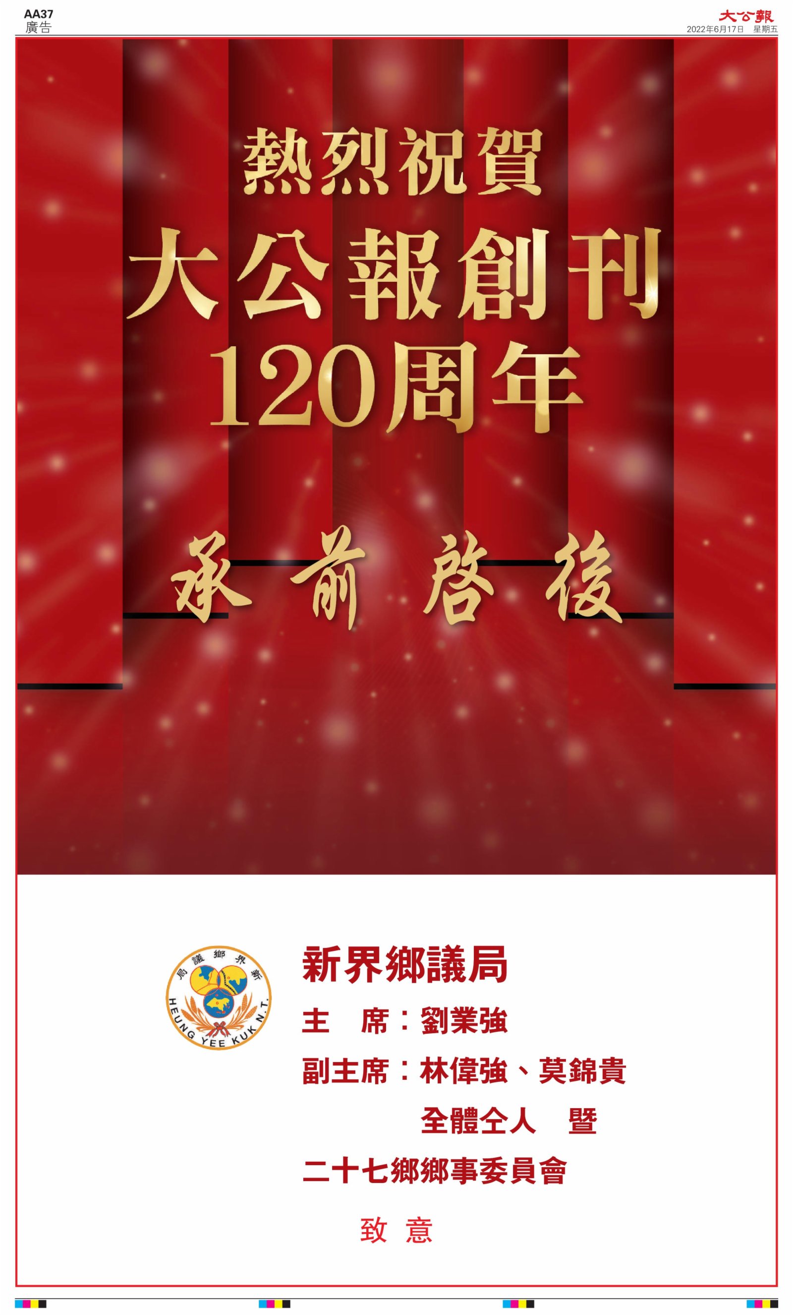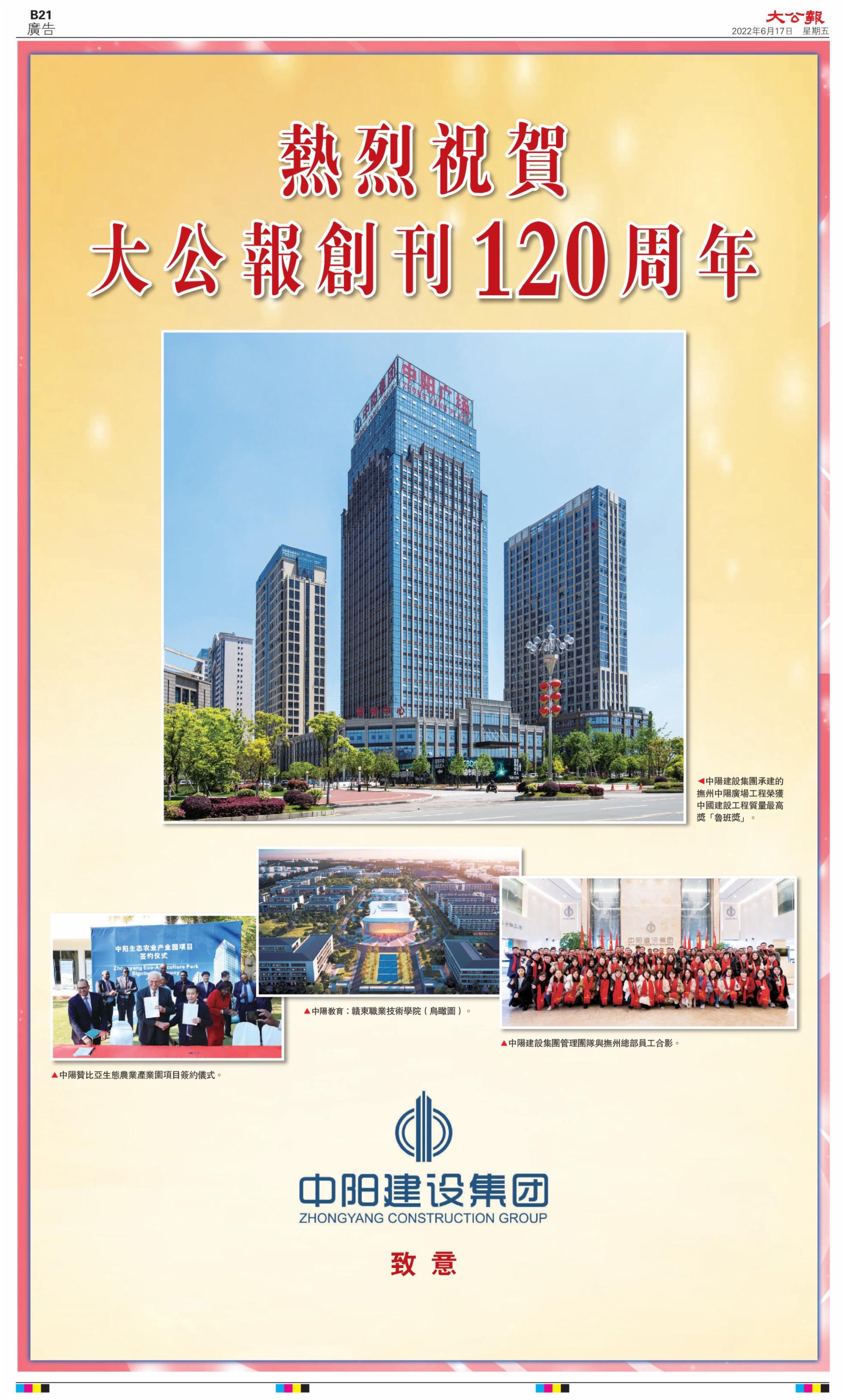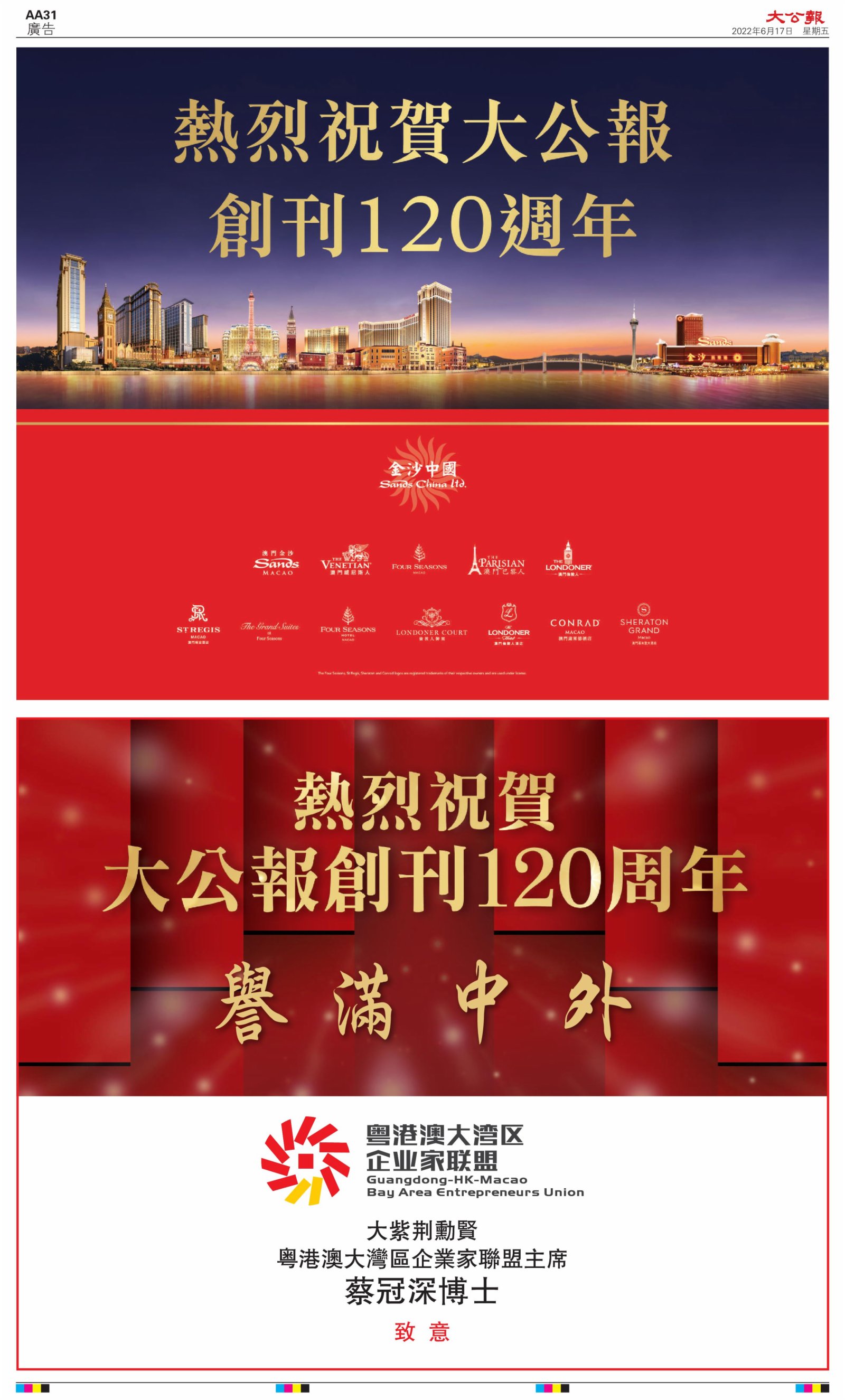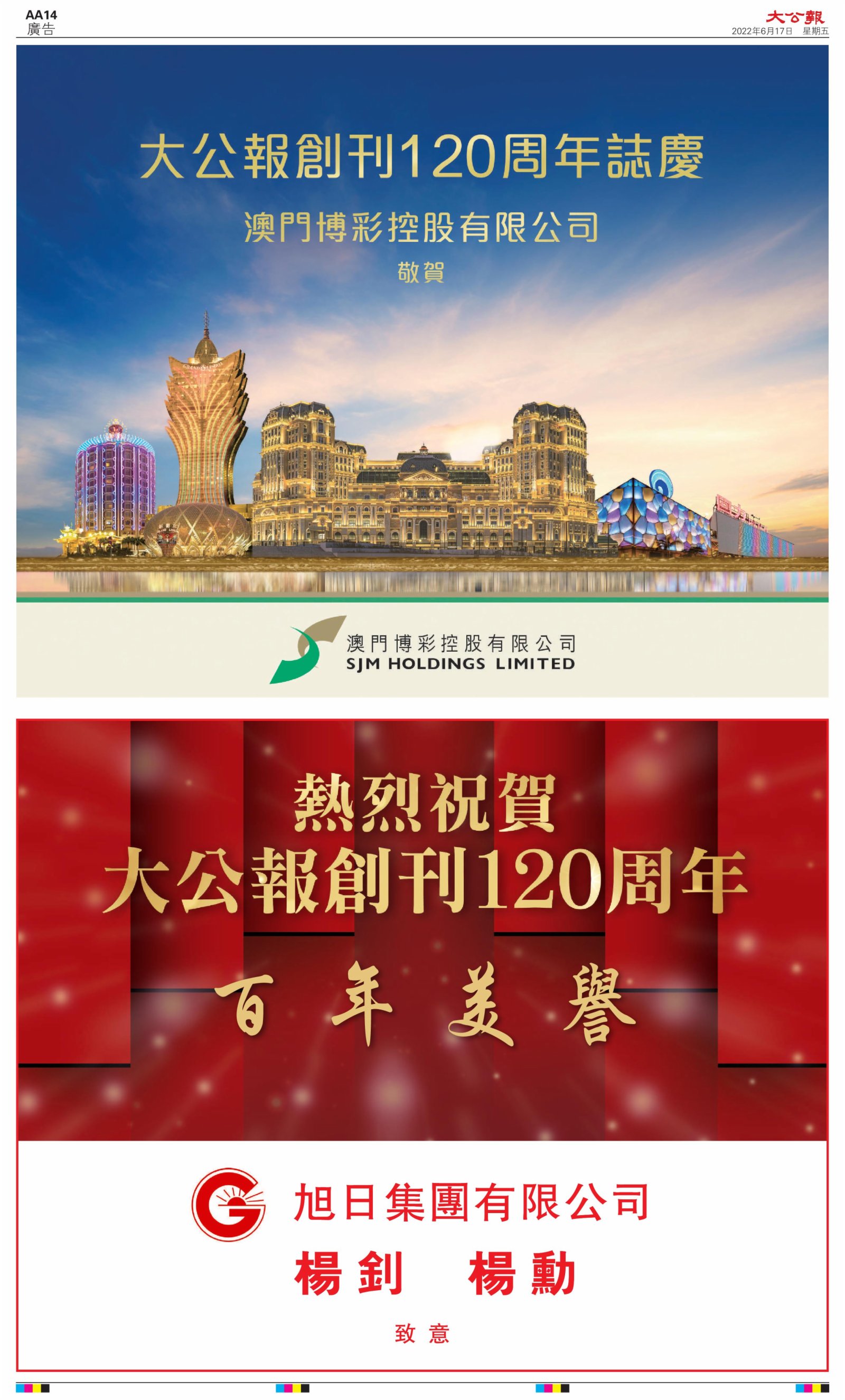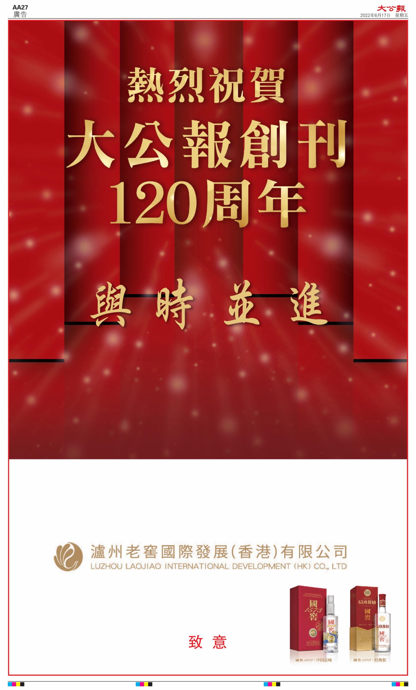 2022年6月17日是《大公報》創刊120周年紀念日,香港工商界、政黨、社團、協會、僑界、教育界、個人,及內地央企、內地企業、內地政府機構,澳門工商界,紛紛在《大公報》刊登廣告,共計100個版面,熱烈祝賀《大公報》創刊120周年。