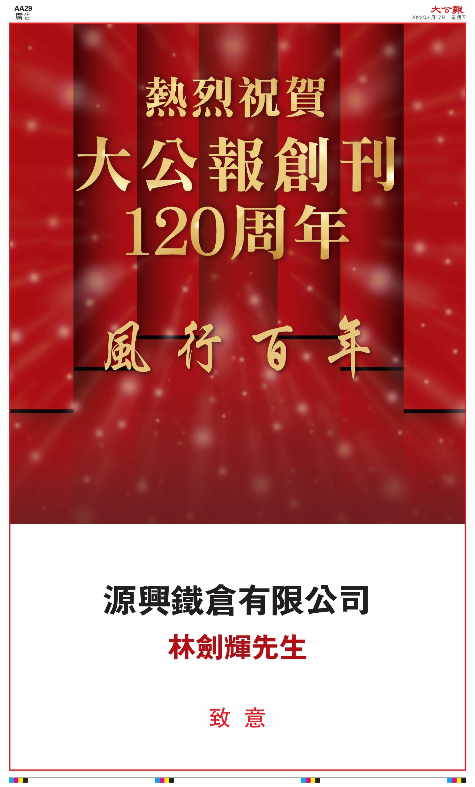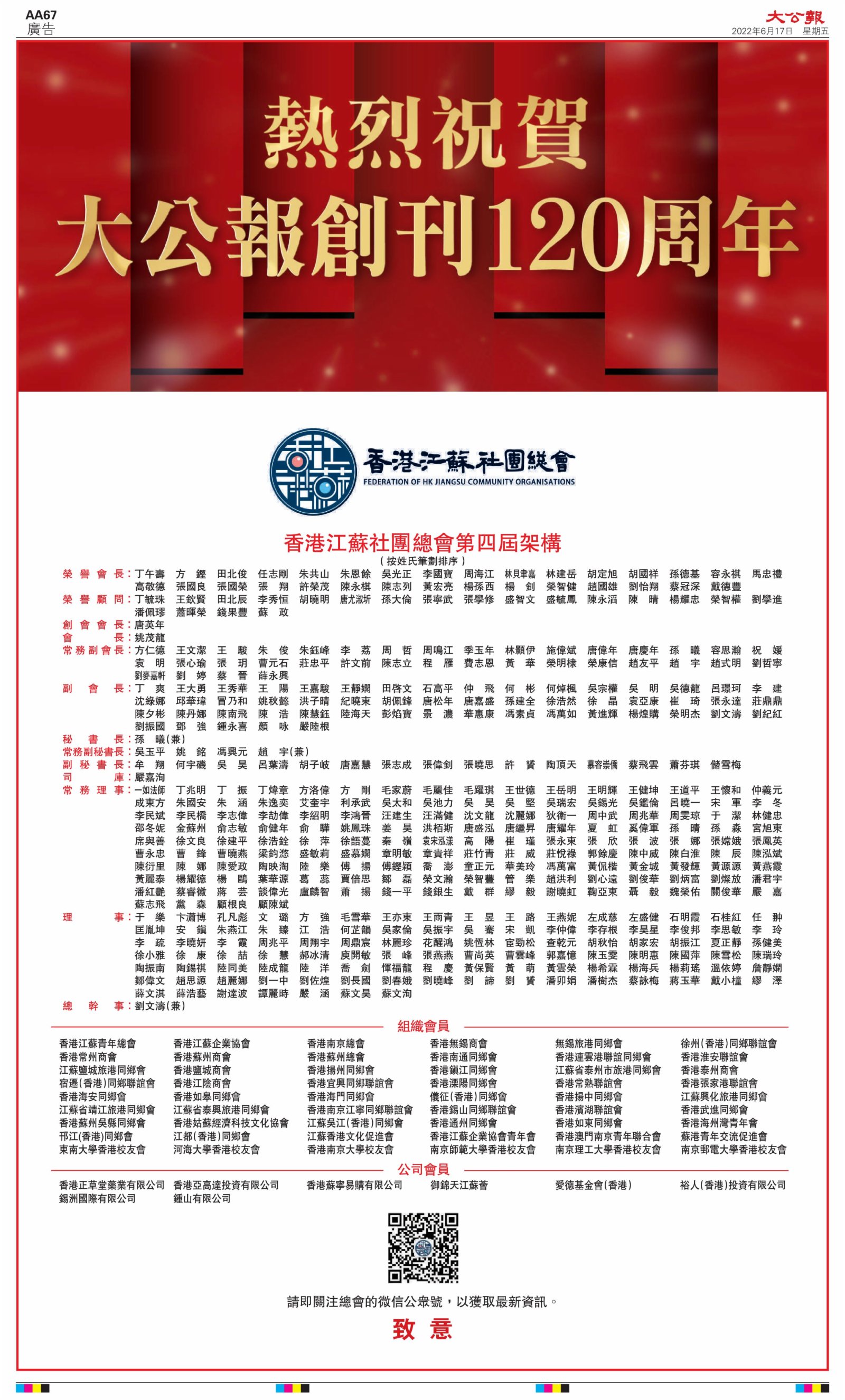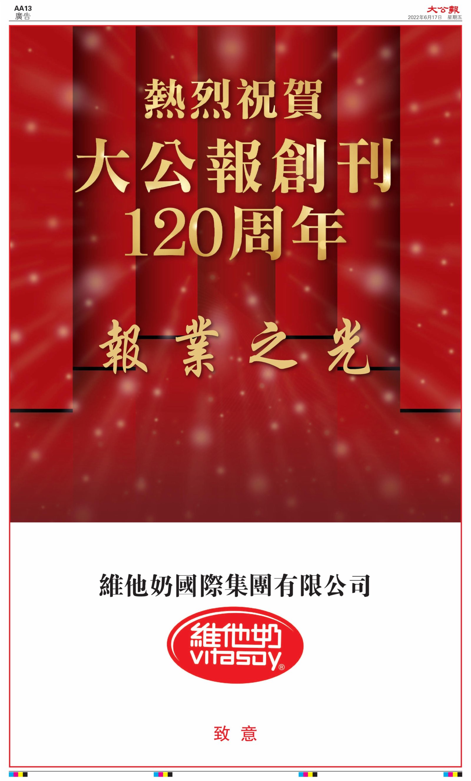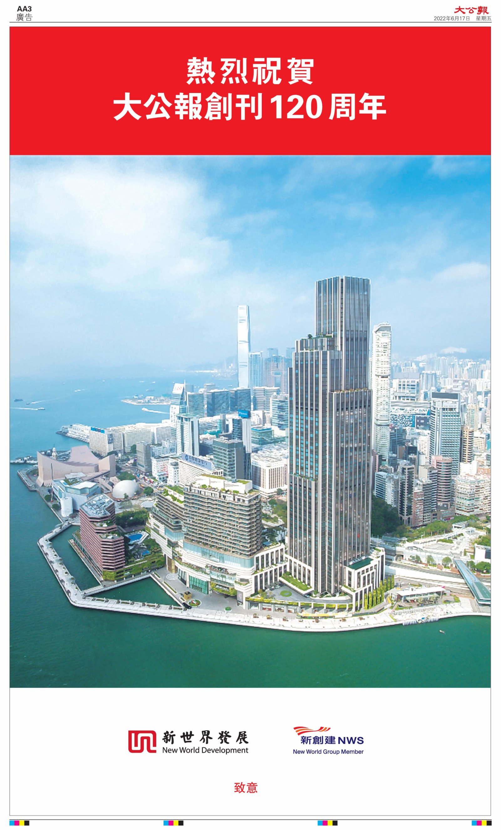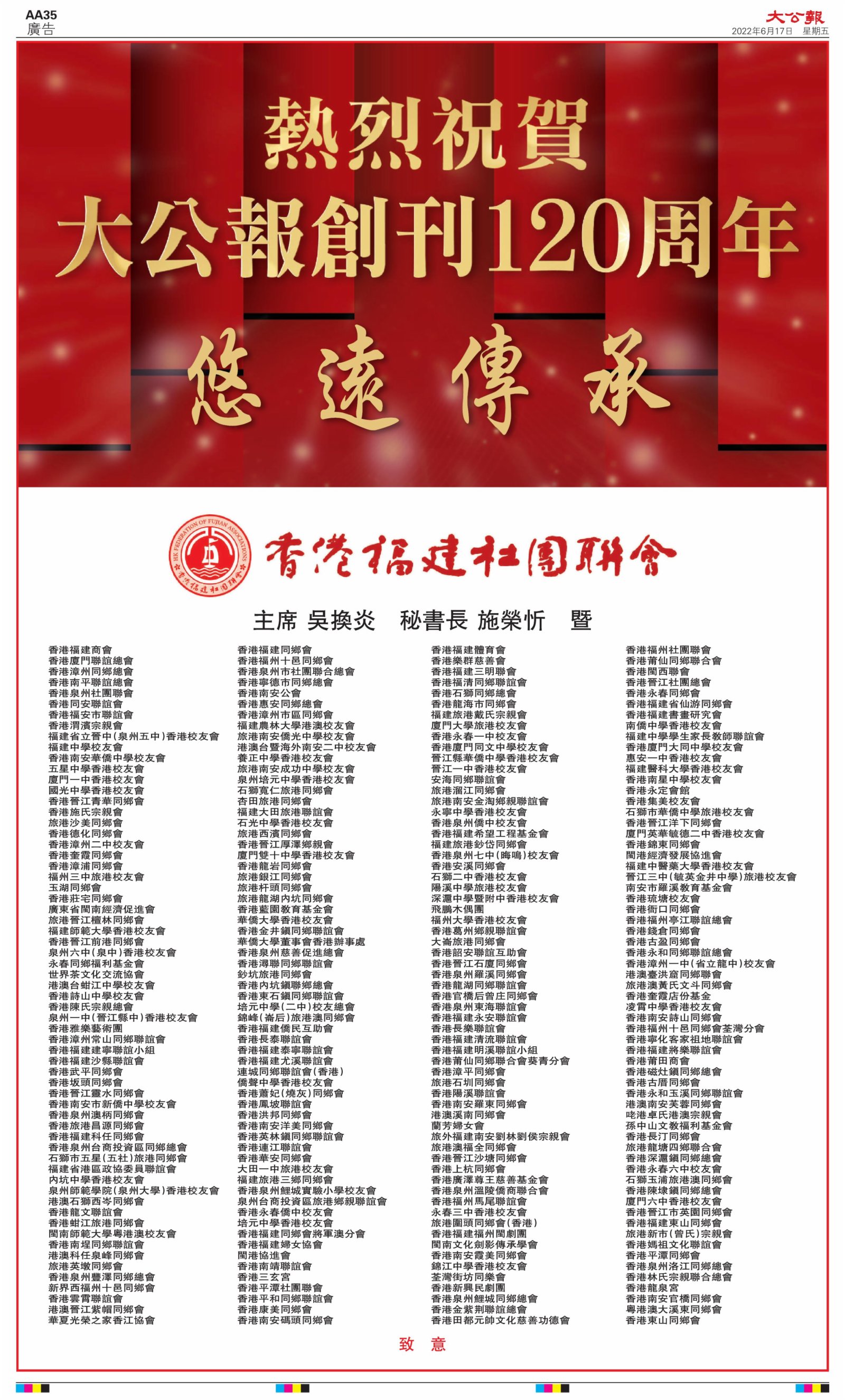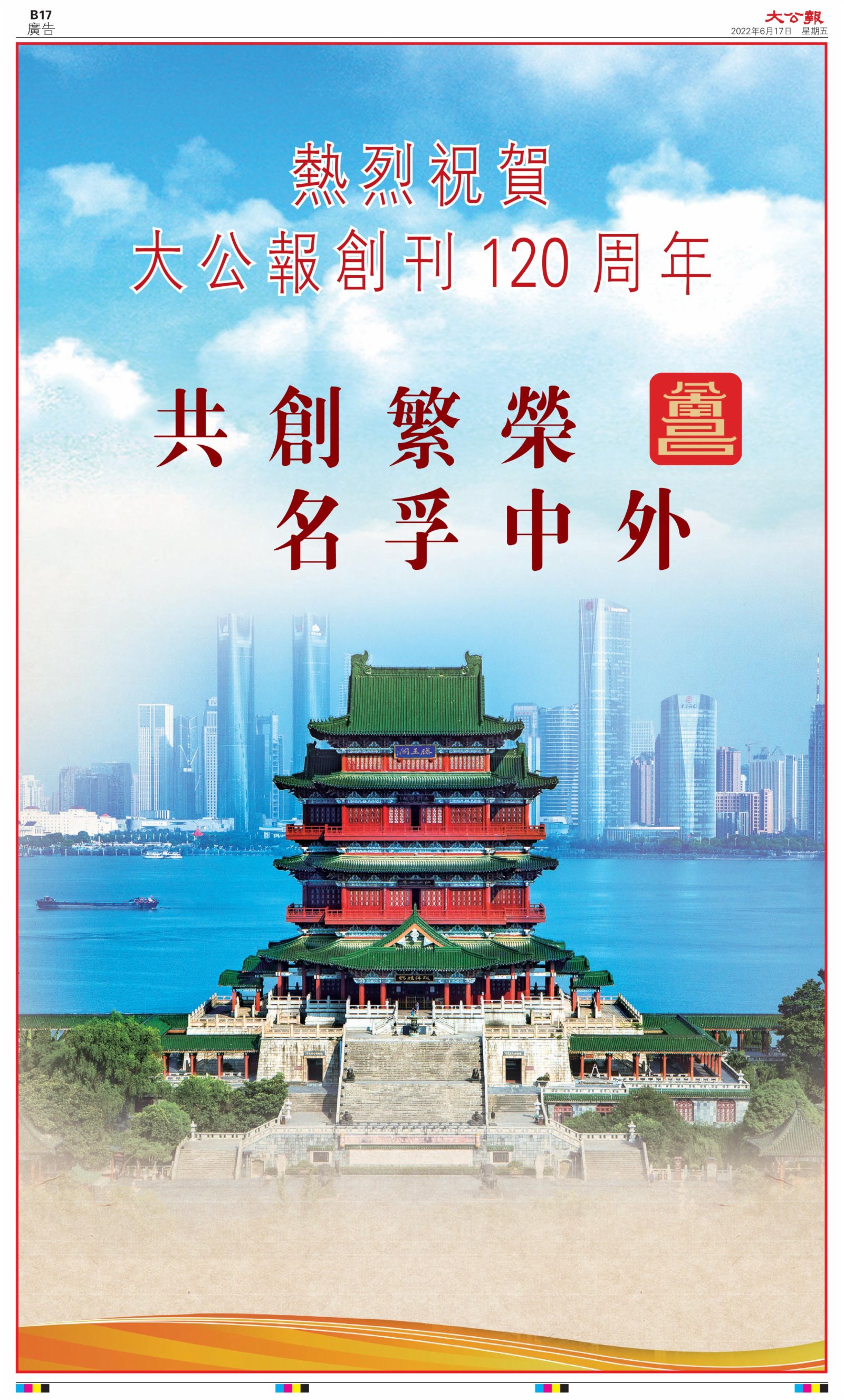 2022年6月17日是《大公報》創刊120周年紀念日,香港工商界、政黨、社團、協會、僑界、教育界、個人,及內地央企、內地企業、內地政府機構,澳門工商界,紛紛在《大公報》刊登廣告,共計100個版面,熱烈祝賀《大公報》創刊120周年。