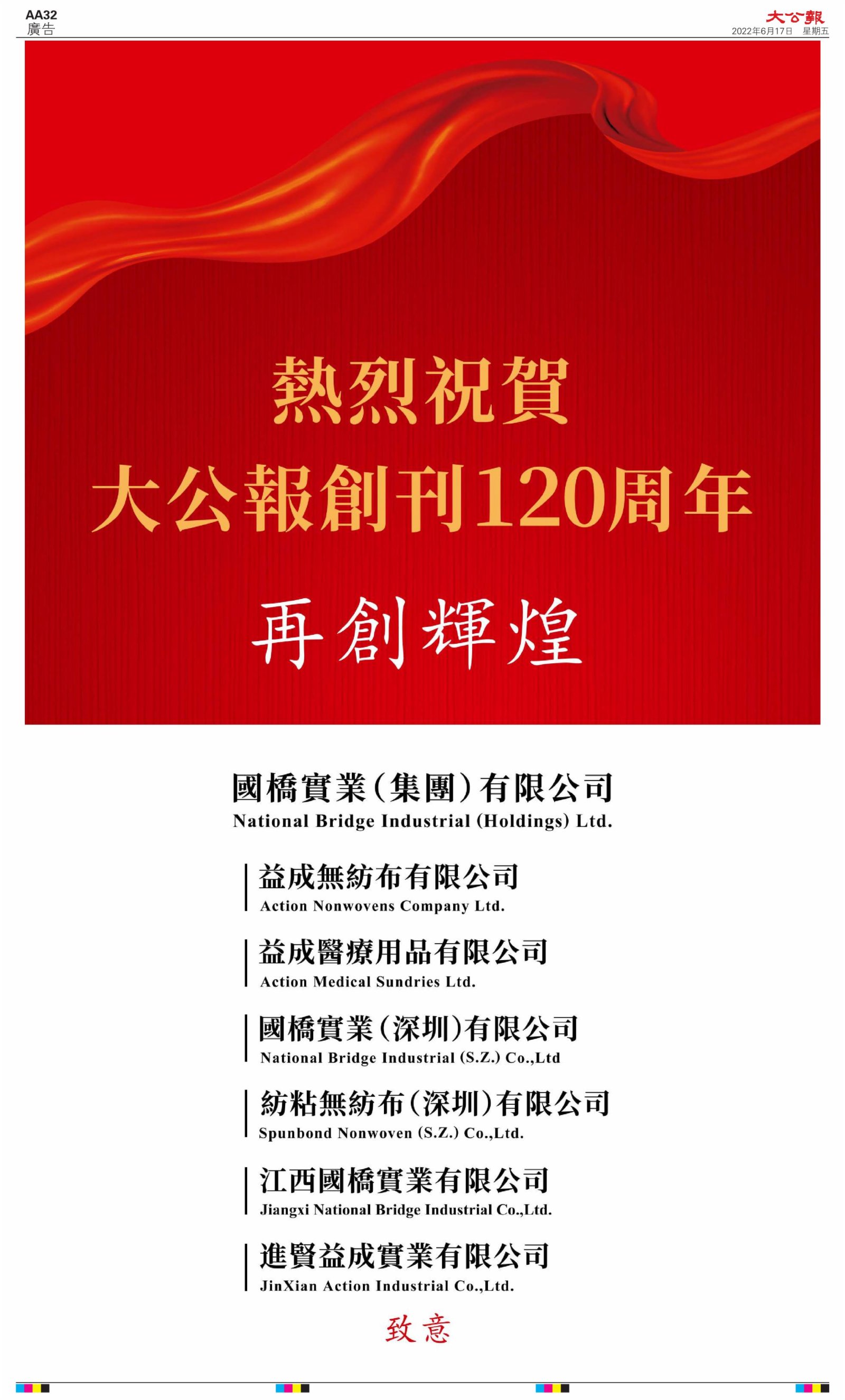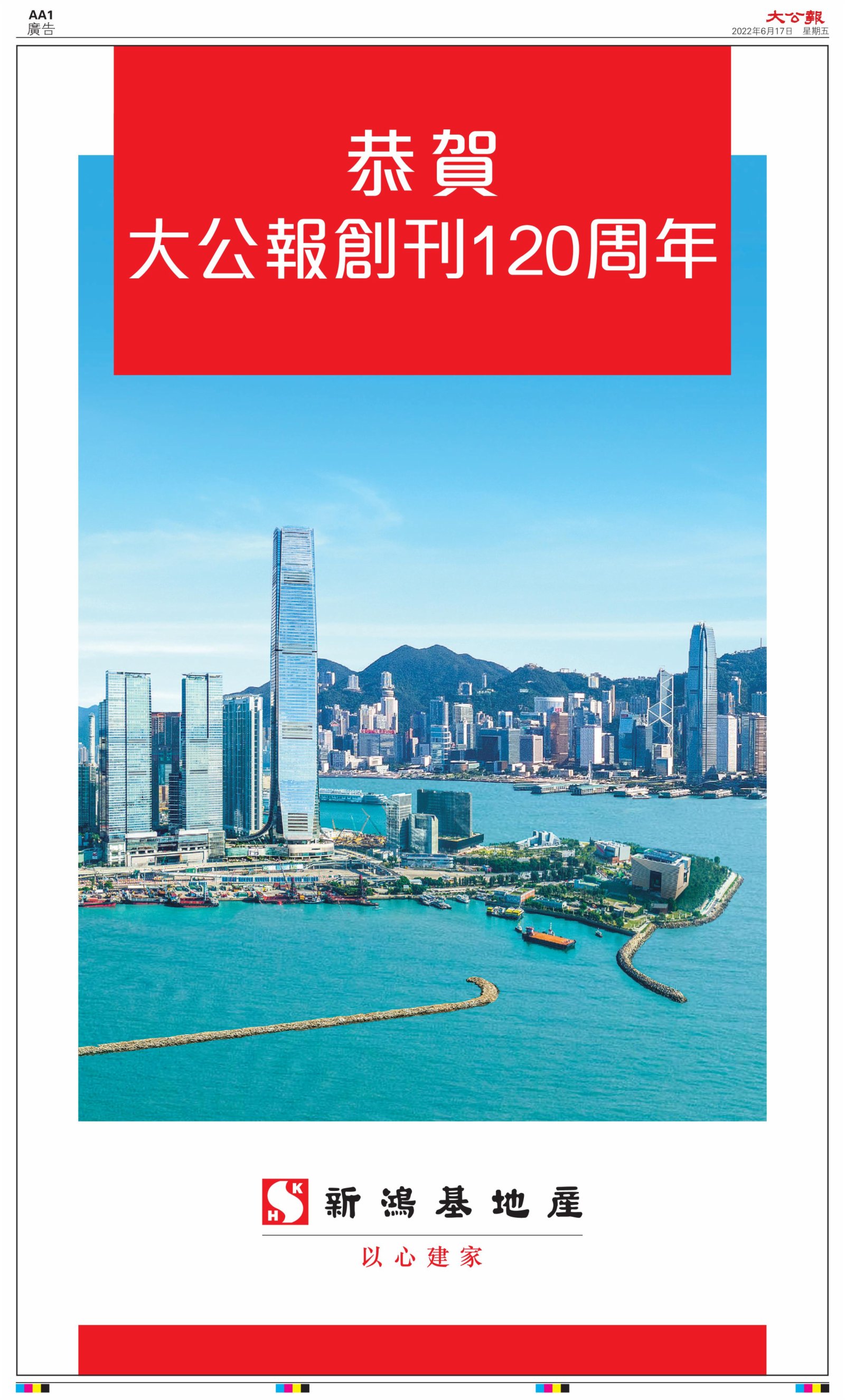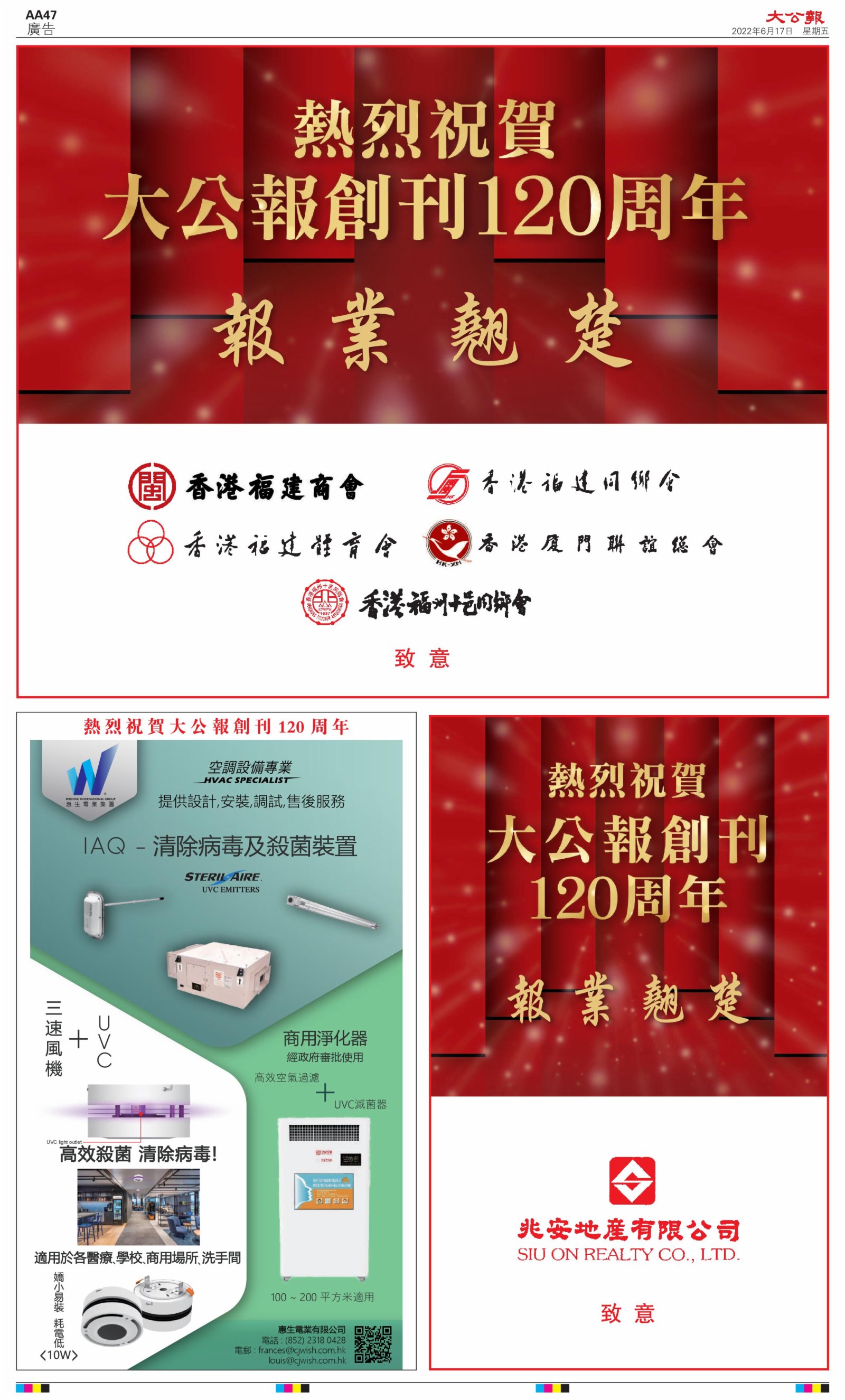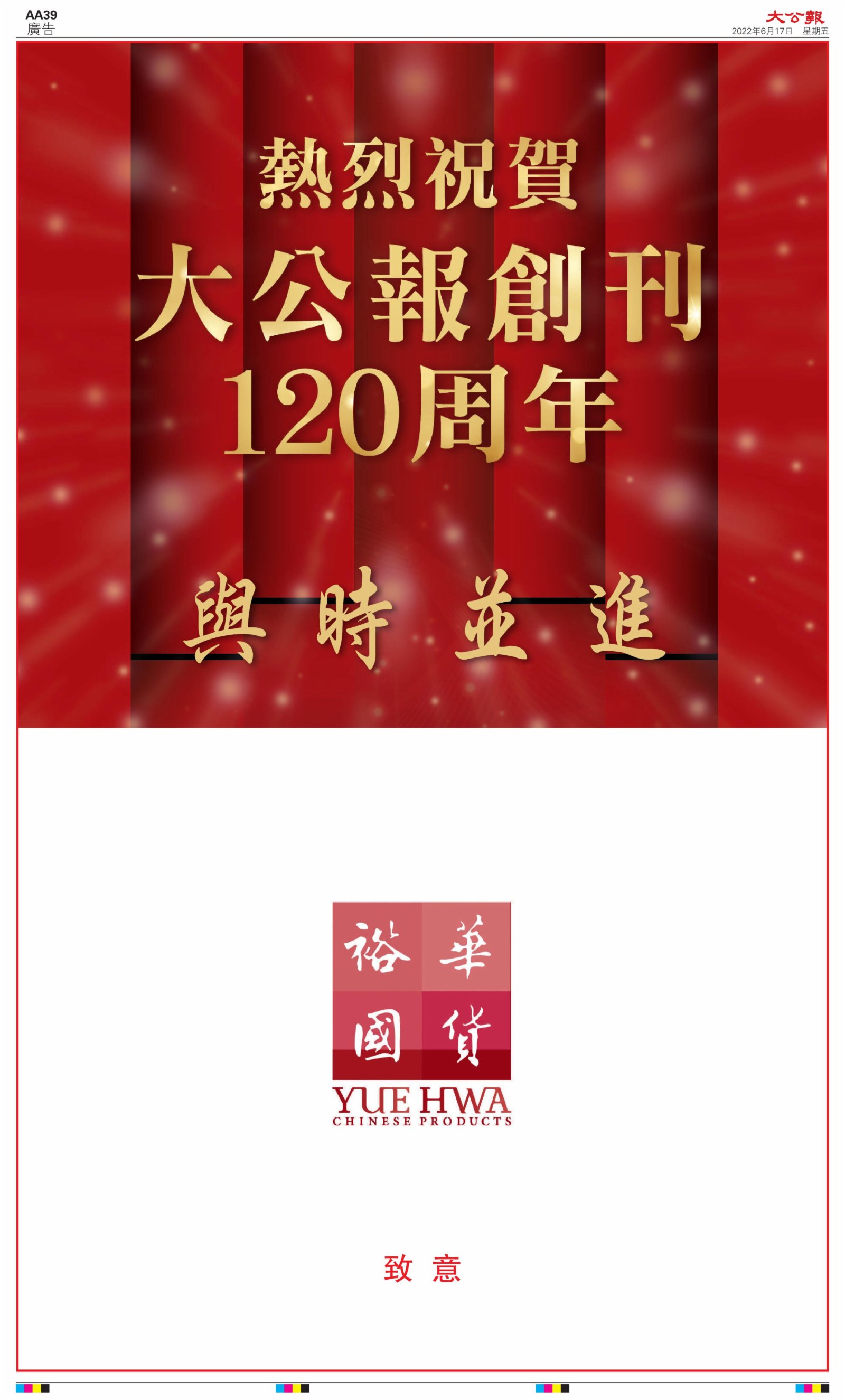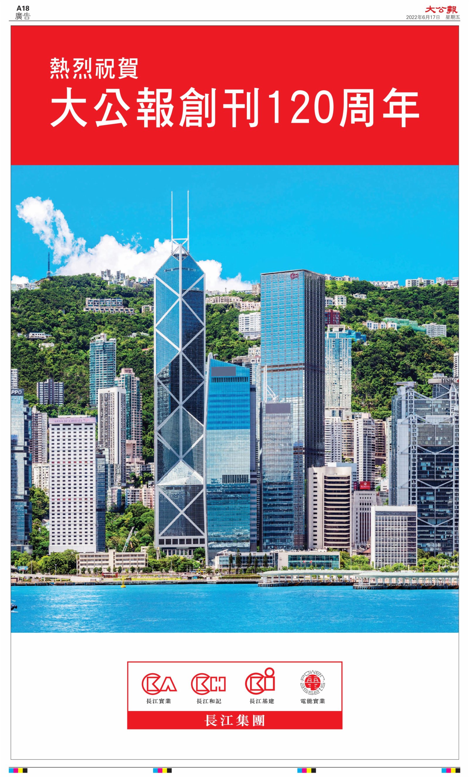 2022年6月17日是《大公報》創刊120周年紀念日,香港工商界、政黨、社團、協會、僑界、教育界、個人,及內地央企、內地企業、內地政府機構,澳門工商界,紛紛在《大公報》刊登廣告,共計100個版面,熱烈祝賀《大公報》創刊120周年。