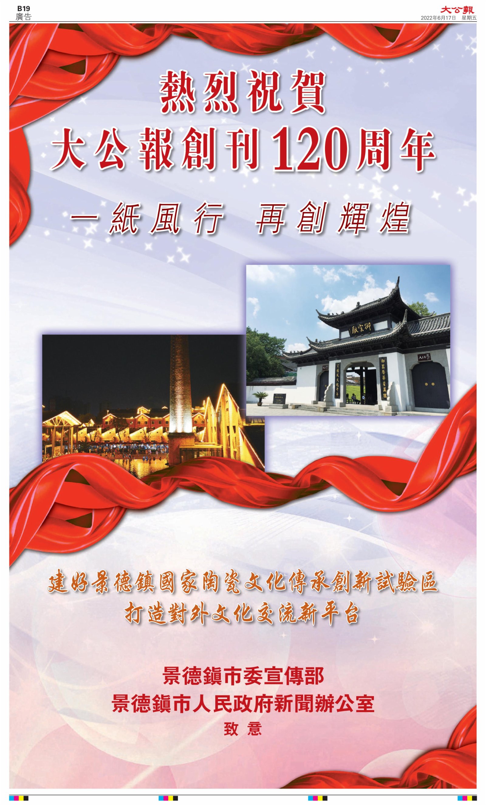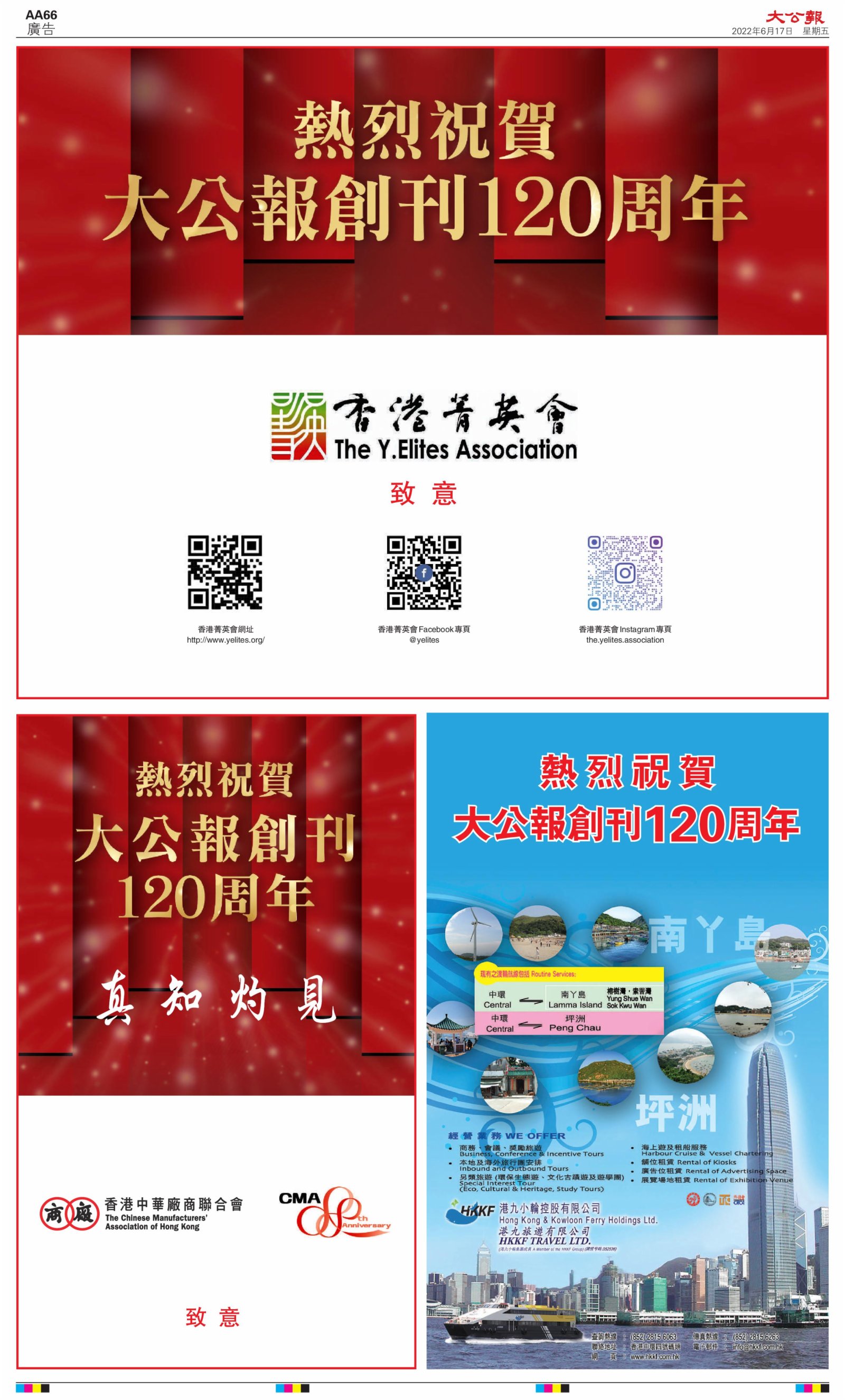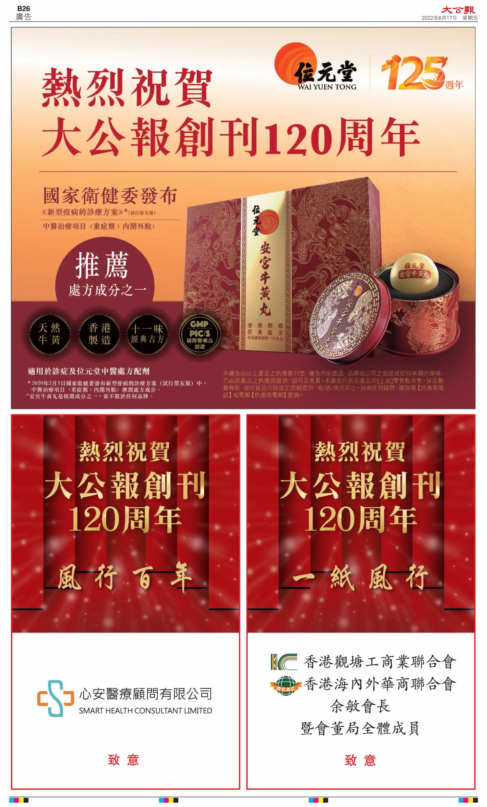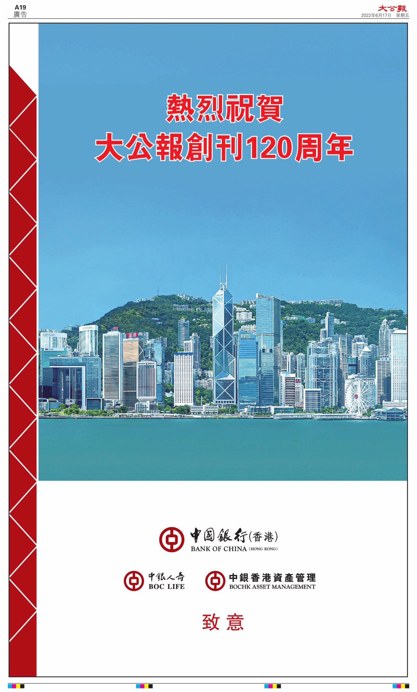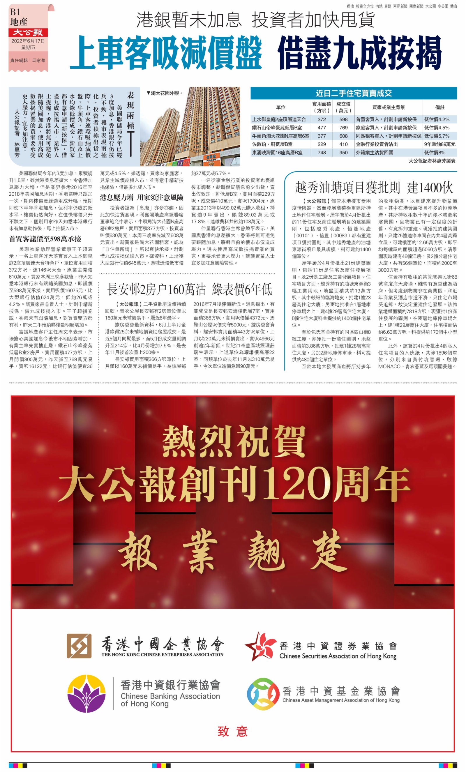 2022年6月17日是《大公報》創刊120周年紀念日,香港工商界、政黨、社團、協會、僑界、教育界、個人,及內地央企、內地企業、內地政府機構,澳門工商界,紛紛在《大公報》刊登廣告,共計100個版面,熱烈祝賀《大公報》創刊120周年。