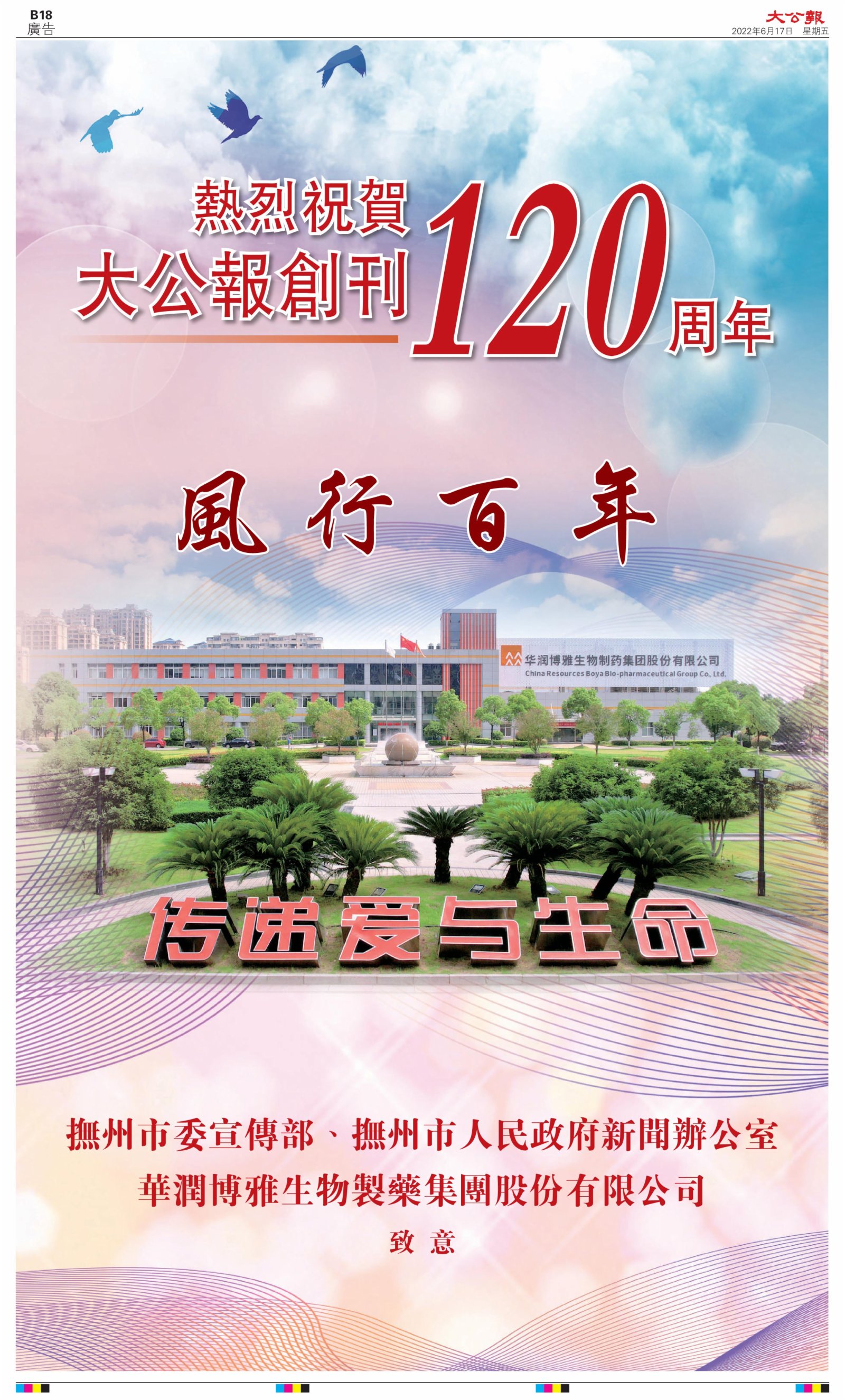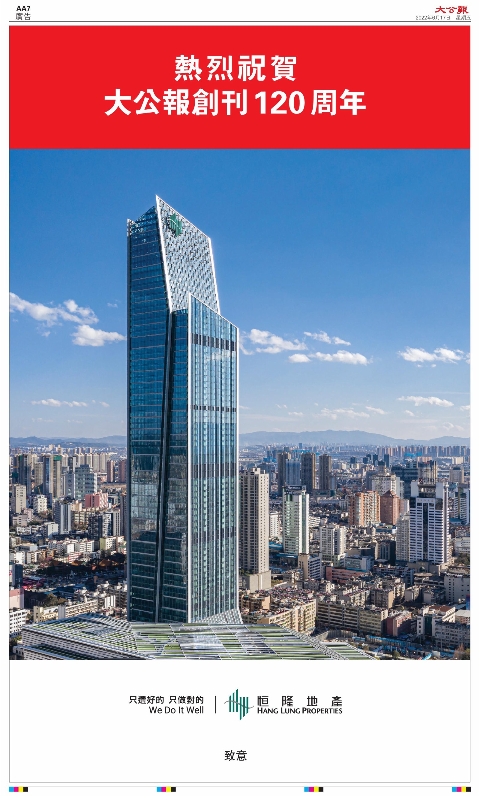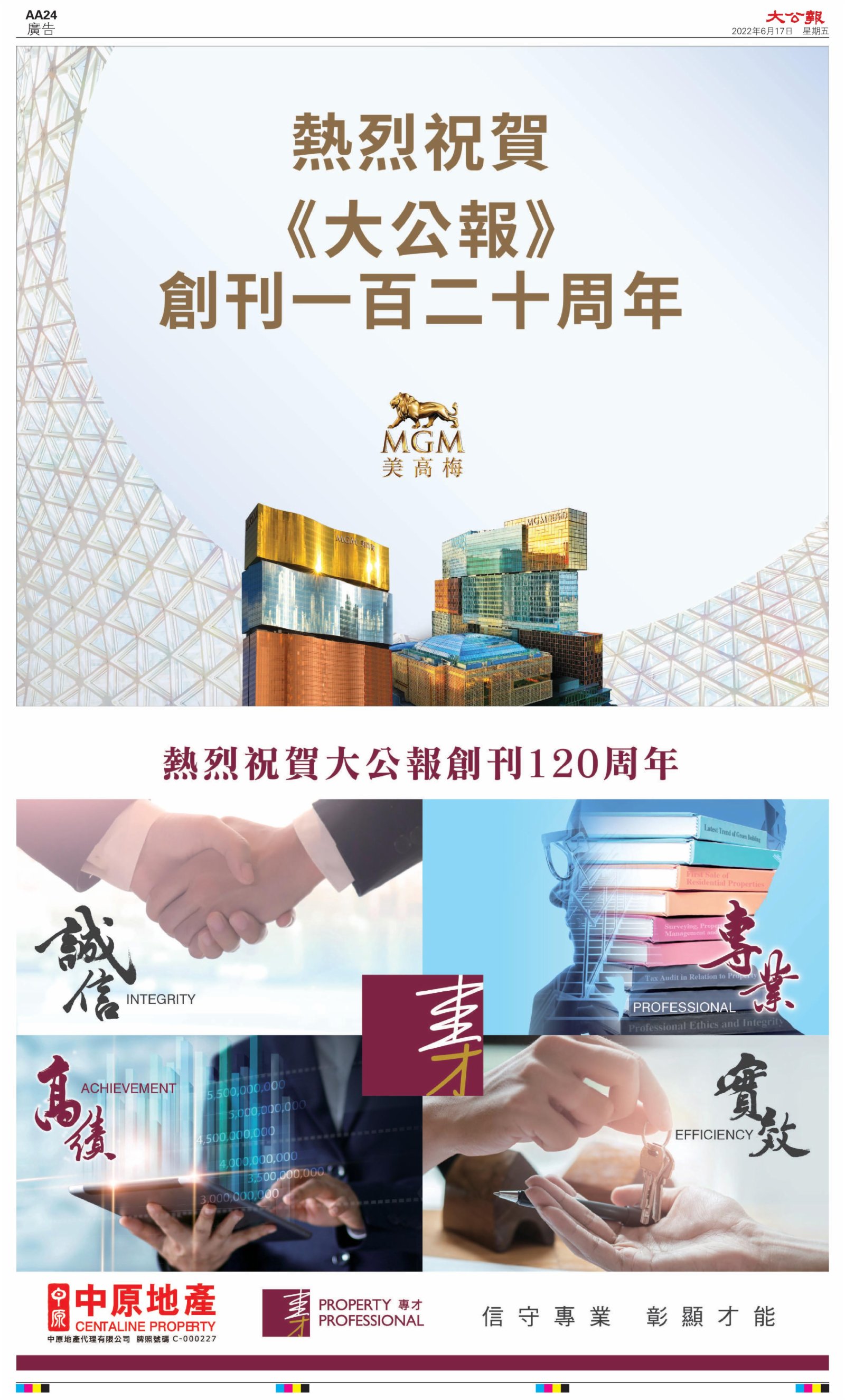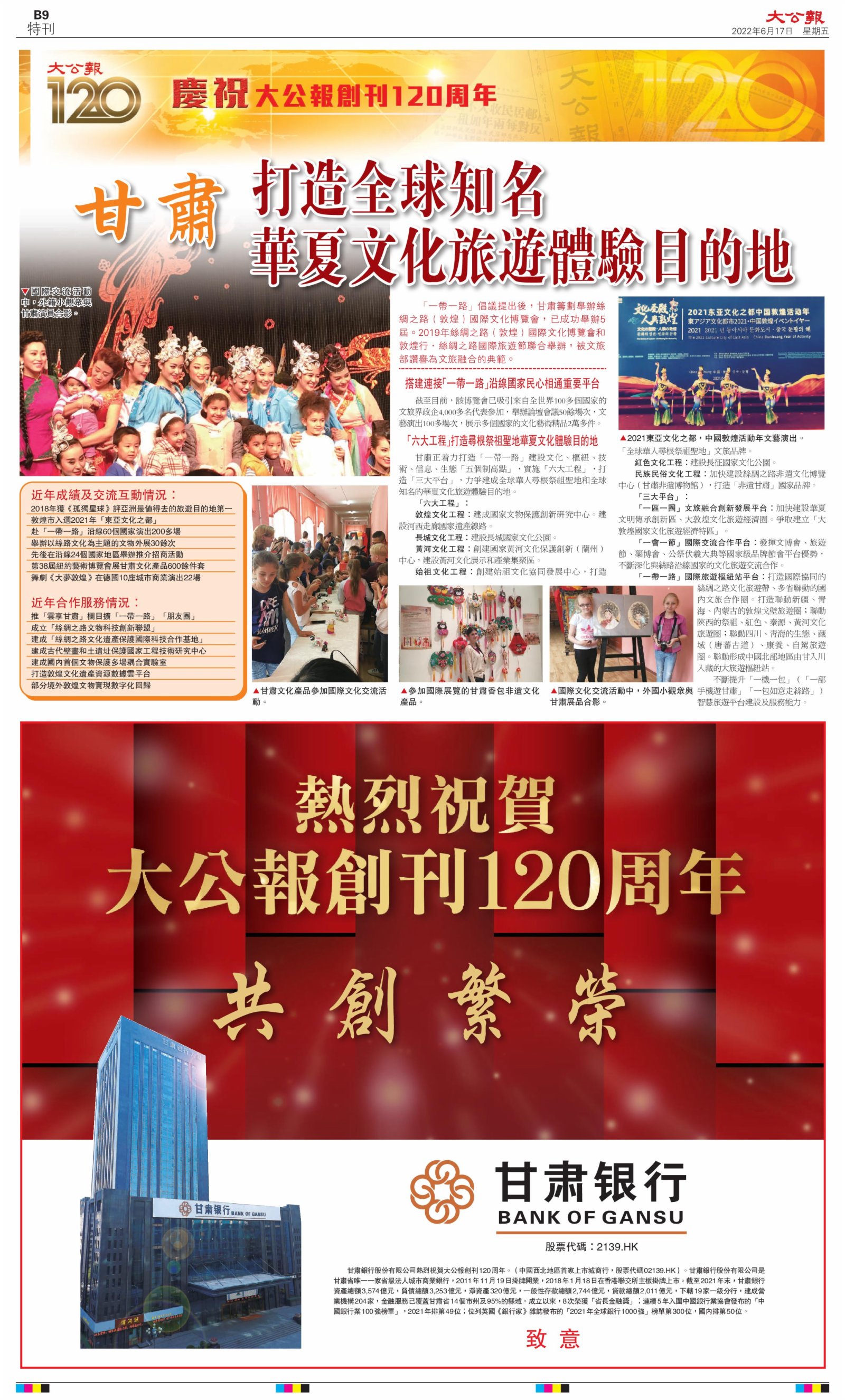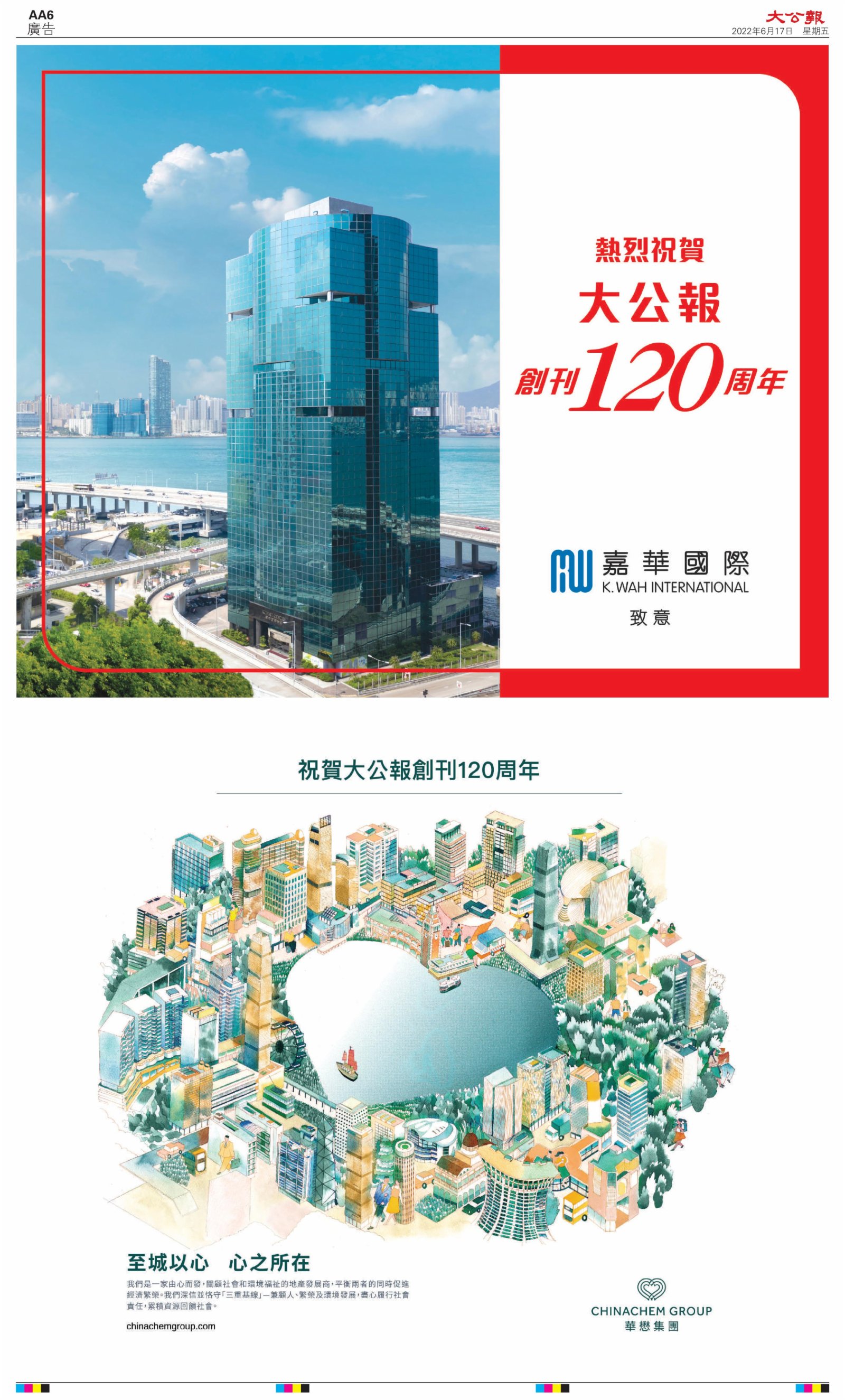 2022年6月17日是《大公報》創刊120周年紀念日,香港工商界、政黨、社團、協會、僑界、教育界、個人,及內地央企、內地企業、內地政府機構,澳門工商界,紛紛在《大公報》刊登廣告,共計100個版面,熱烈祝賀《大公報》創刊120周年。