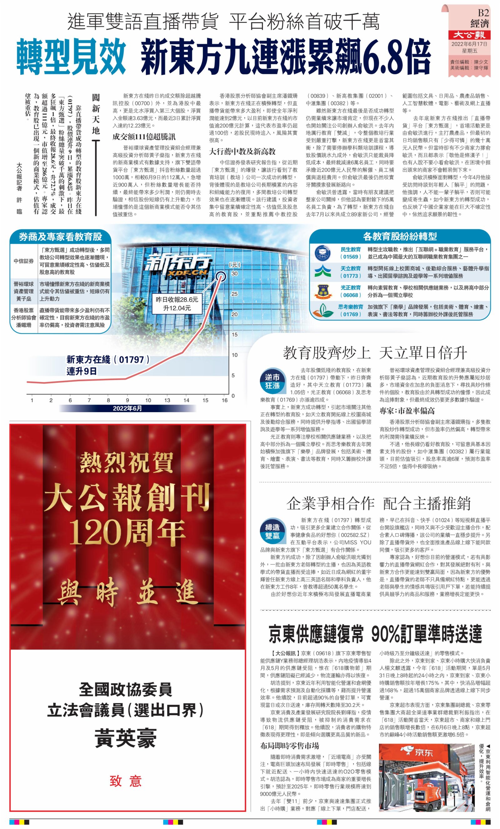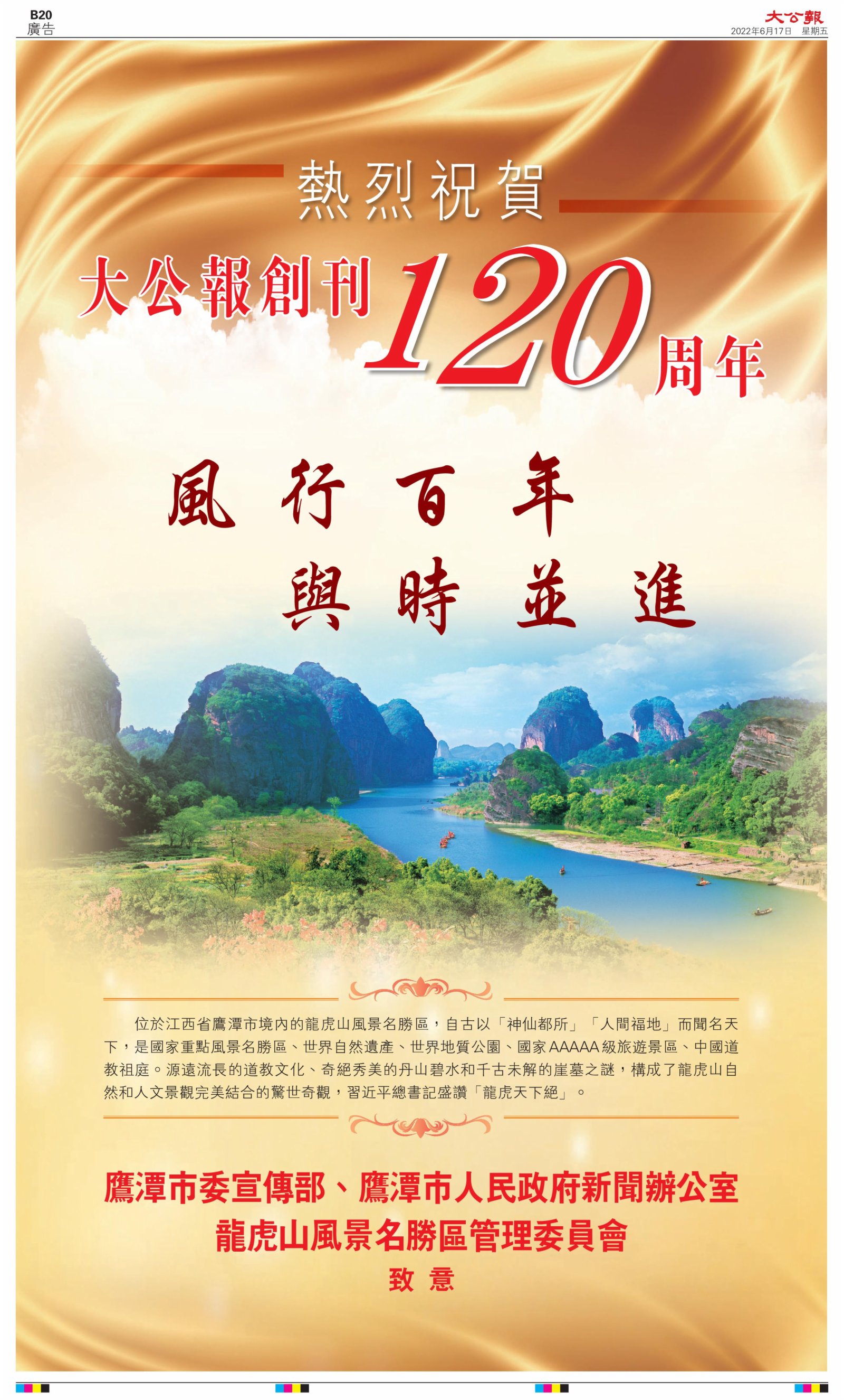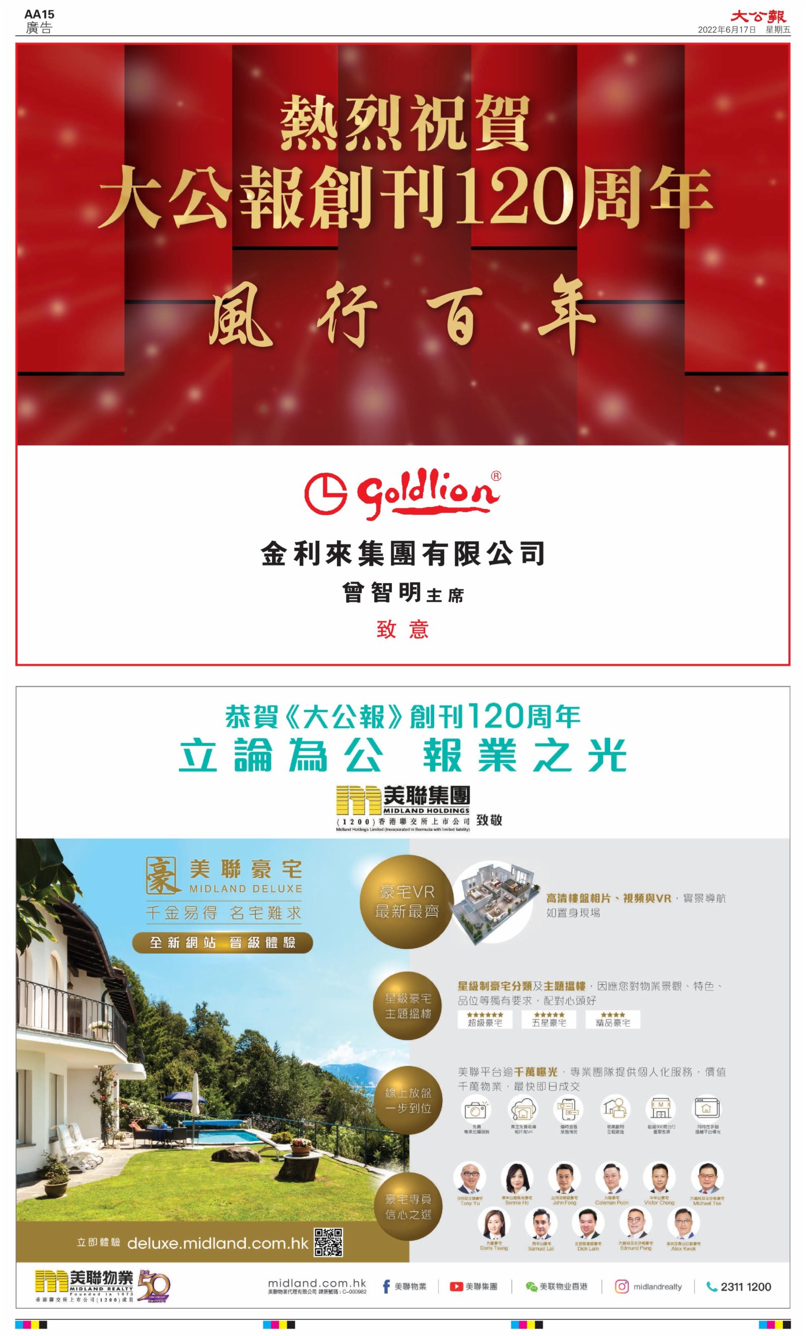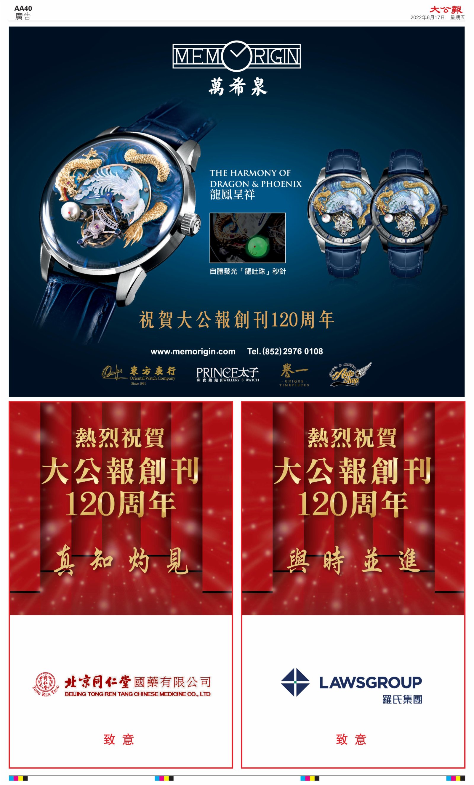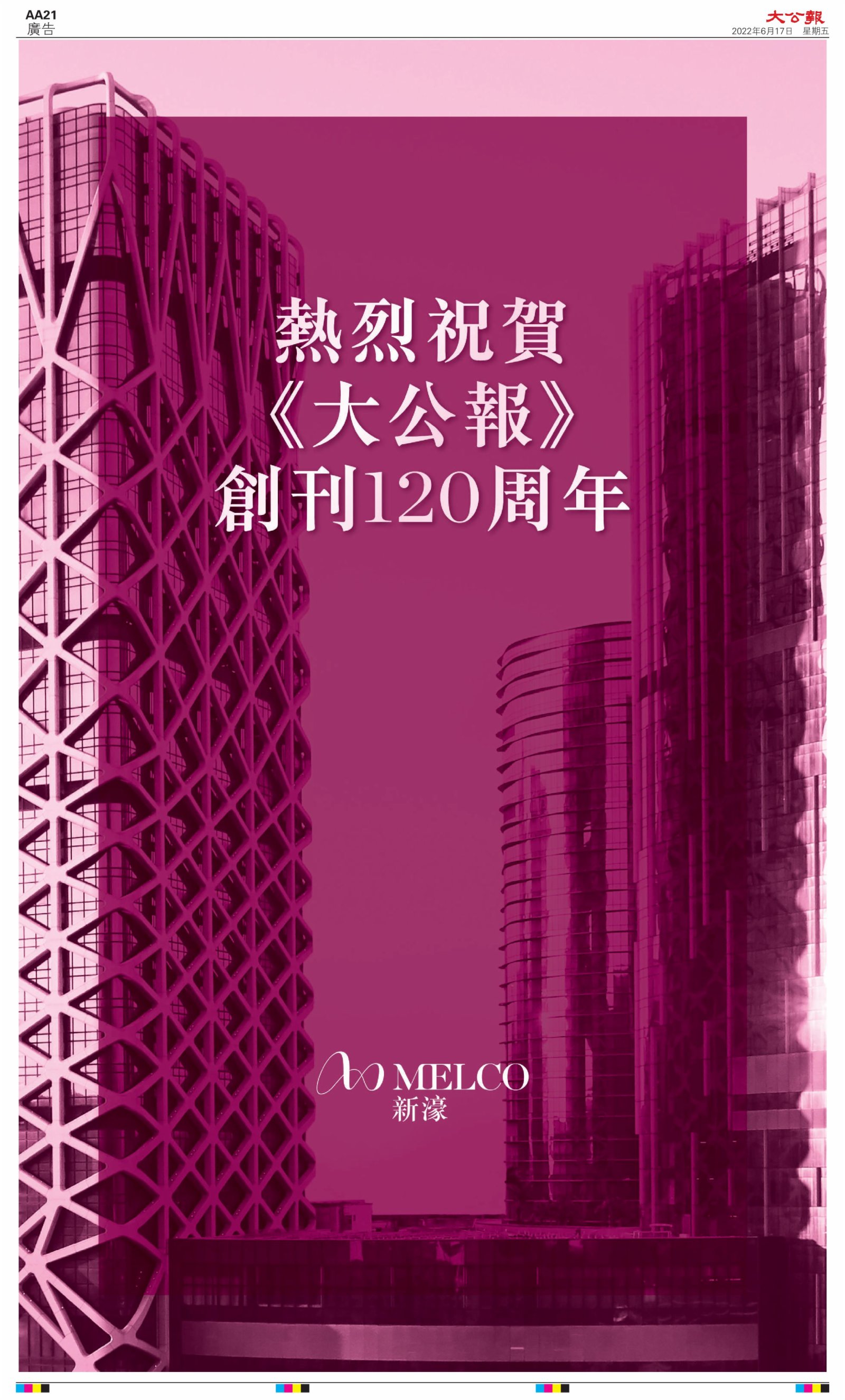 2022年6月17日是《大公報》創刊120周年紀念日,香港工商界、政黨、社團、協會、僑界、教育界、個人,及內地央企、內地企業、內地政府機構,澳門工商界,紛紛在《大公報》刊登廣告,共計100個版面,熱烈祝賀《大公報》創刊120周年。