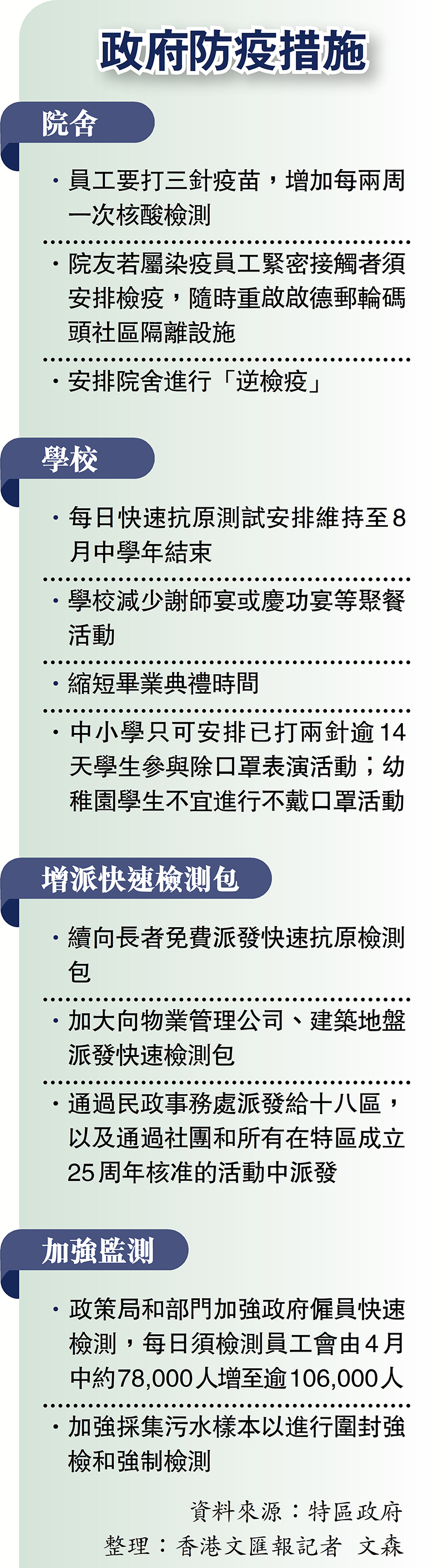 公務員事務局局長聶德權在Facebook發帖表示,為盡早阻截隱形傳播鏈,已要求政策局和各部門加強政府僱員的快速檢測,每日須檢測員工人數會由4月中約7.8萬人增至超過10.6萬人,佔政府僱員人數60%,另有超過3.5萬人需定期按風險進行快測。