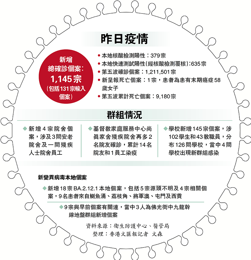 (香港文匯報記者 文森)香港特區政府衞生署衞生防護中心呈報,香港昨日新增1,145宗新冠肺炎確診個案,連續三天破千宗,而院舍、學校等再爆發多個群組,另新增18宗Omicron BA.2.12.1變異病毒本地個案,患者遍布各區,病毒基因分析顯示5間爆疫酒吧的病毒相似,相信屬同一病源。香港特區行政長官林鄭月娥昨日直言,疫情有反彈跡象,故公布將採取多項措施加強防疫,包括院舍員工稍後須接種三劑疫苗,且除每日快速測試外,更要每兩周進行一次核酸採樣檢測,同時會增加政府僱員的快速抗原檢測涵蓋人數和頻率,以期盡早阻截隱形傳播鏈。有專家認為,變異病毒已擴散至各區,必須加強個案追蹤速度及監控酒吧等高危處所,否則變異病毒持續在社區擴散,有可能爆發第六波疫情。