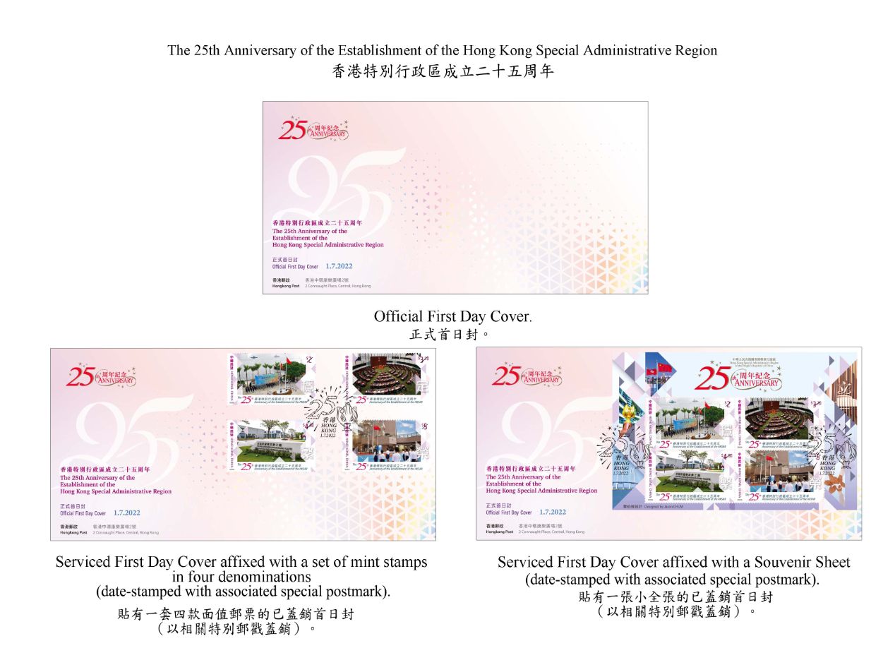 2022年是香港特別行政區成立25周年,香港郵政發行一套4枚紀念郵票、1張小全張和相關集郵品,以資紀念。郵票展示在實施香港國安法及完善選舉制度後的香港,回到「一國兩制」的正確軌道,以維持長期繁榮穩定。這兩項重要舉措維護國家的主權、安全和發展利益,確保「一國兩制」行穩致遠。同時,郵票亦帶出教育學生國民身份認同,以及在國家「十四五」規劃綱要和粵港澳大灣區建設帶動下,香港將更積極融入國家發展大局,在未來數十年為年輕人和企業帶來龐大的發展機遇。