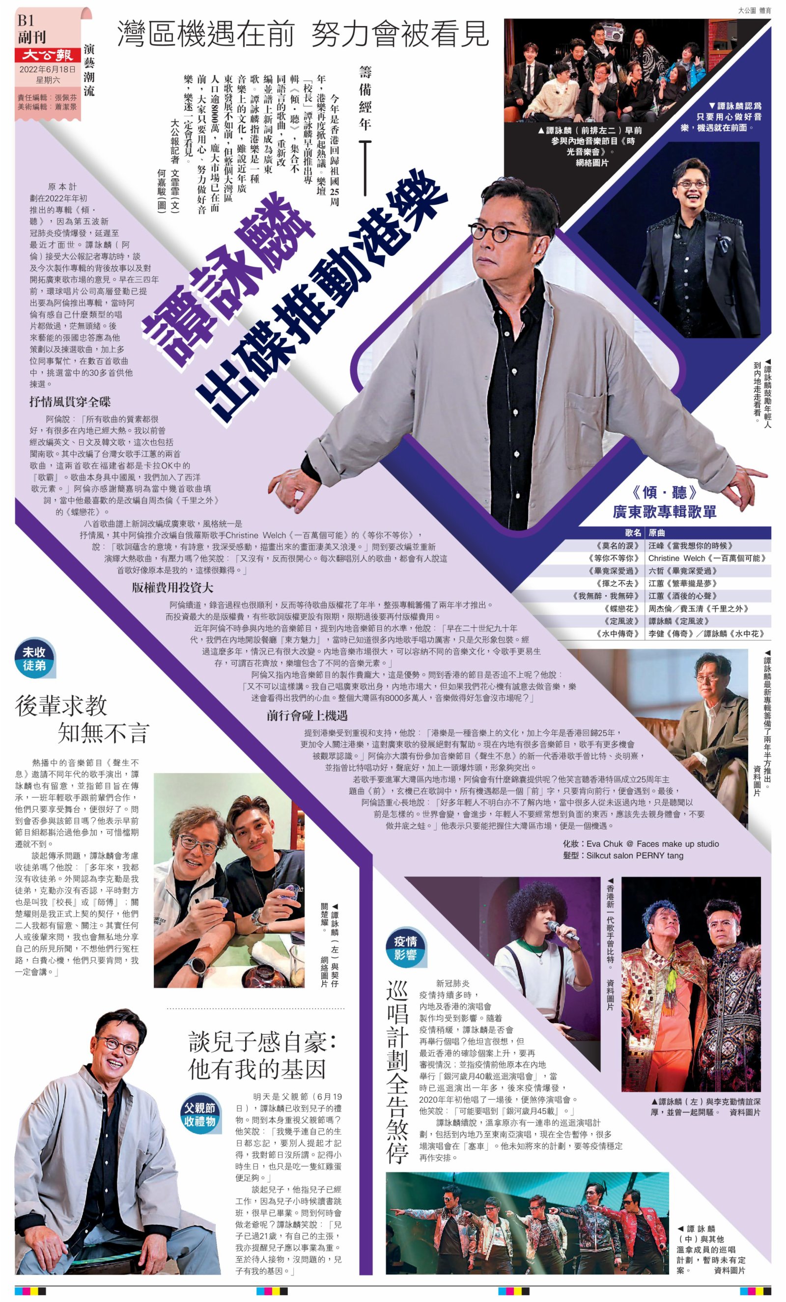 新冠肺炎疫情持續多時,內地及香港的演唱會製作均受到影響。隨着疫情稍緩,譚詠麟是否會再舉行個唱?他坦言很想,但最近香港的確診個案上升,要再審視情況;並指疫情前他原本在內地舉行「銀河歲月40載巡迴演唱會」,當時已巡迴演出一年多,後來疫情爆發,2020年年初他唱了一場後,便煞停演唱會。他笑說:「可能要唱到『銀河歲月45載』。」