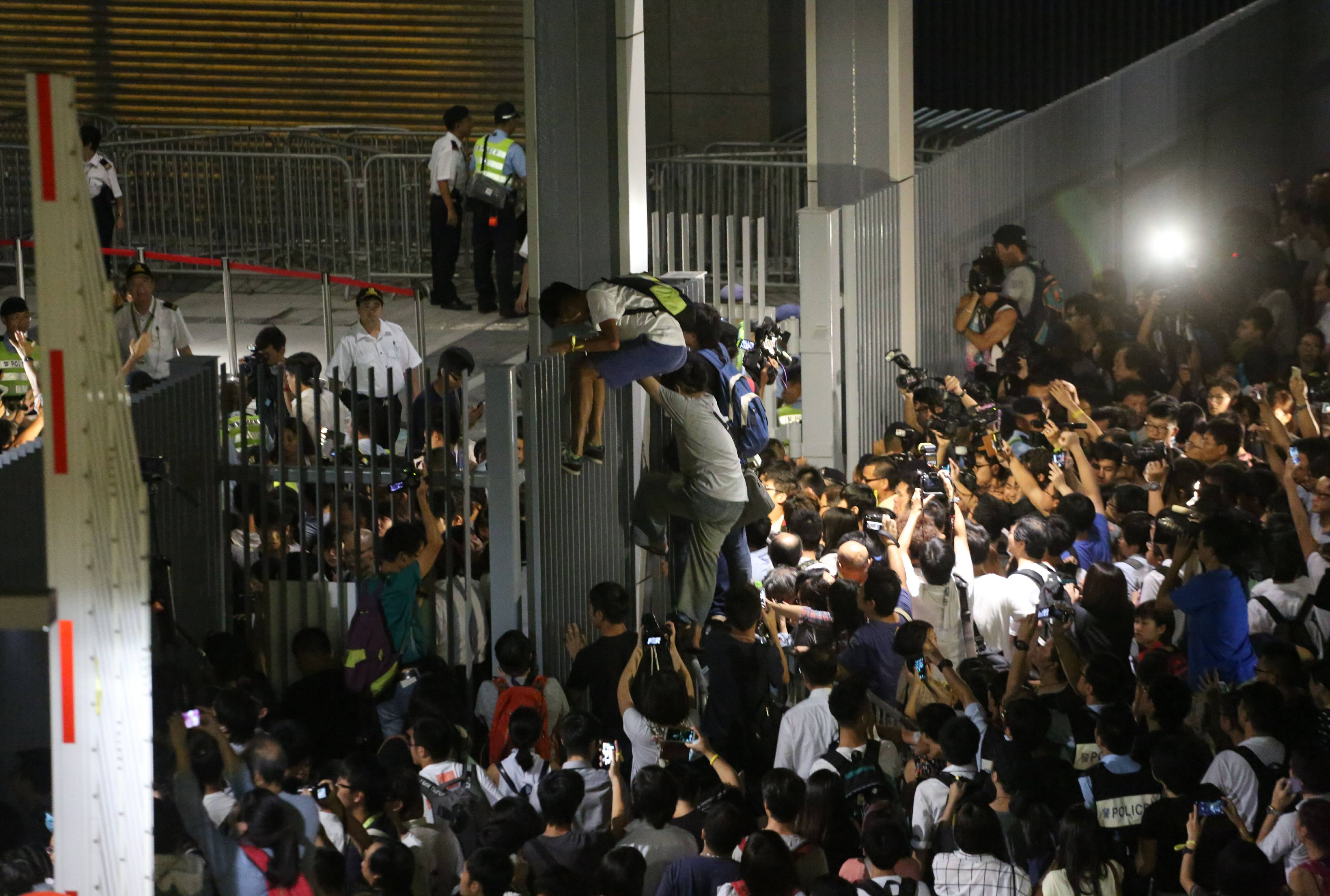 2014年9月26日晚上10時許,罷課集會結束後,「學聯」和「學民思潮」突然發動所謂的重奪「公民廣場」行動,亂港分子黃之鋒、周永康、岑敖暉等近百名示威者,強行推開立法會停車場出入口欄桿,再攀過圍欄,衝入政府總部東翼迴旋處,另有約100名示威者衝擊立法會綜合大樓旁的通道。警方增援,並向示威者噴射胡椒噴霧以控制場面。