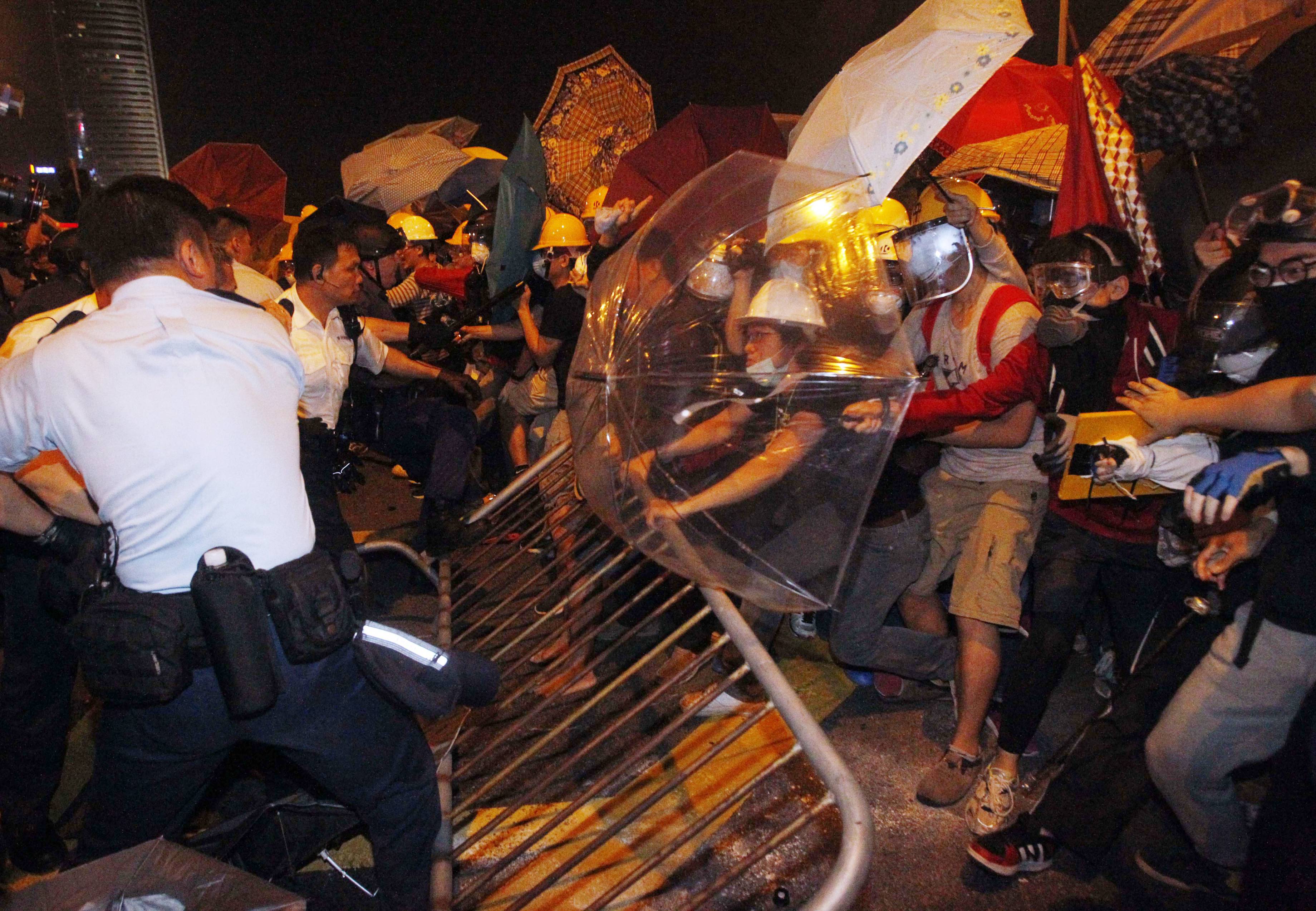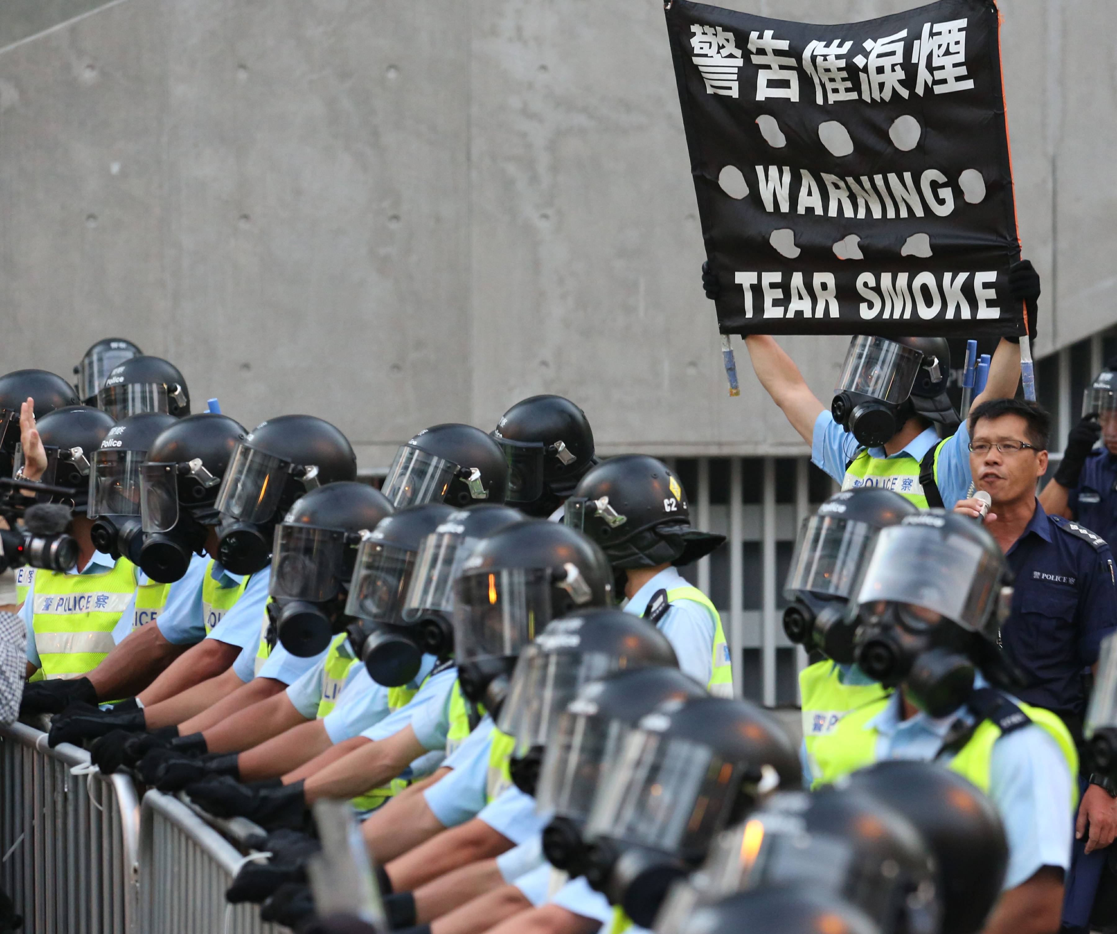 特首梁振英於下午舉行記者會,批評「佔中」癱瘓香港核心地區運作,是違法的脅迫行為。惟示威者依然選擇將行動升級,以暴力衝擊警方防線。警方舉起「黑底白字」的「警告催淚煙」旗幟,在多次警告無效後,施放催淚彈以制止罔顧公共安全及公共秩序的行為。