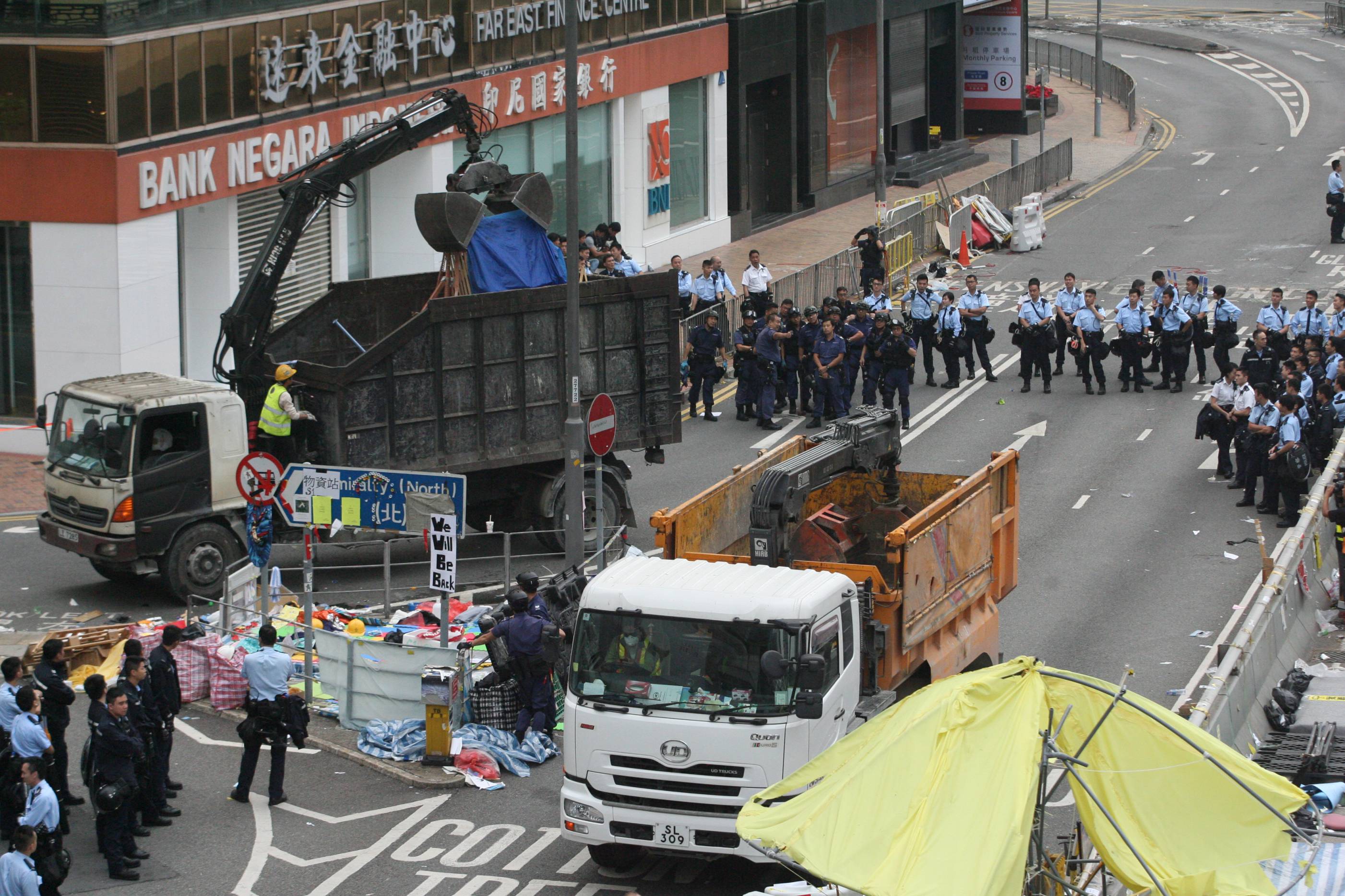 12月11日下午1時半,警方向在馬路上的「佔領」者發出最後通牒,要求在場者在30分鐘內離開,惟未獲理會。警方遂展開清場行動,歷時7個多小時,動用7000多警力,前後清拆35個大型路障及堆積如山的「佔領」物資,合共拘捕209人。被非法「佔領」達75天的中區主幹線夏慤道於晚上恢復通車。