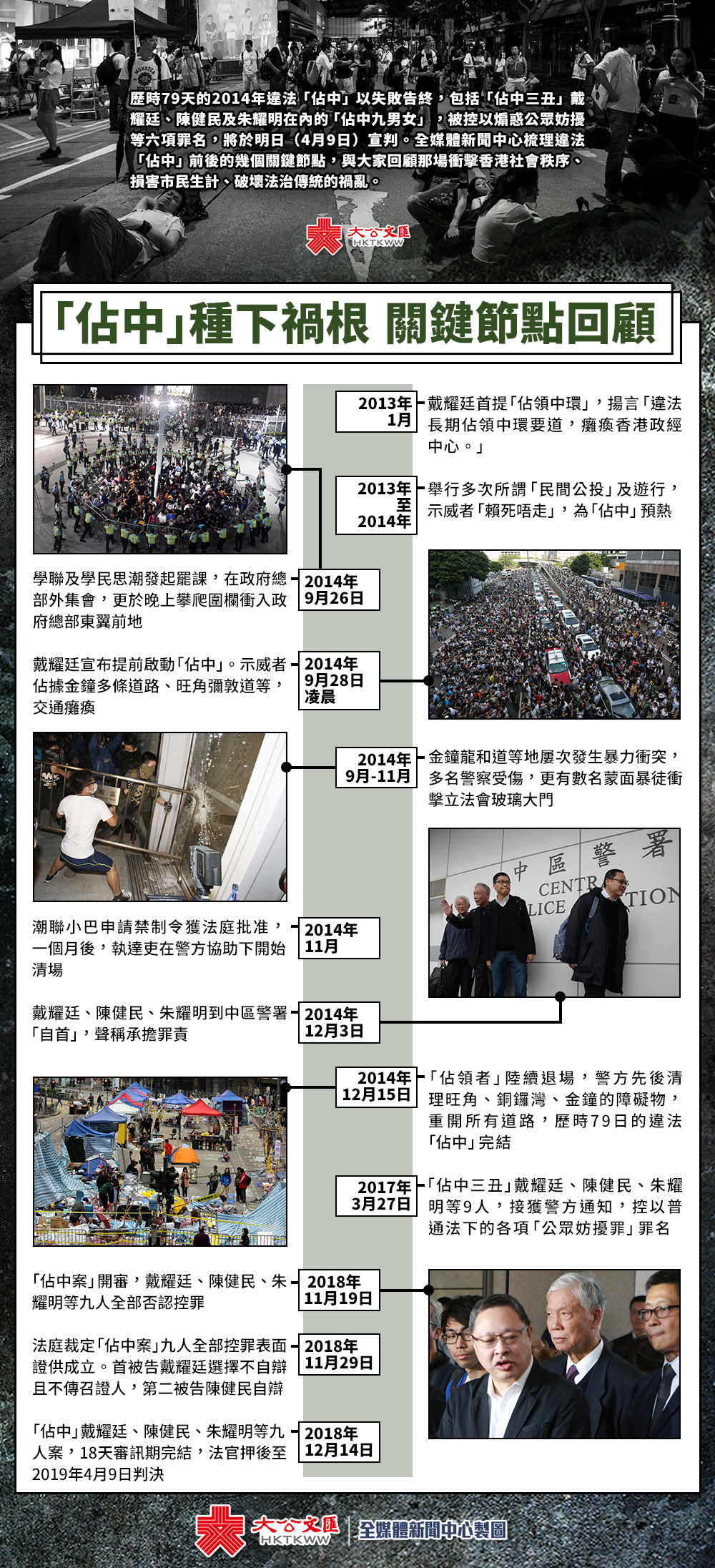 2019年,涉及串謀犯公眾妨擾罪、煽惑他人犯公眾妨擾罪、煽惑他人煽惑公眾妨擾罪的「佔中九丑」陸續獲得判刑,並各有罪名成立,須負上相應刑責。事實證明,所謂「公民抗命」、「違法達義」的口號不能成為「免責條款」,「佔中九丑」害人害己,終於付出相應的代價!