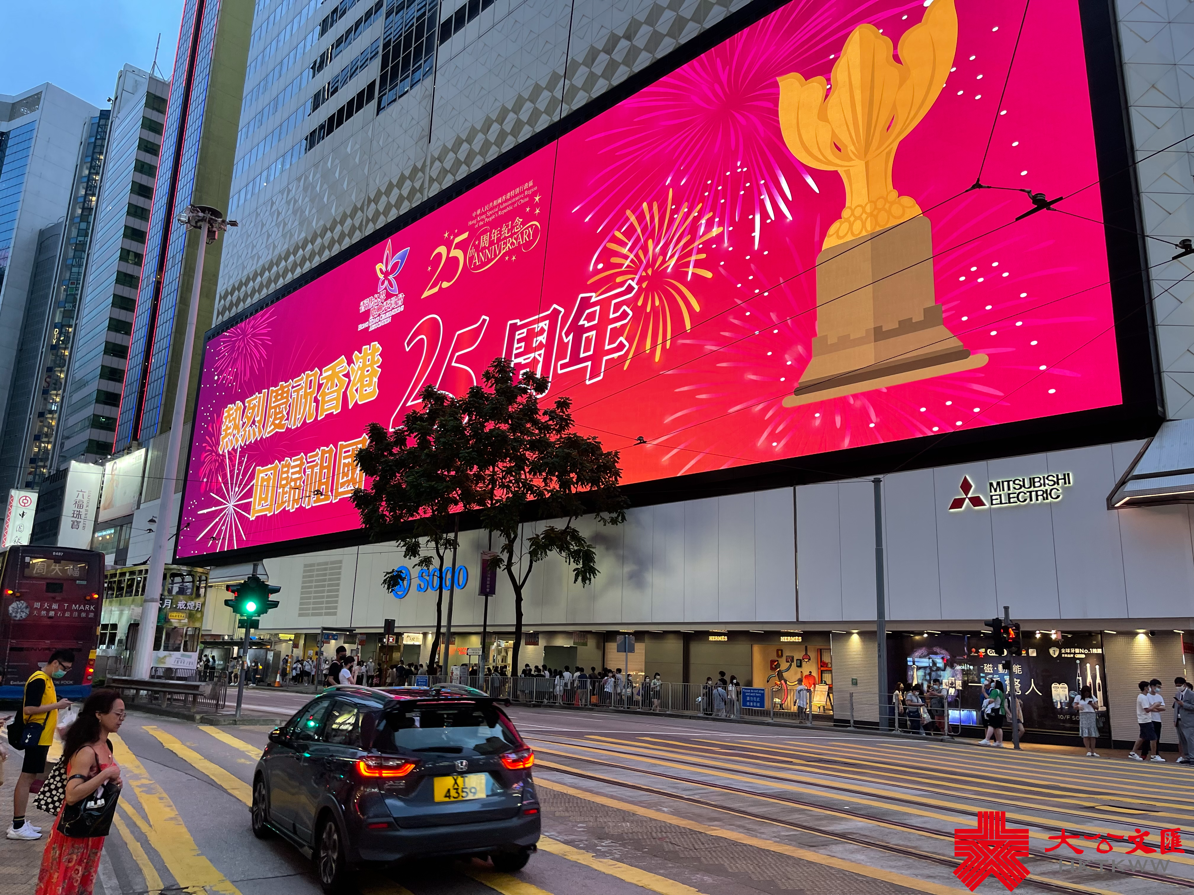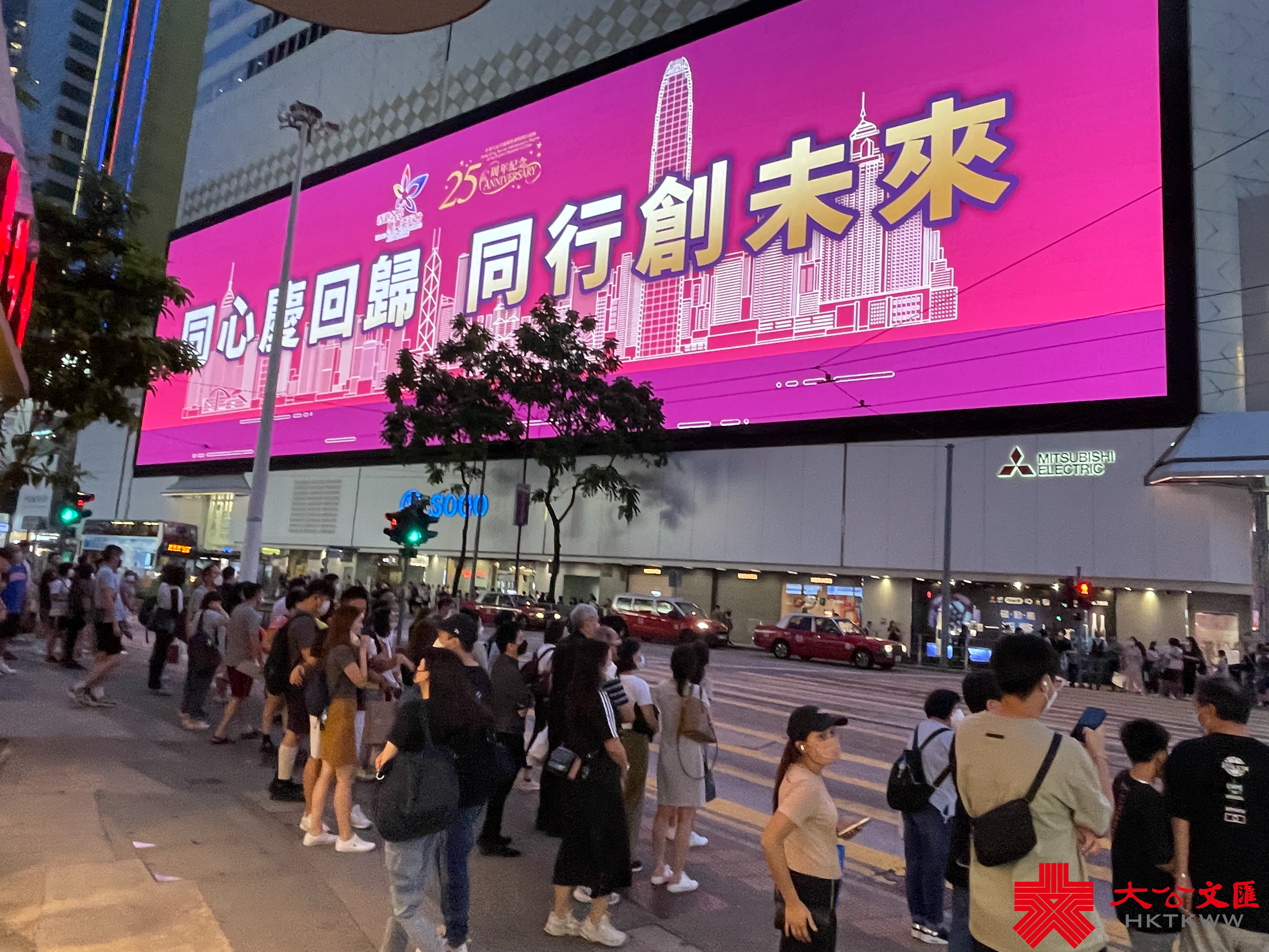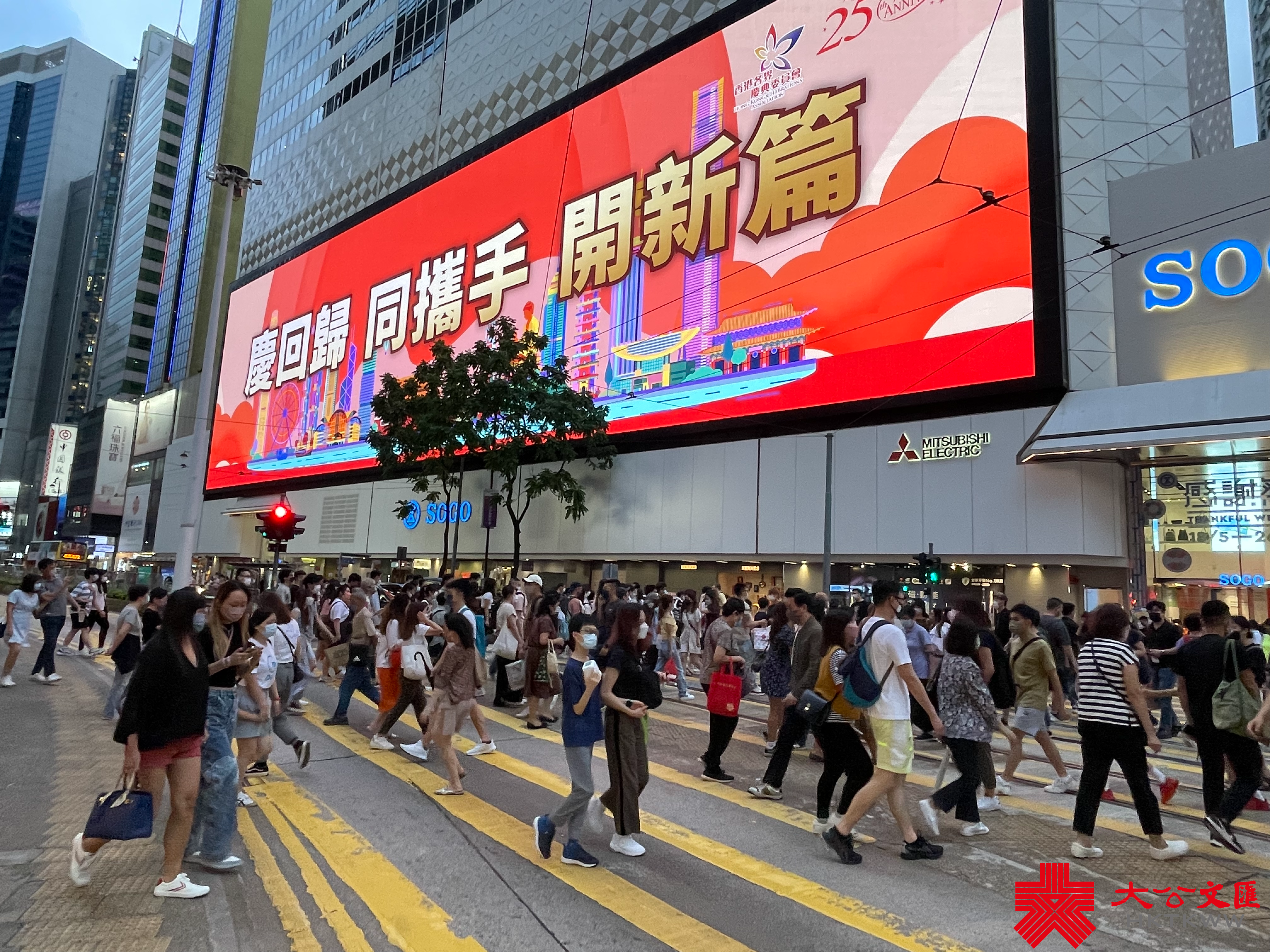 大公文匯全媒體報道,為慶祝香港回歸祖國25周年,本港各處都紛紛舉辦不同慶祝活動。近日,銅鑼灣SOGO商場大屏幕循環展示「同心慶回歸 同行創未來」、「慶回歸 同攜手 開新篇」、「同心慶回歸 同行創未來」等標語,慶祝香港回歸祖國25周年,寄語港人展望未來,開創新篇章。